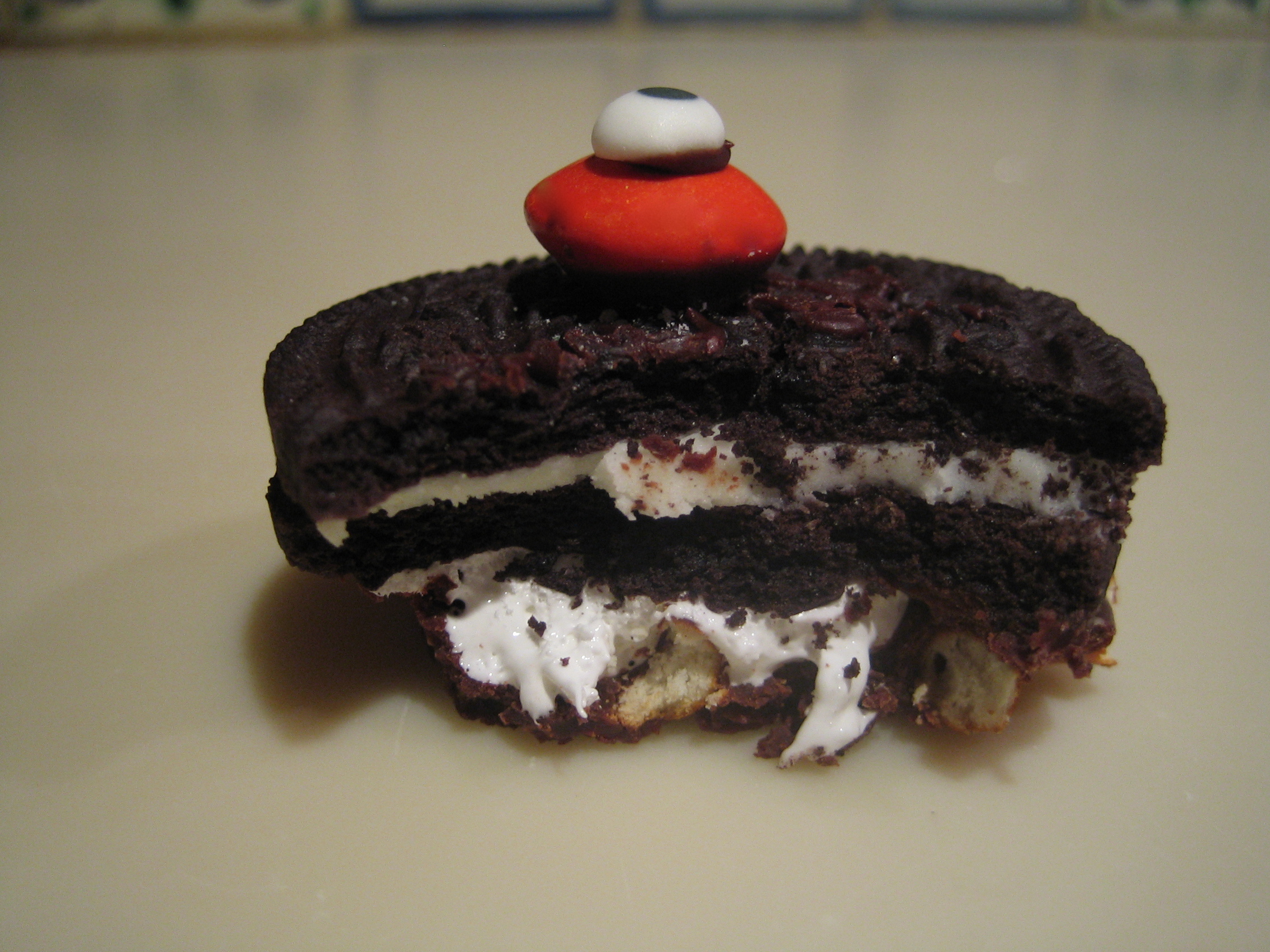 I made these predominantly because I thought they were cute. I was completely unprepared for how delicious they would taste. The soft creme in the now set up chocolate with the salty hint from the pretzel is total YUM. And, of course, there was Oreo in there, too.