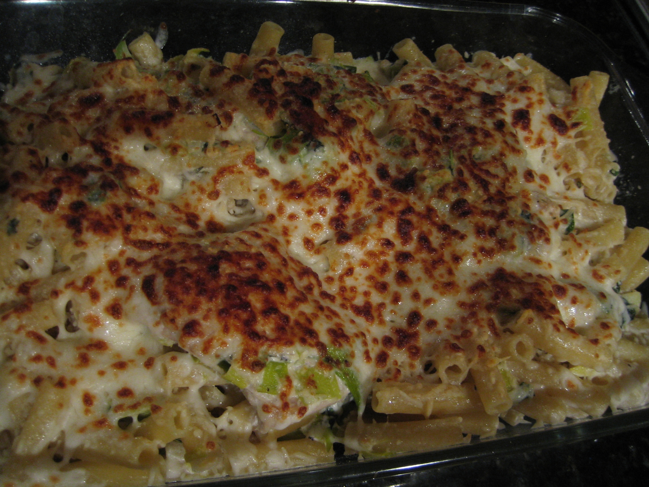 2. Cook pasta. Drain and add to chicken mixture. Stir well and place in a greased 13×9 baking dish. Top with cheeses and broil for about 3 minutes until golden.
