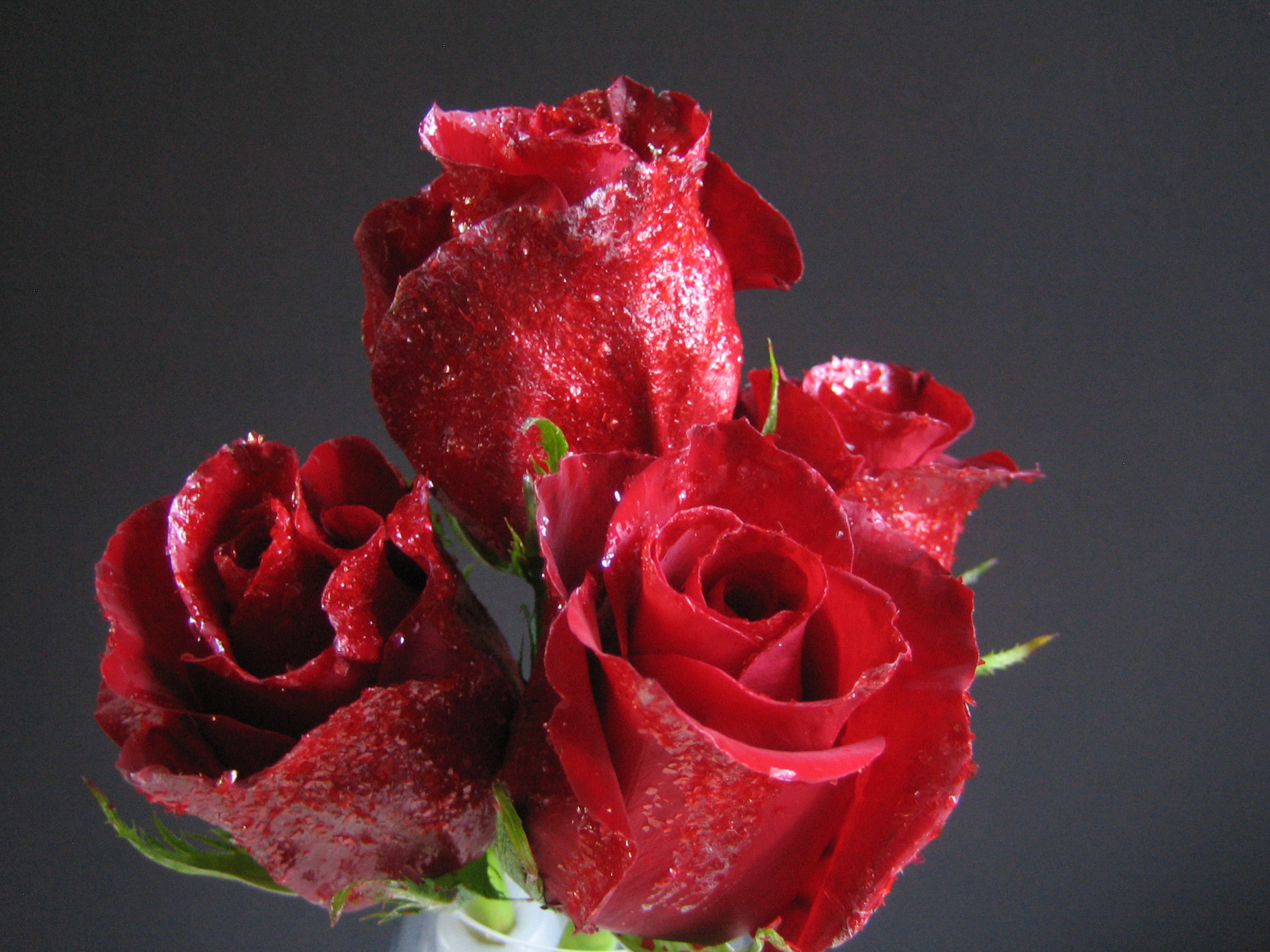 1. Lightly brush roses with egg white. Sprinkle with glitter.
