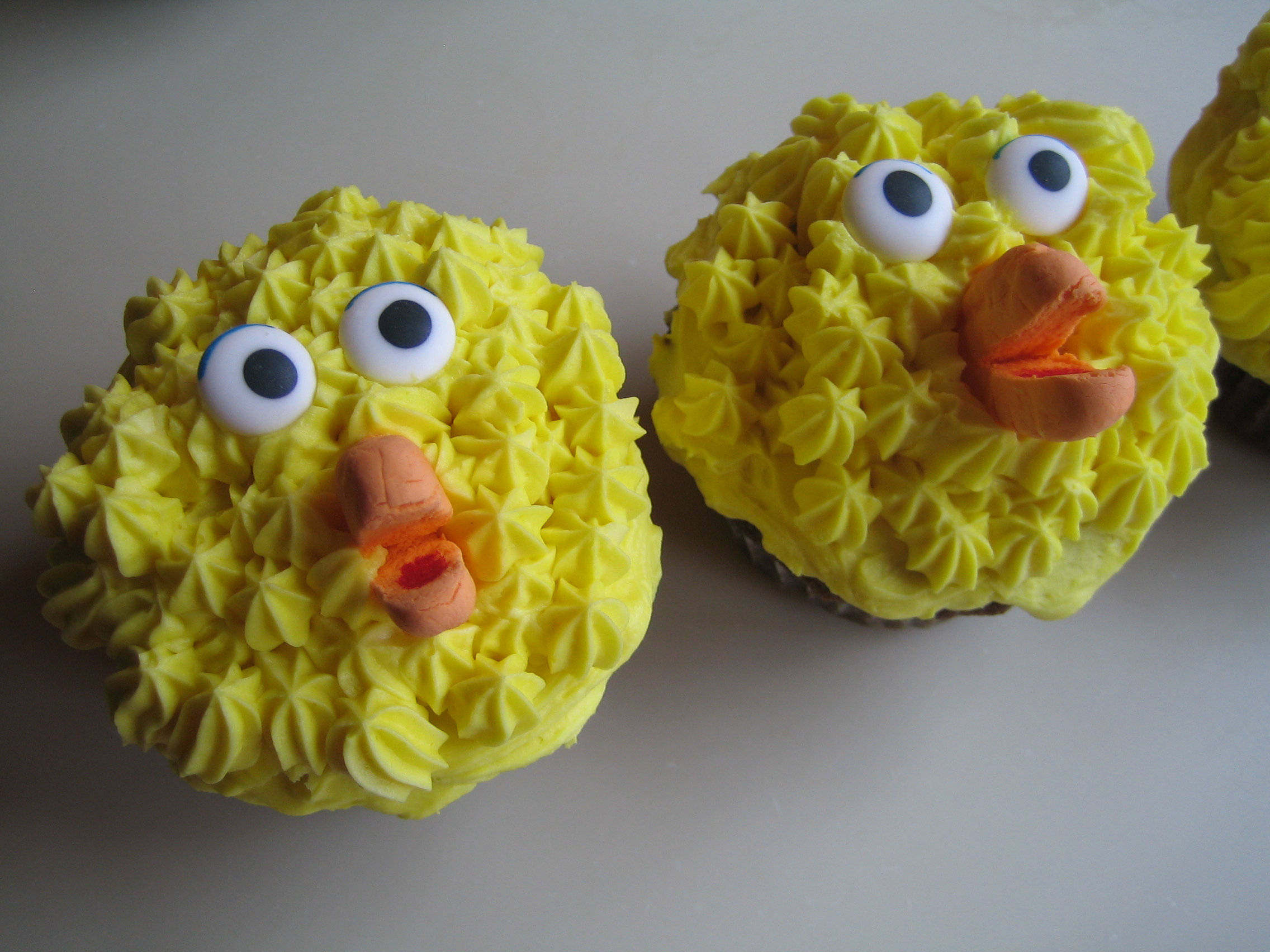 1. Ice cupcakes using a star tip. Affix eyes and beak of choice.