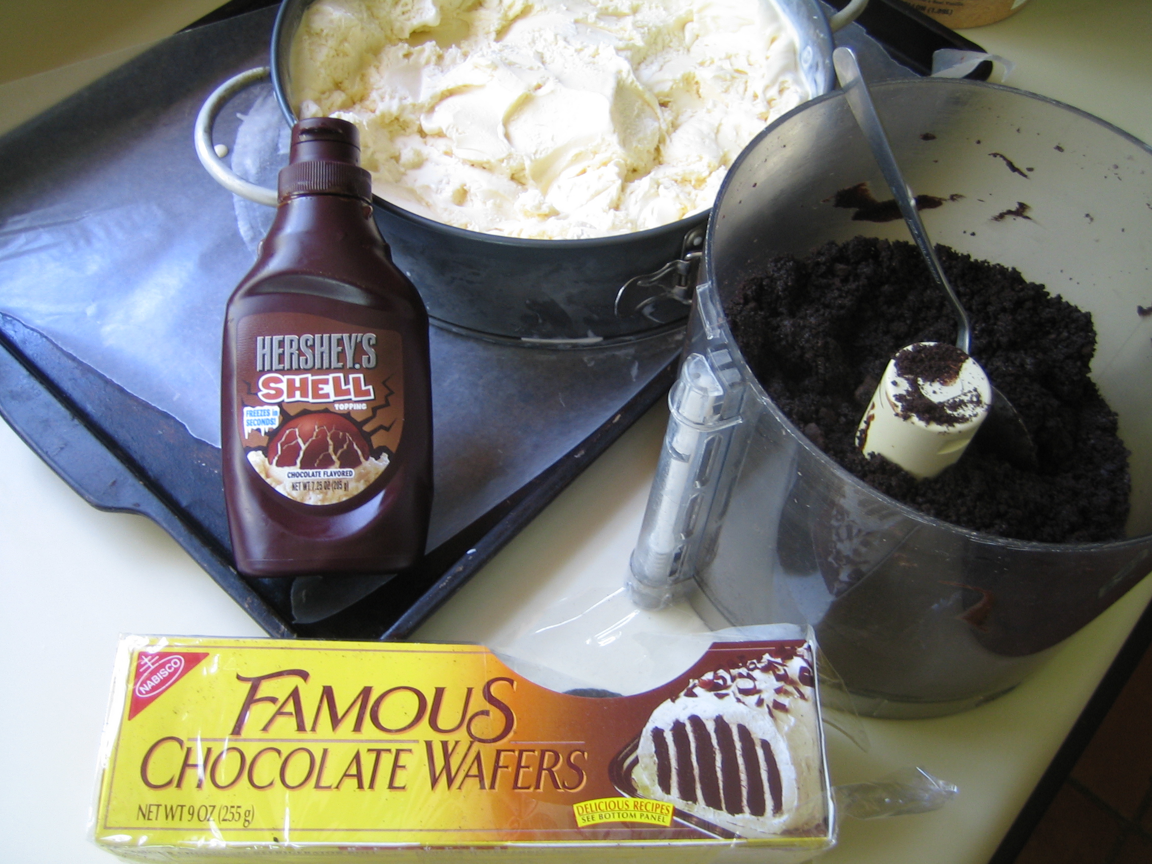 4. Make the chocolate crunchies: In a food processor, chop wafers and Oreo cookies into large crumbs. Add magic shell, a little at a time until crumbs are completely coated, but not swimming in it. (I used about 1/2 of the bottle)