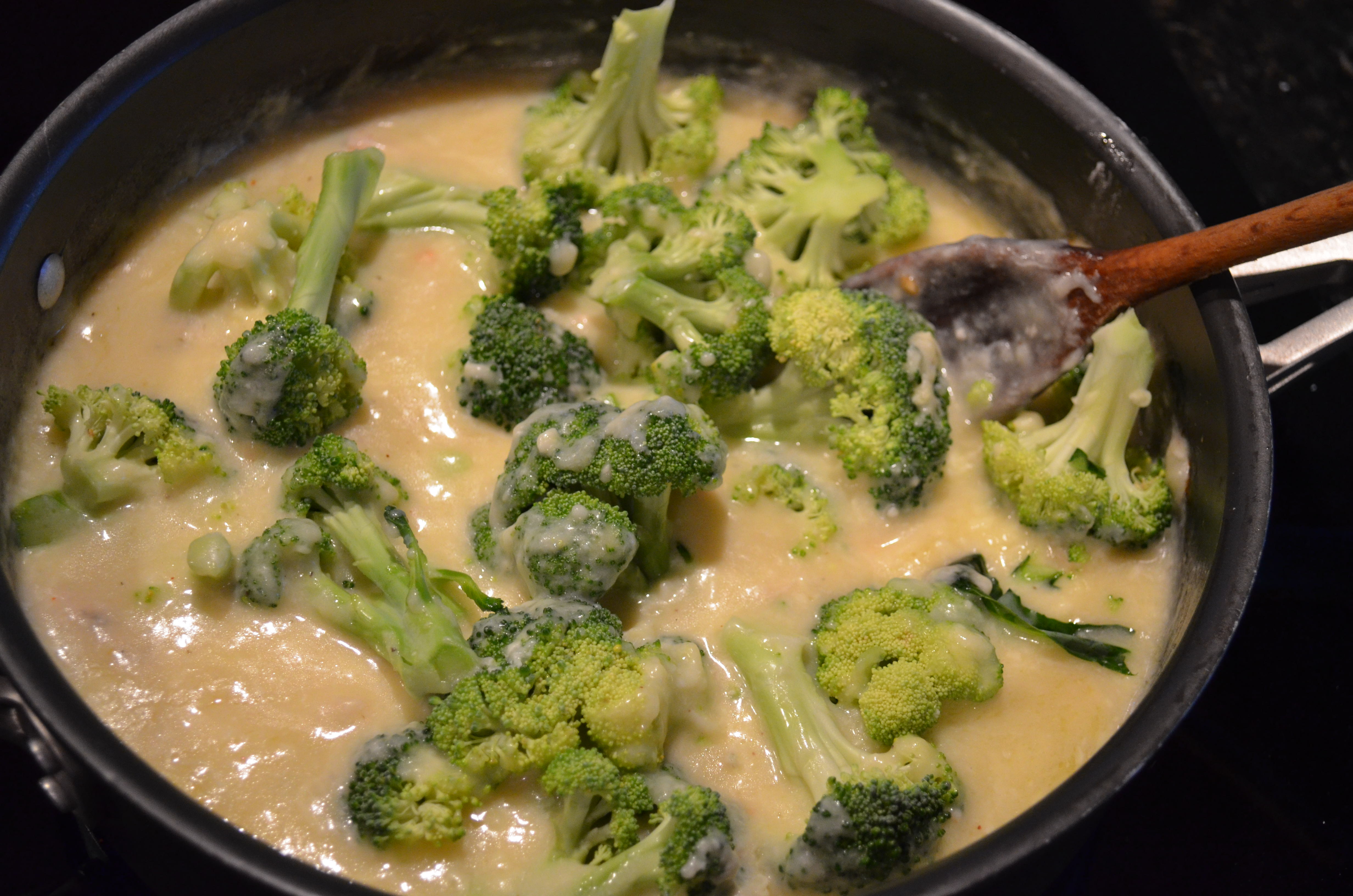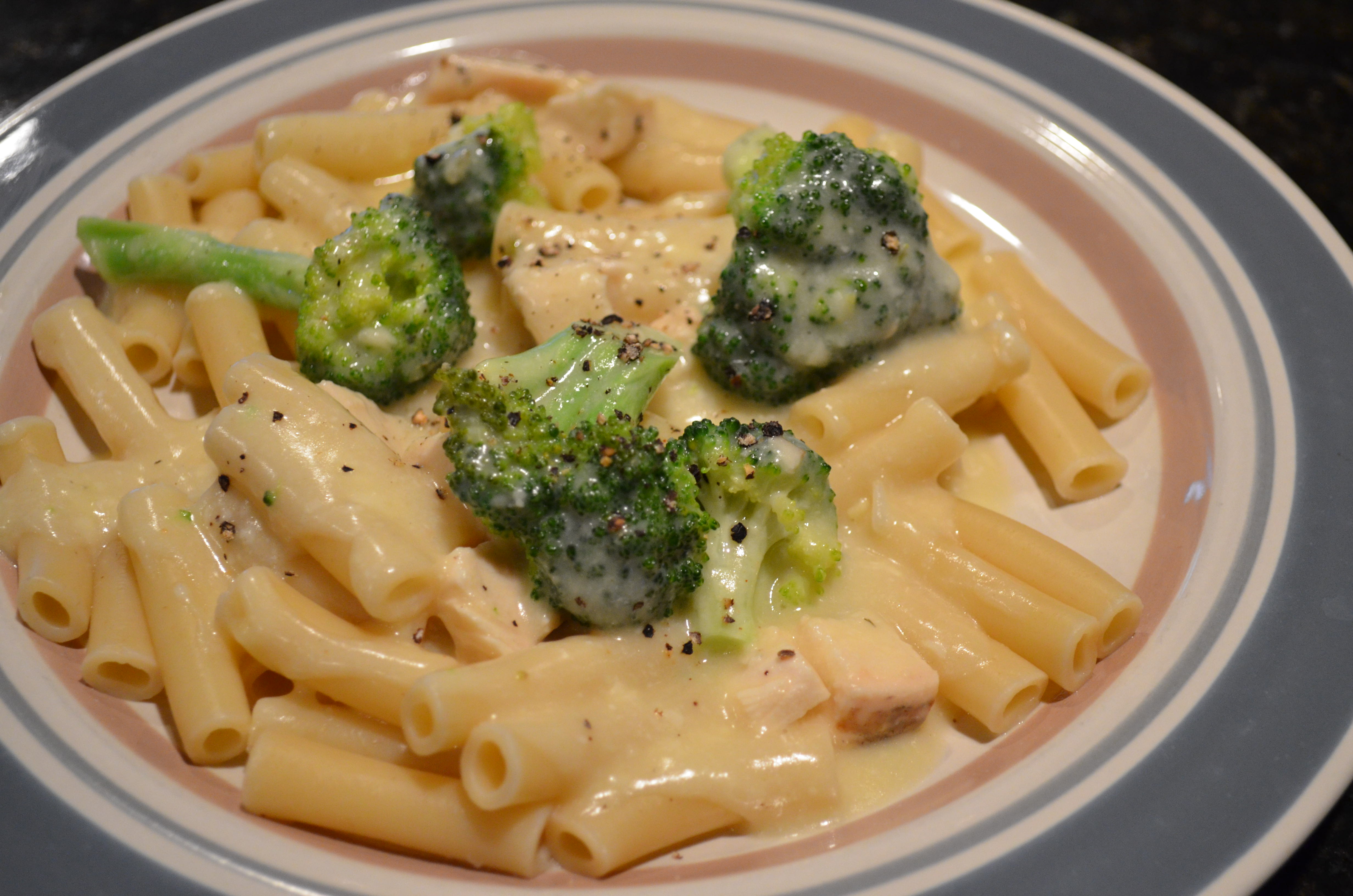 3. Mix in the broccoli florets and chicken pieces, and cook just until heated through. Mix in the cooked pasta until evenly coated with the sauce. Serve warm.
