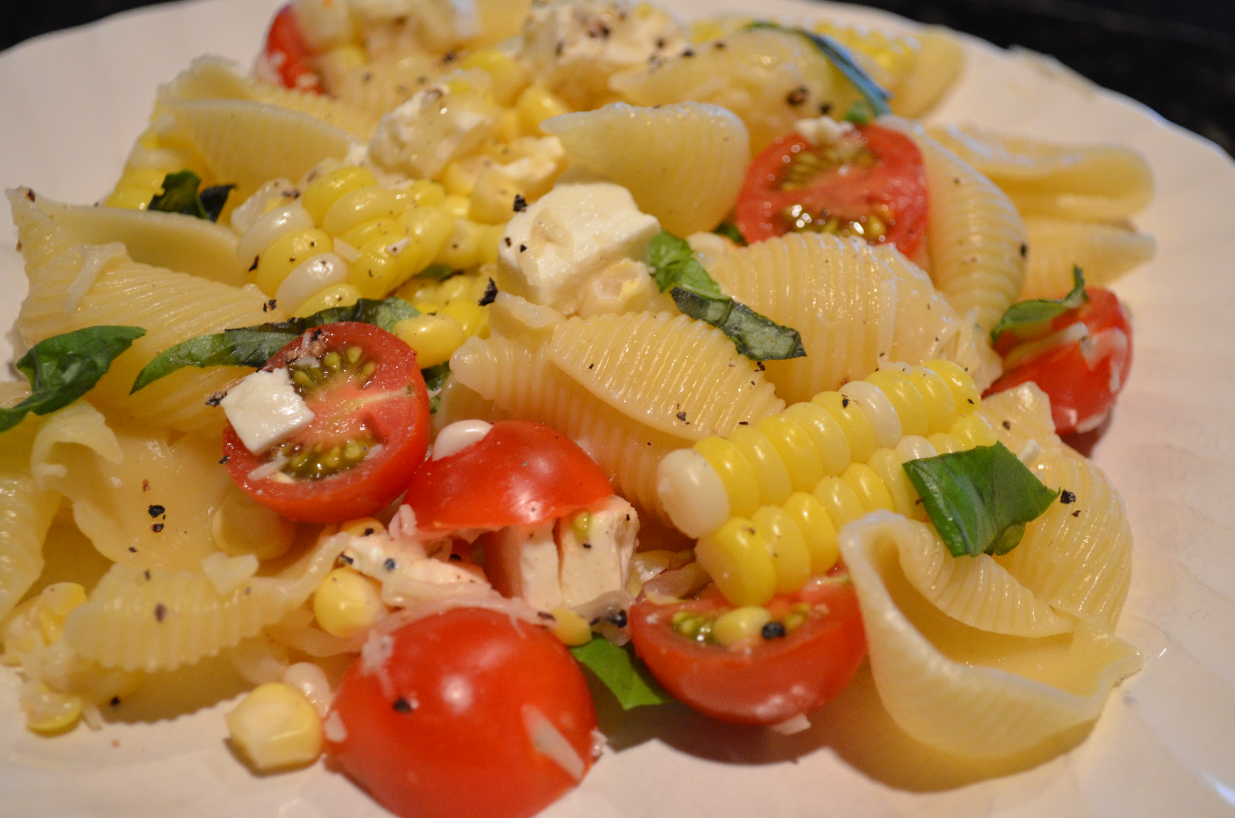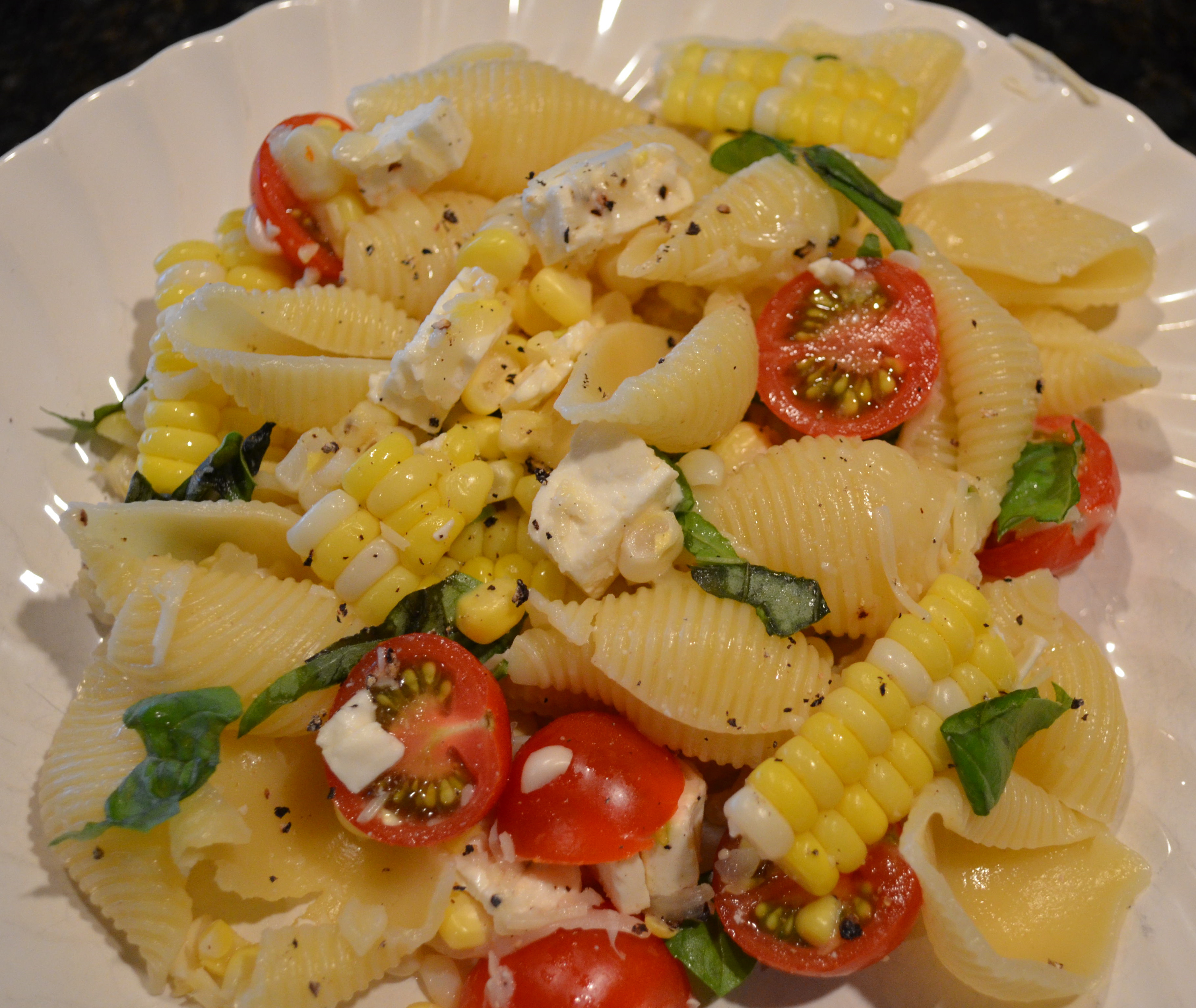 This is a really good pasta dish. I love the fresh corn with the tomatoes. The cool of the ingredients against the warm pasta with the cheese just starting to get soft and melty…yum.
