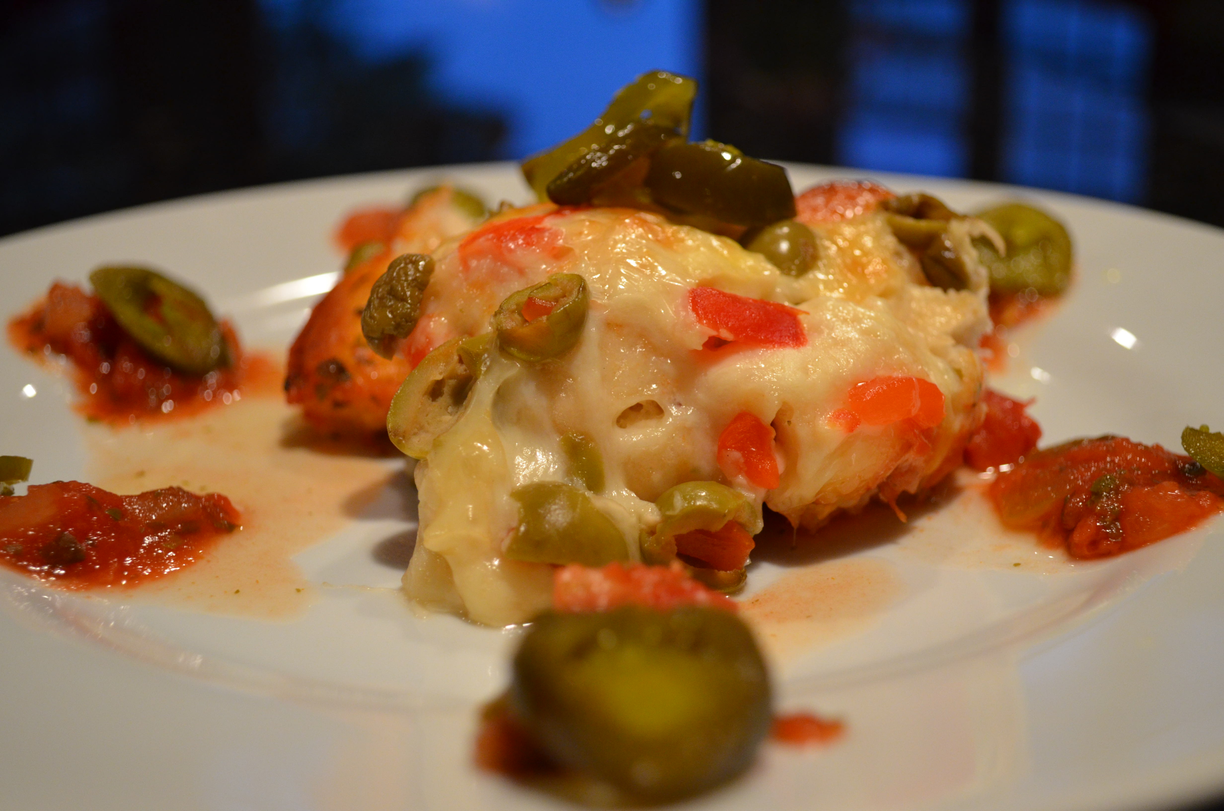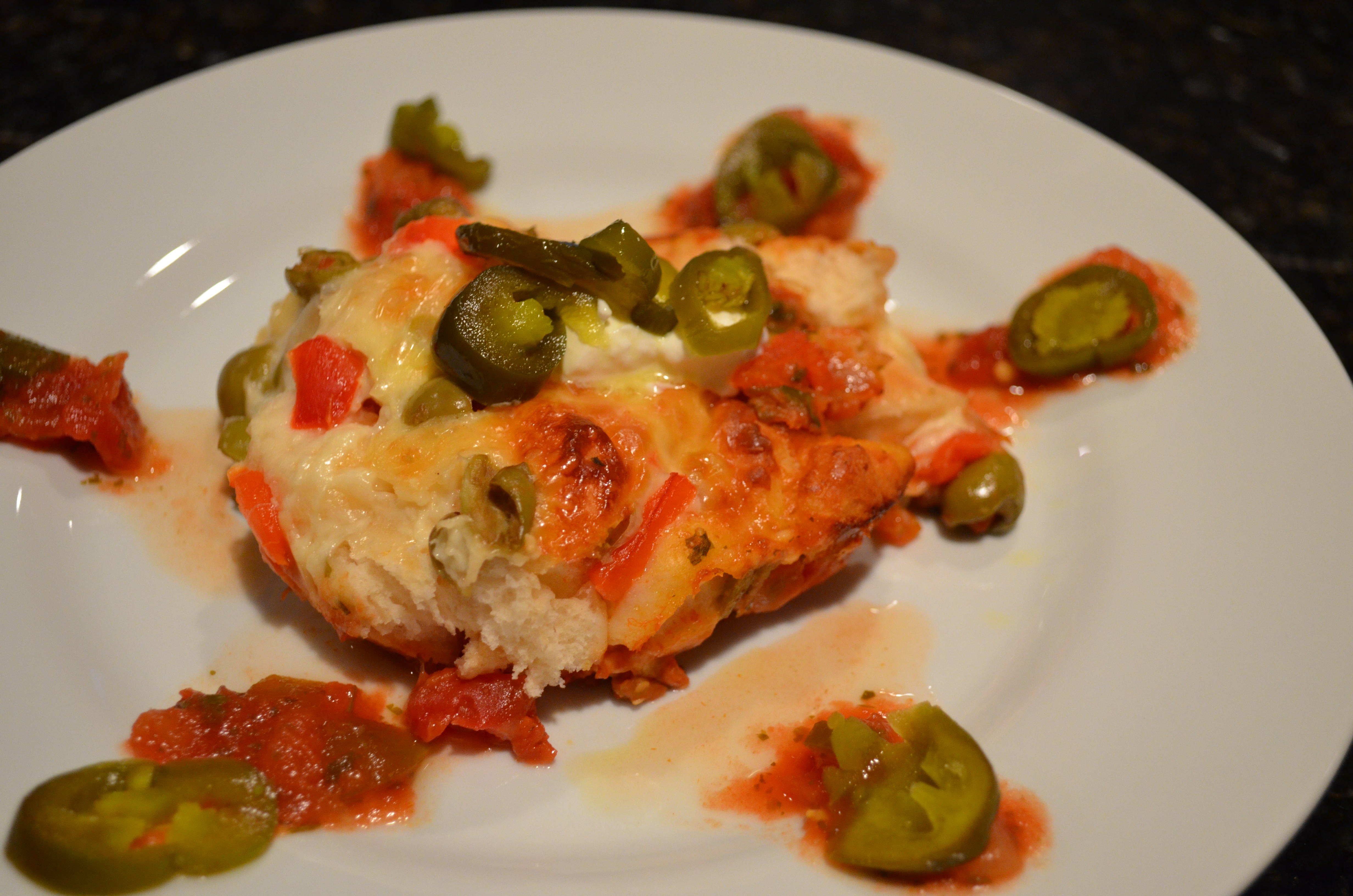3. Separate dough and cut each biscuit into quarters. Place biscuit pieces in large bowl; toss with 1 3/4 cups salsa. Spoon evenly into butter coated dish. Sprinkle with cheeses, piemento, onions and olives.