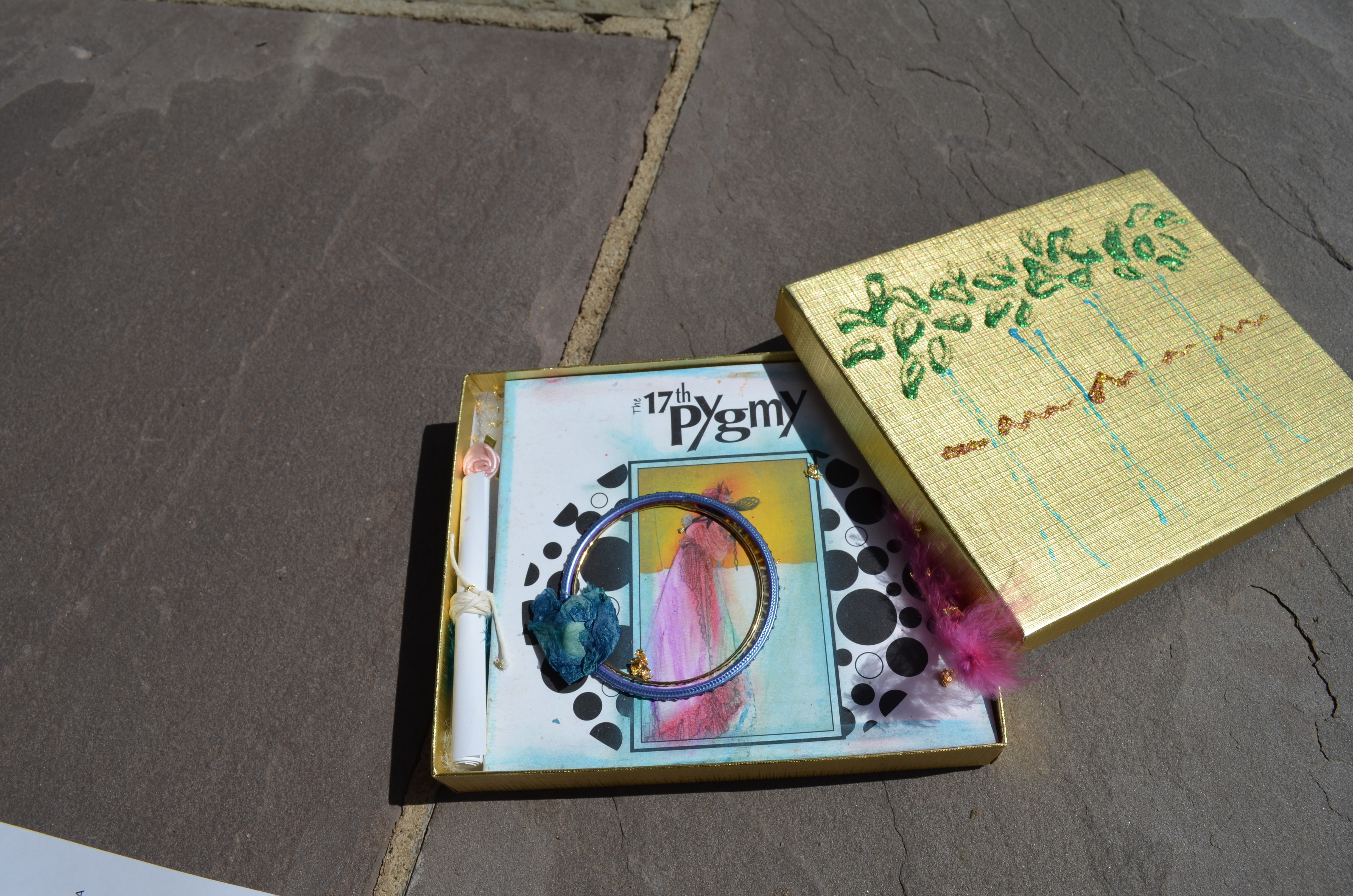 A hand decorated gold box that held the cd, a scroll (which I cannot bring myself to open since it is so lovely and perfect), pieces of gold leaf, dried flowers and a little circle that is bracelet like. I do not own any other music even remotely as interesting packaged.