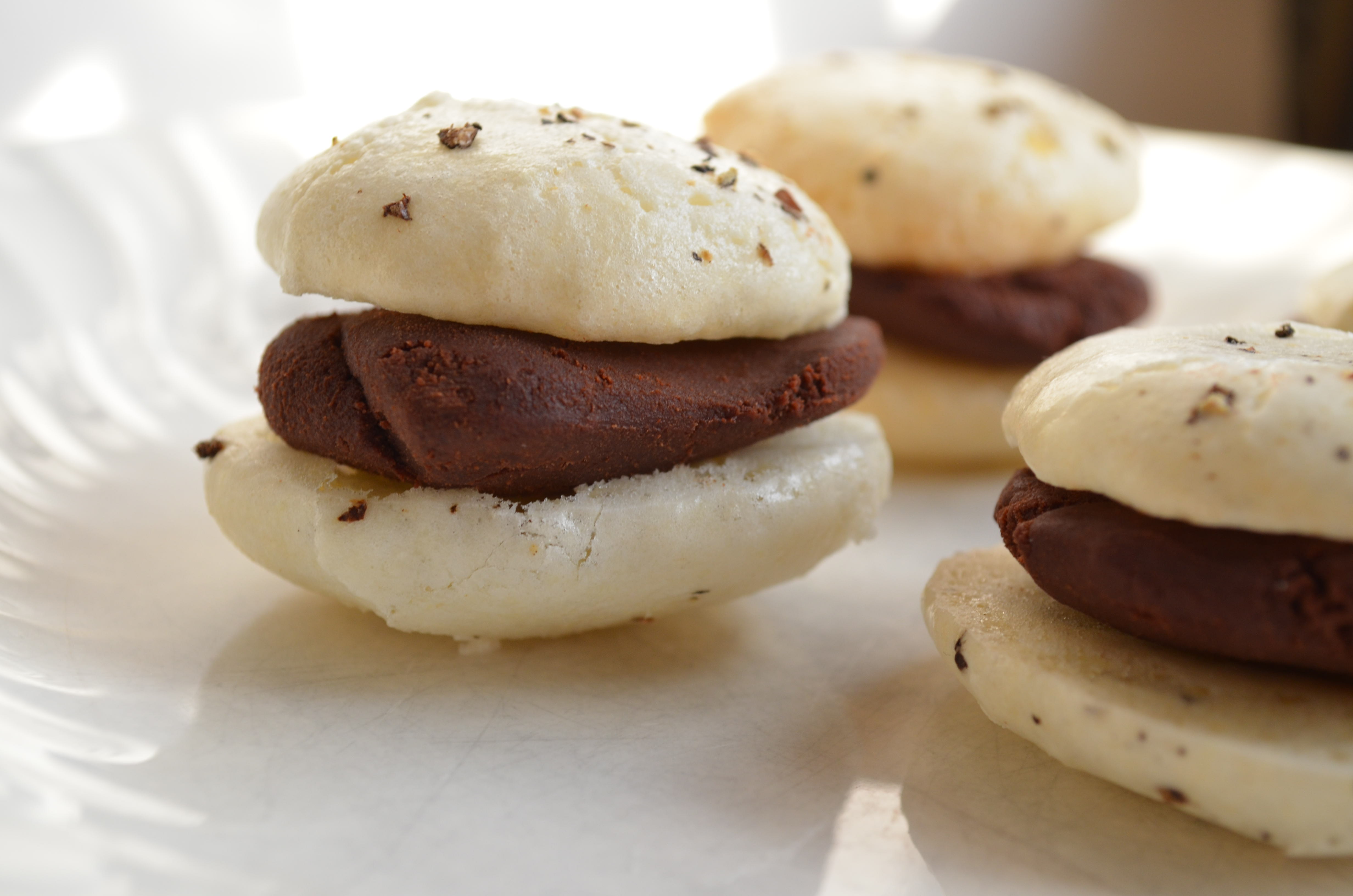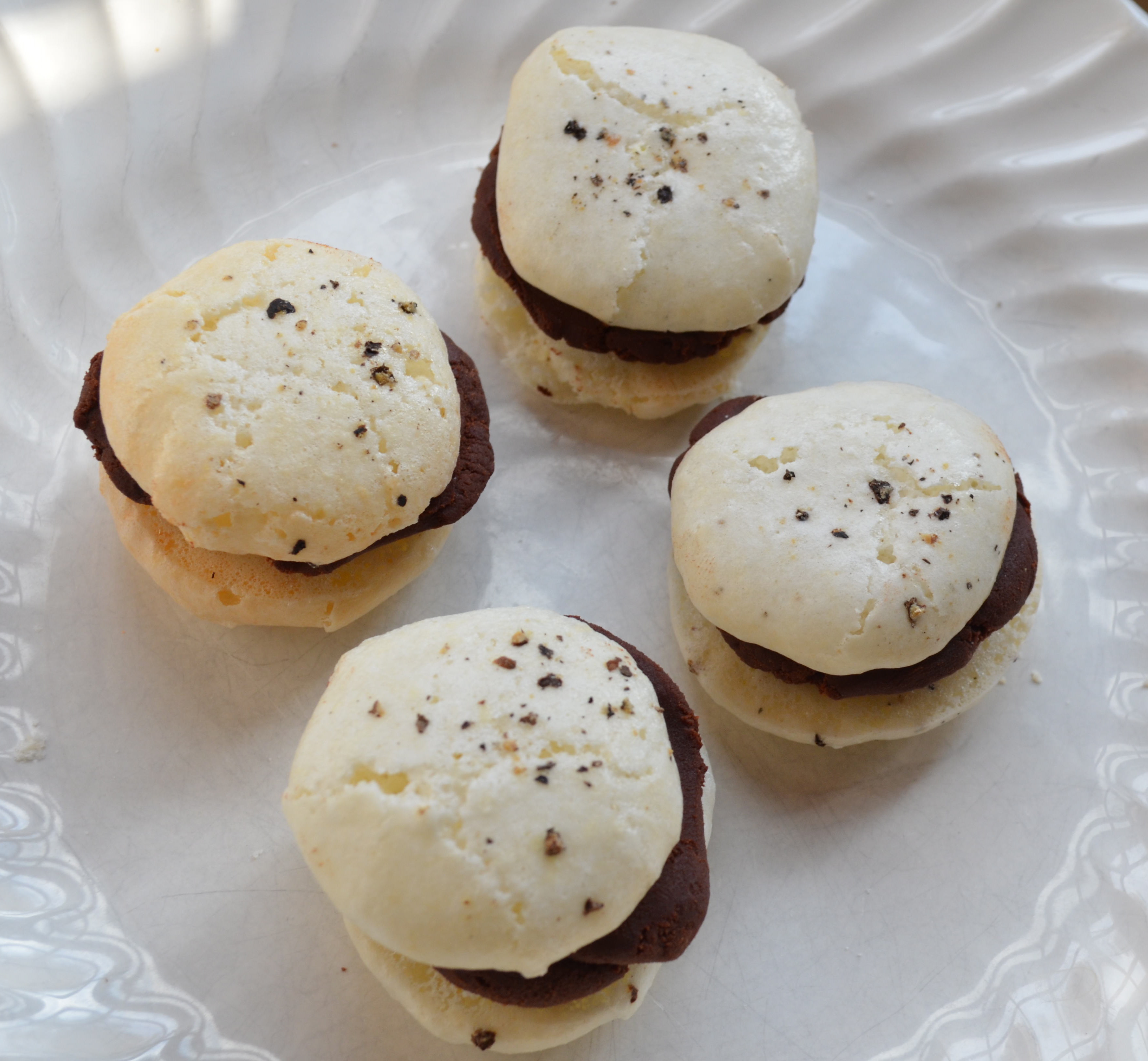 I had Chocolate Ganache left over from the Chocolate Ganache Cupcakes posted here, which is what I used to fill my Black Pepper Macarons. (Leftover ganache keeps in the fridge. Just let it come to room temperature to use. The leftover ganache isn’t pipeable (is that even a word?) so I just rolled it then flattened it into disks to fit between the macarons. Worked great, although I think fresh and gooey ganache would be even better.)