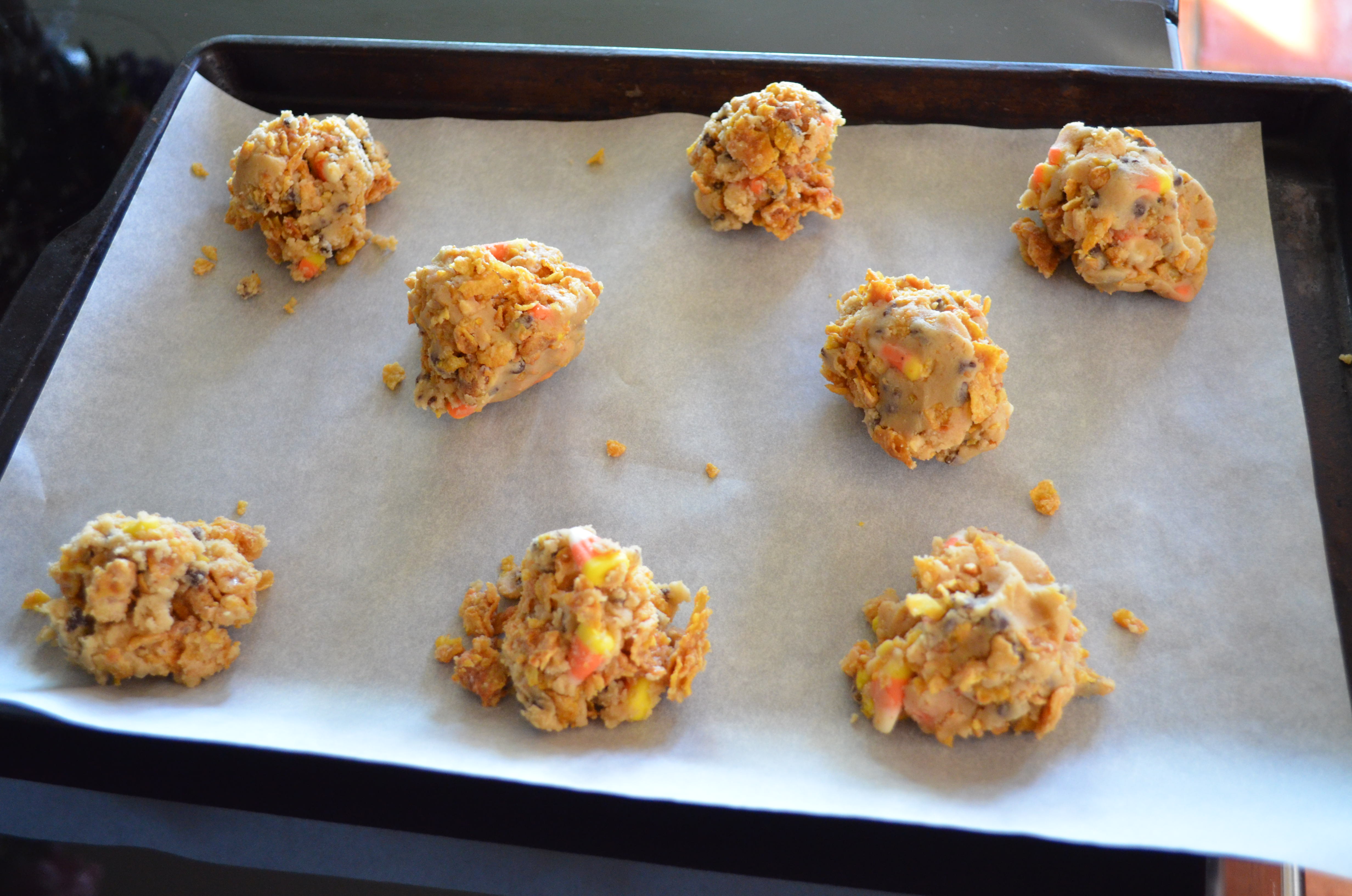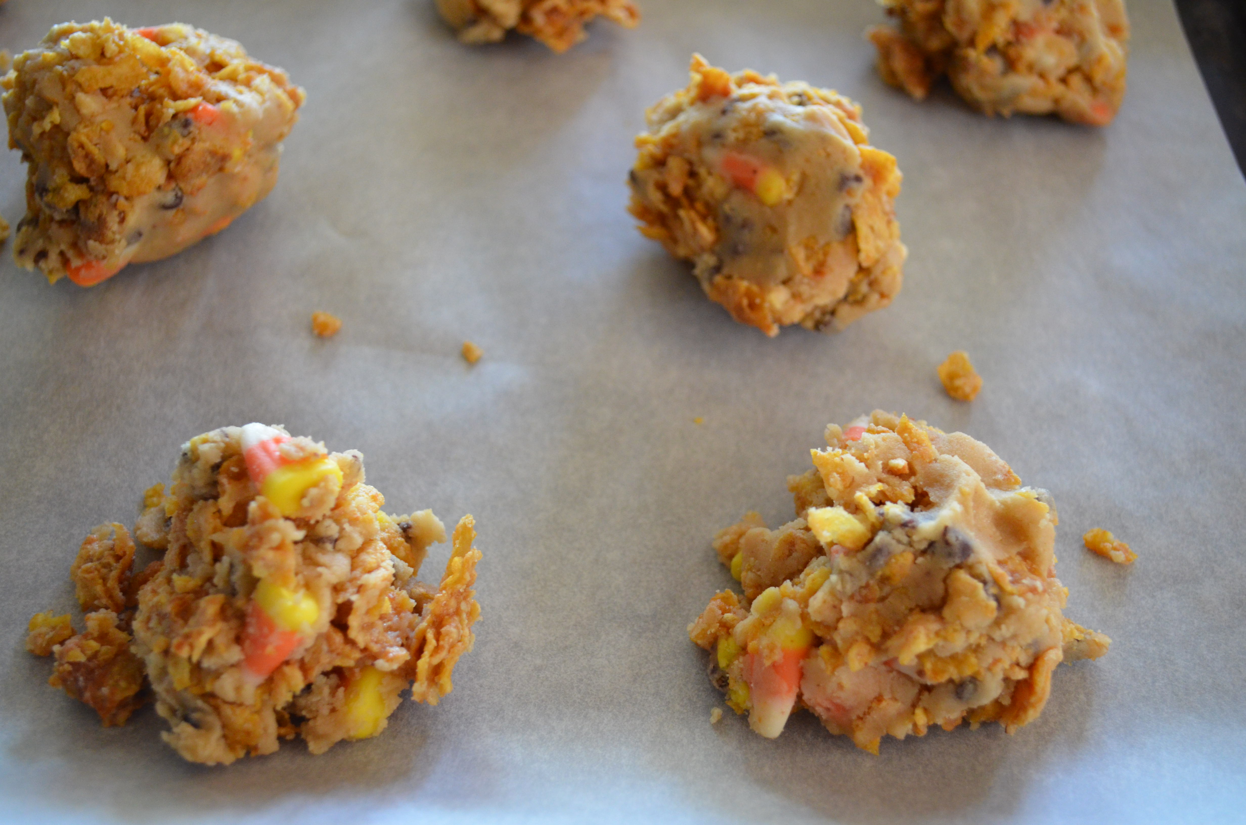 2. In a stand mixer beat the butter and sugar until light and fluffy. Beat in the egg and vanilla, then turn the mixer to low and beat in the dry ingredients. At very low speed stir in the cornflake crunch, chocolate chips and candy corn.
