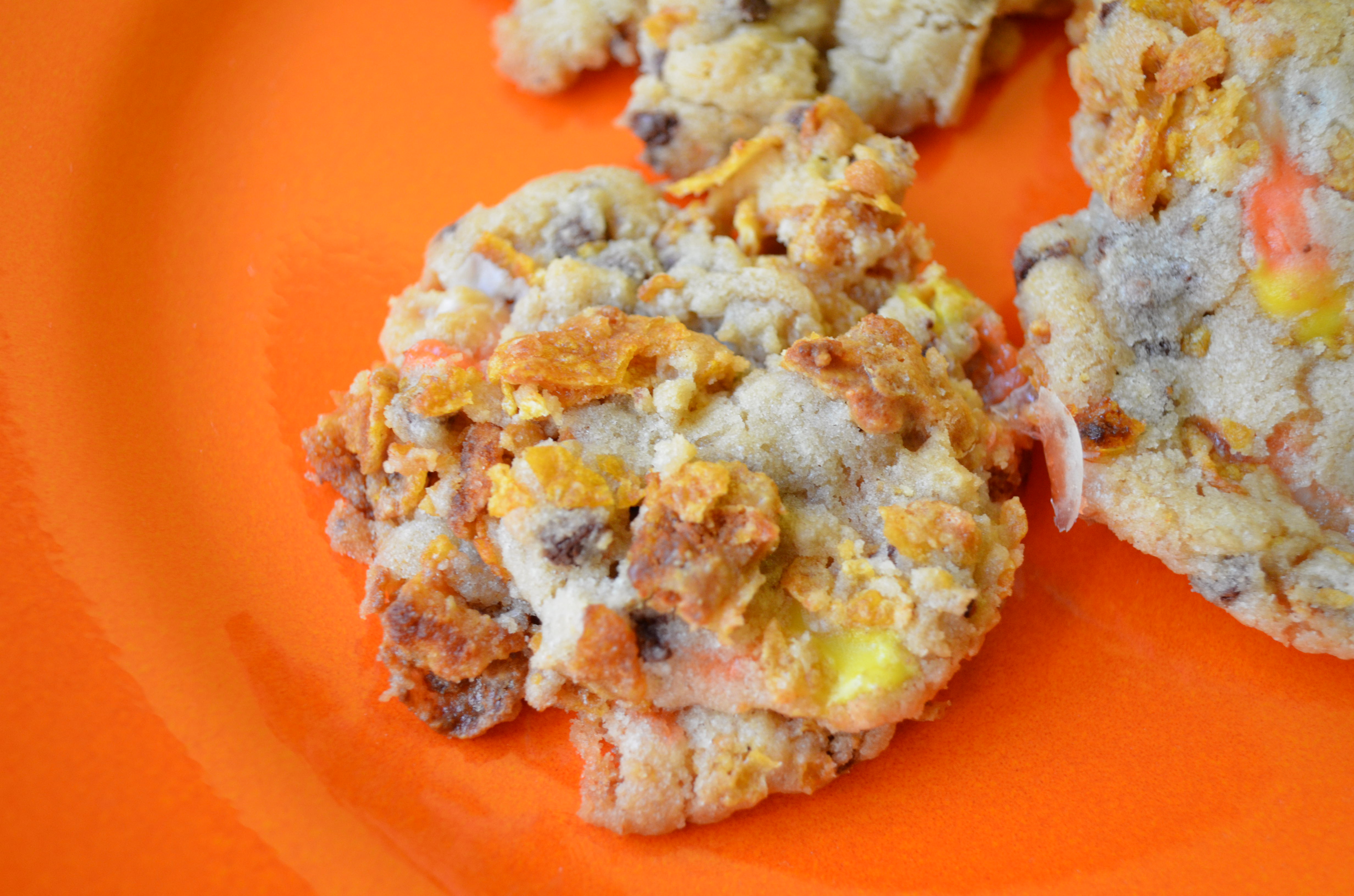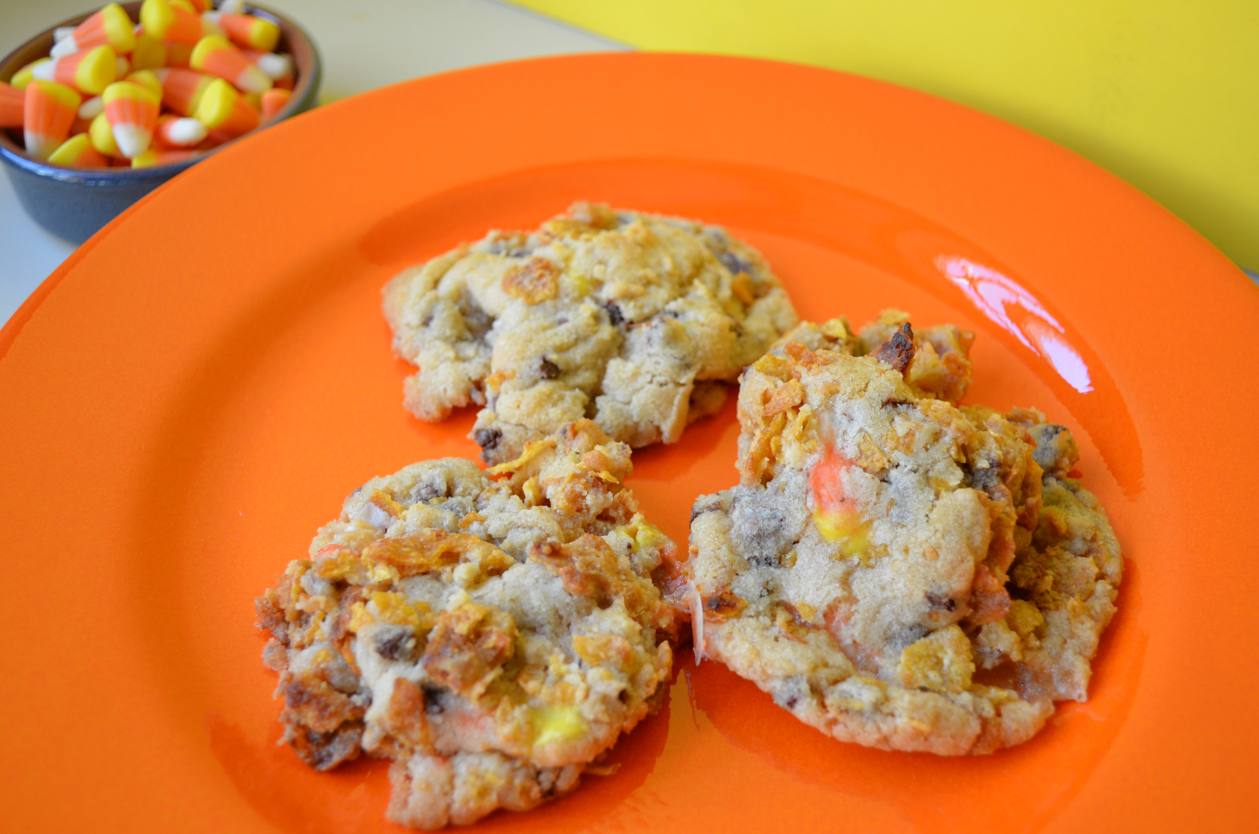 Big, crunchy cookies filled with chocolate chips and candy corn. The candy corn gets all melty and delicious and gives the cookies a really different flavor. Very sweet as in ‘awesome’.