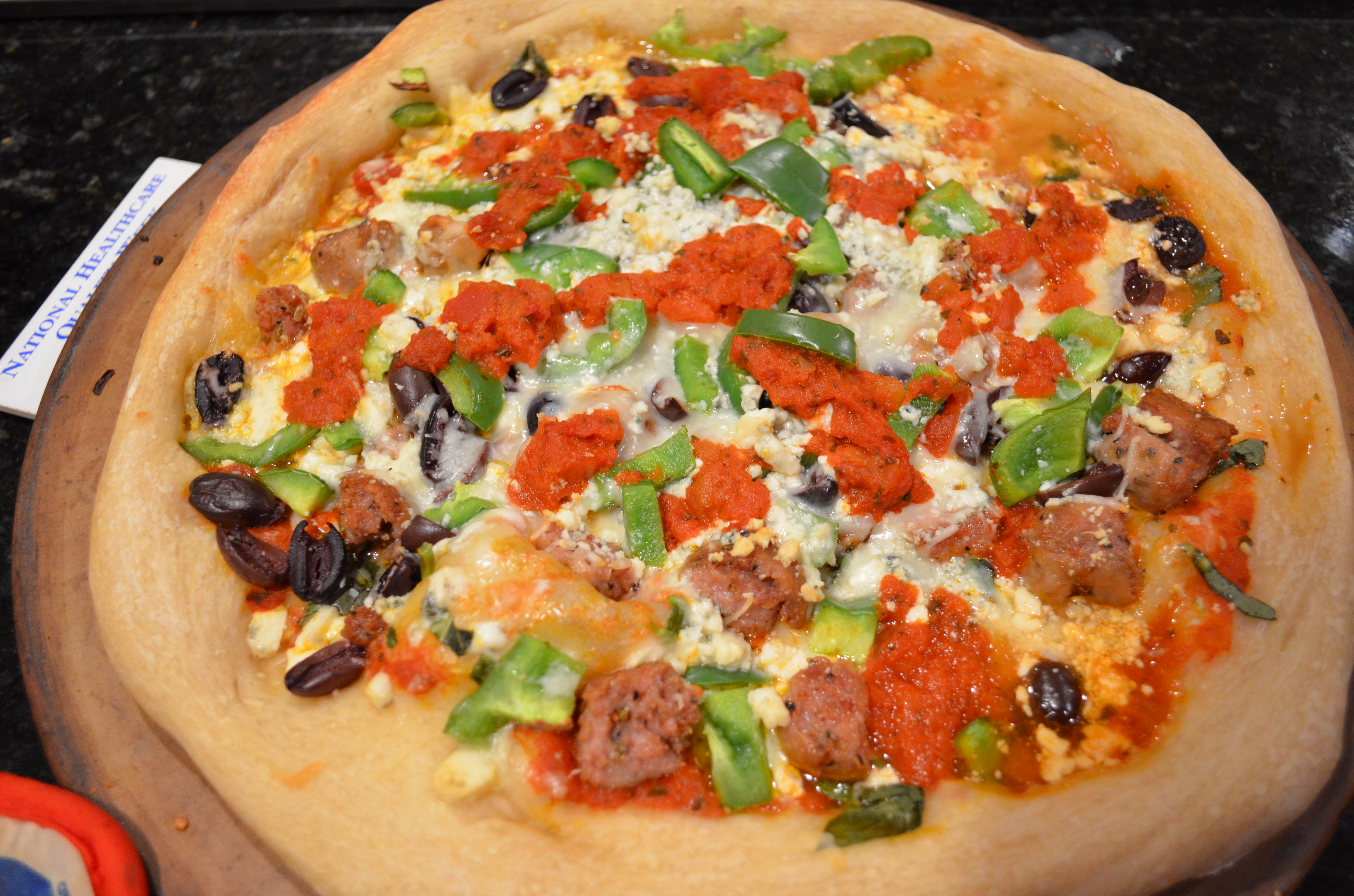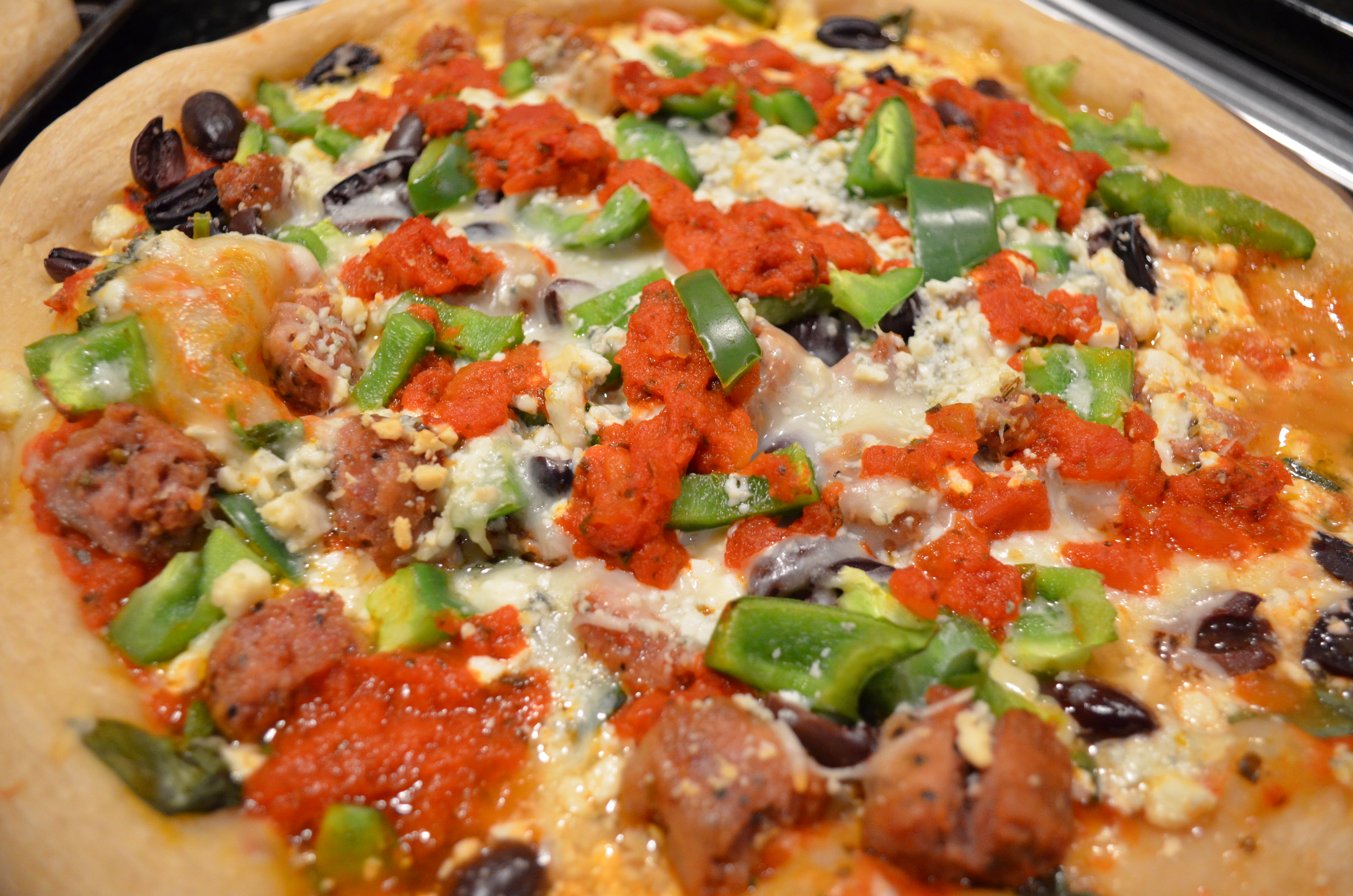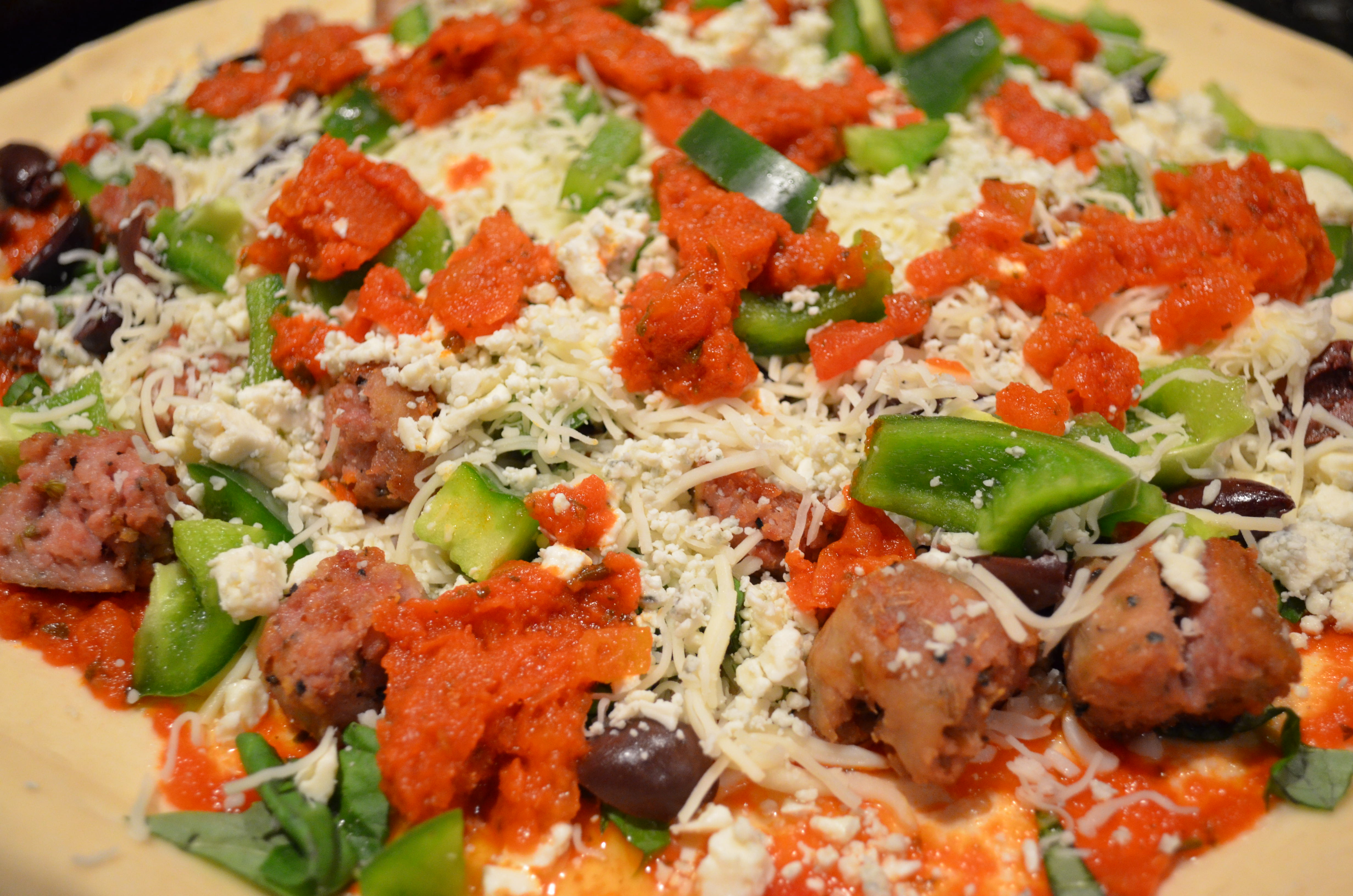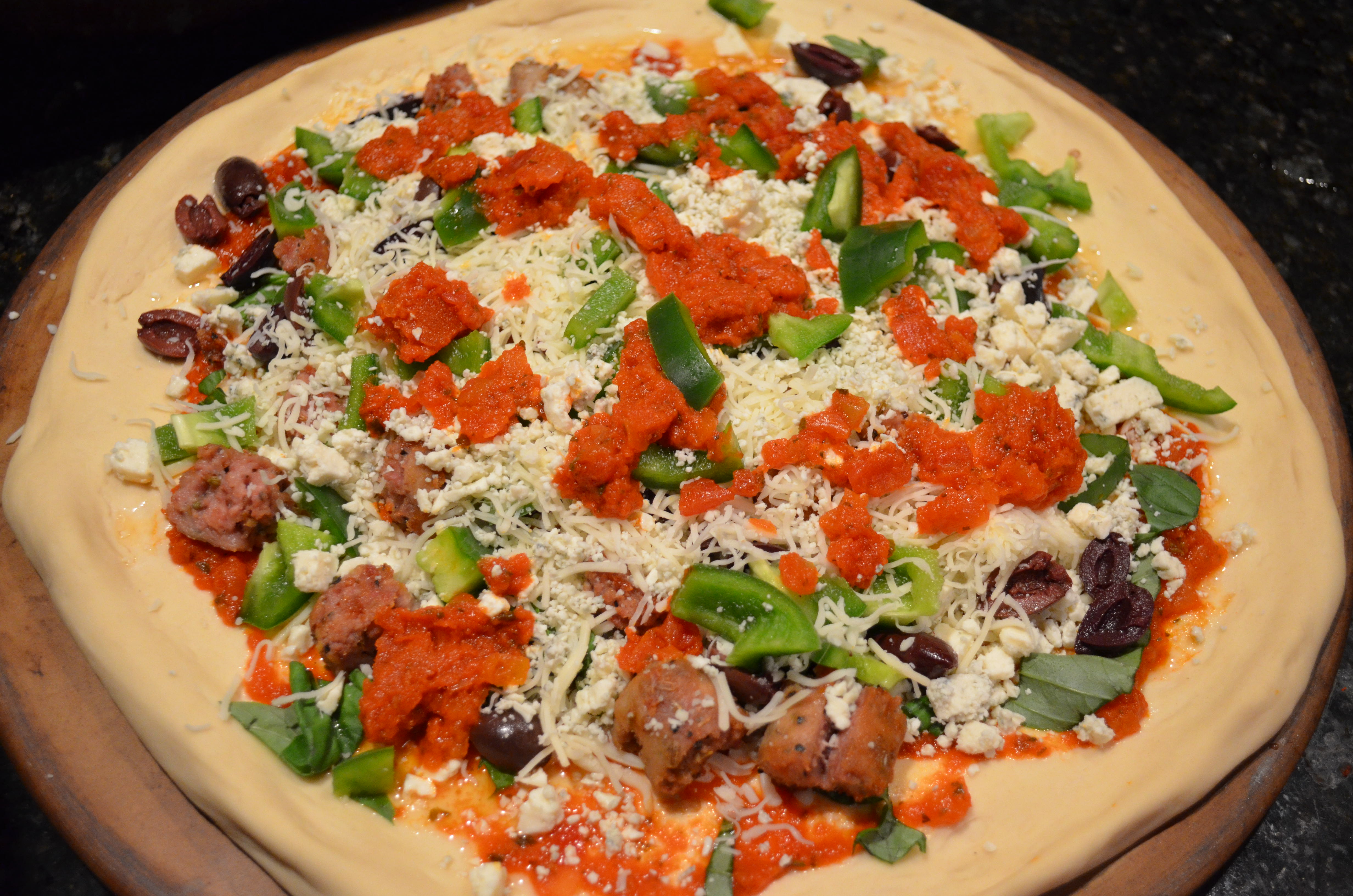 3. Place pizza dough on baking sheet or pizza stone. Spread 1 cup sauce over crust. Top with 3/4 cup mozzarella, 3/4 basil, sausage, 1/2 cup Gorgonzola, olives, 1/2 cup mozzarella, bell pepper and 1/2 cup Gorgonzola. Drizzle remaining 1/4 cup sauce over.