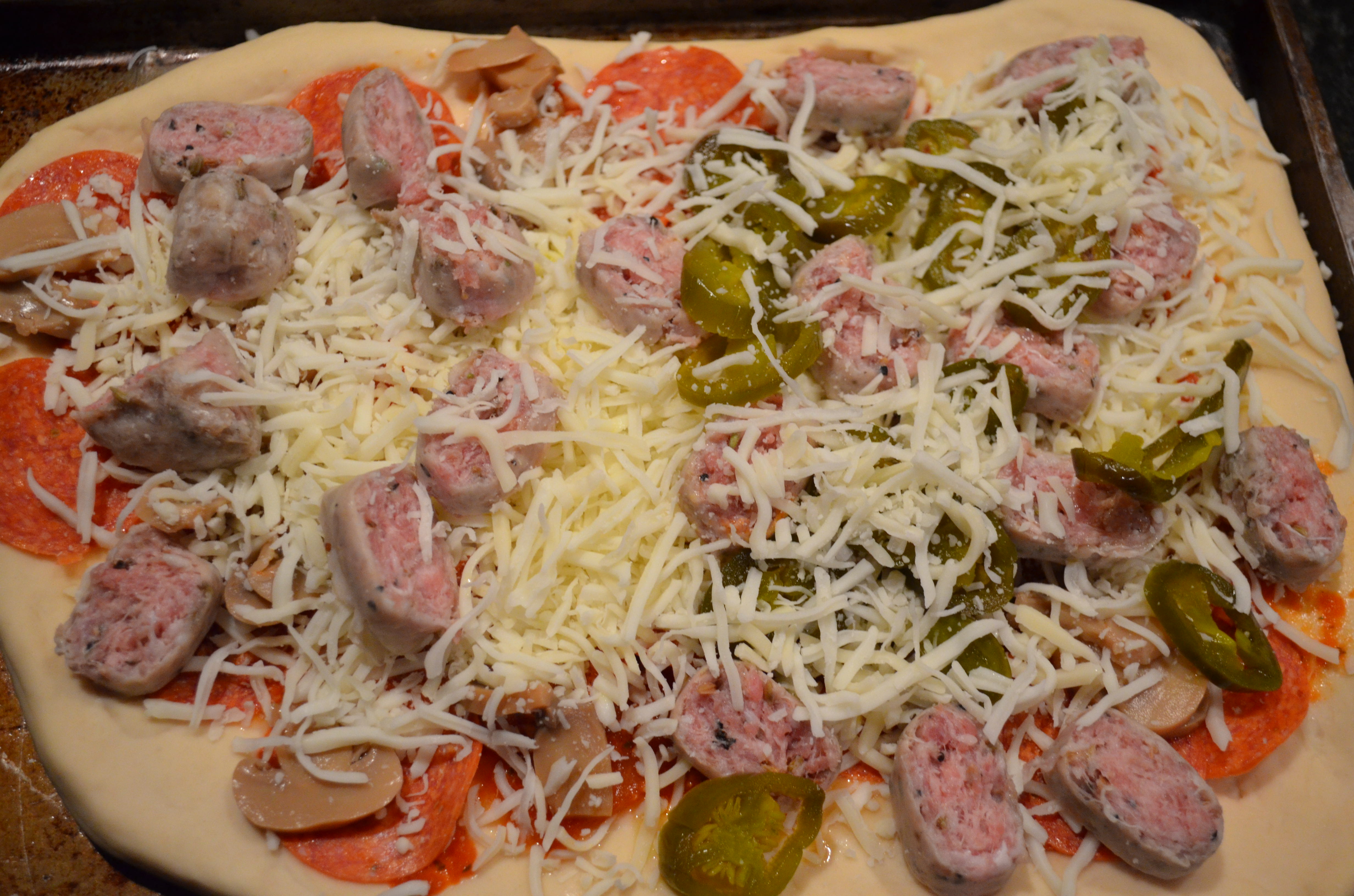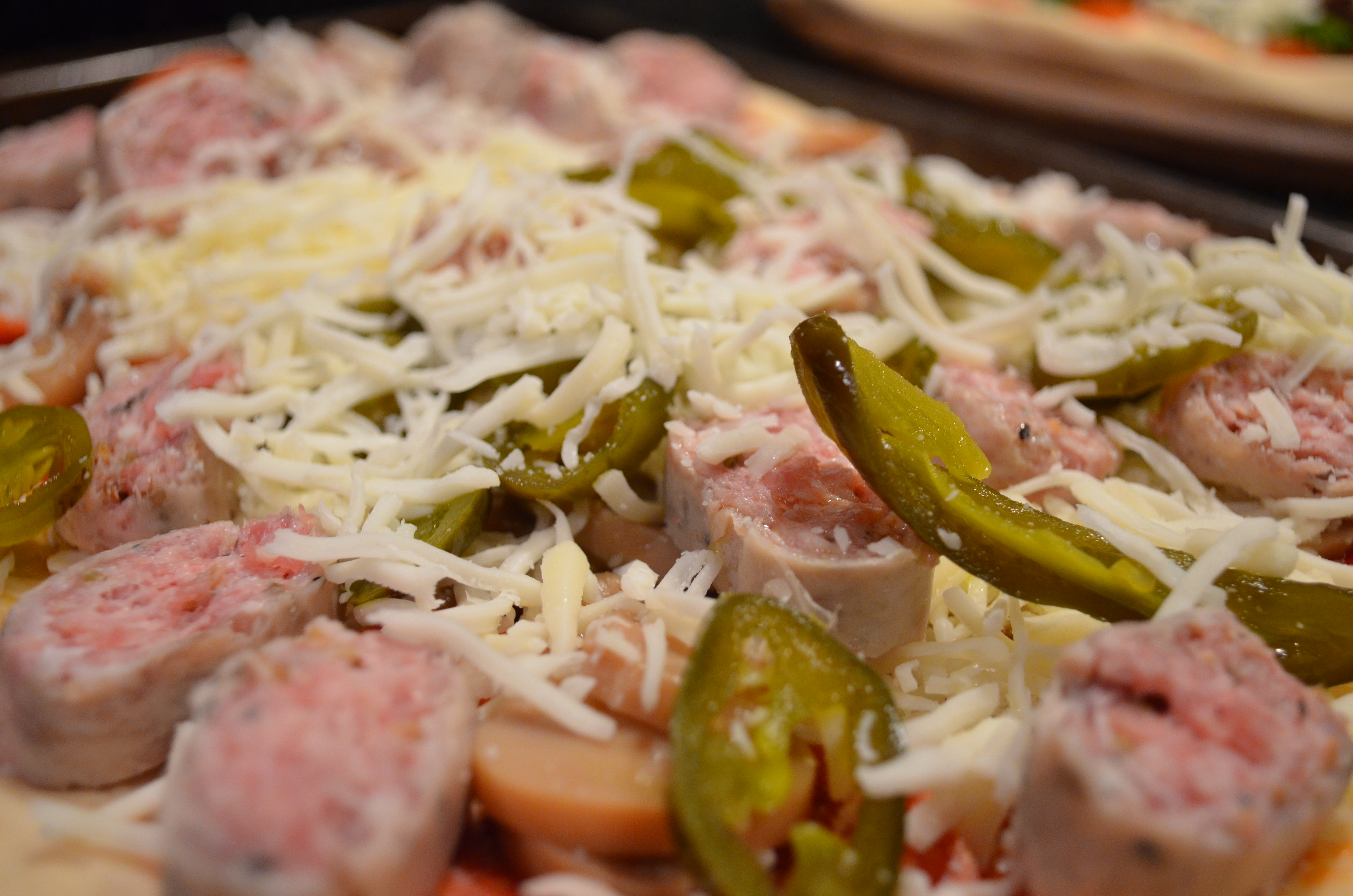 5. Cover with 1 cup of cheese and place raw sausage and jalapeños evenly over the cheese. (I only put jalapeños on half so the non chile lovers would be happy)