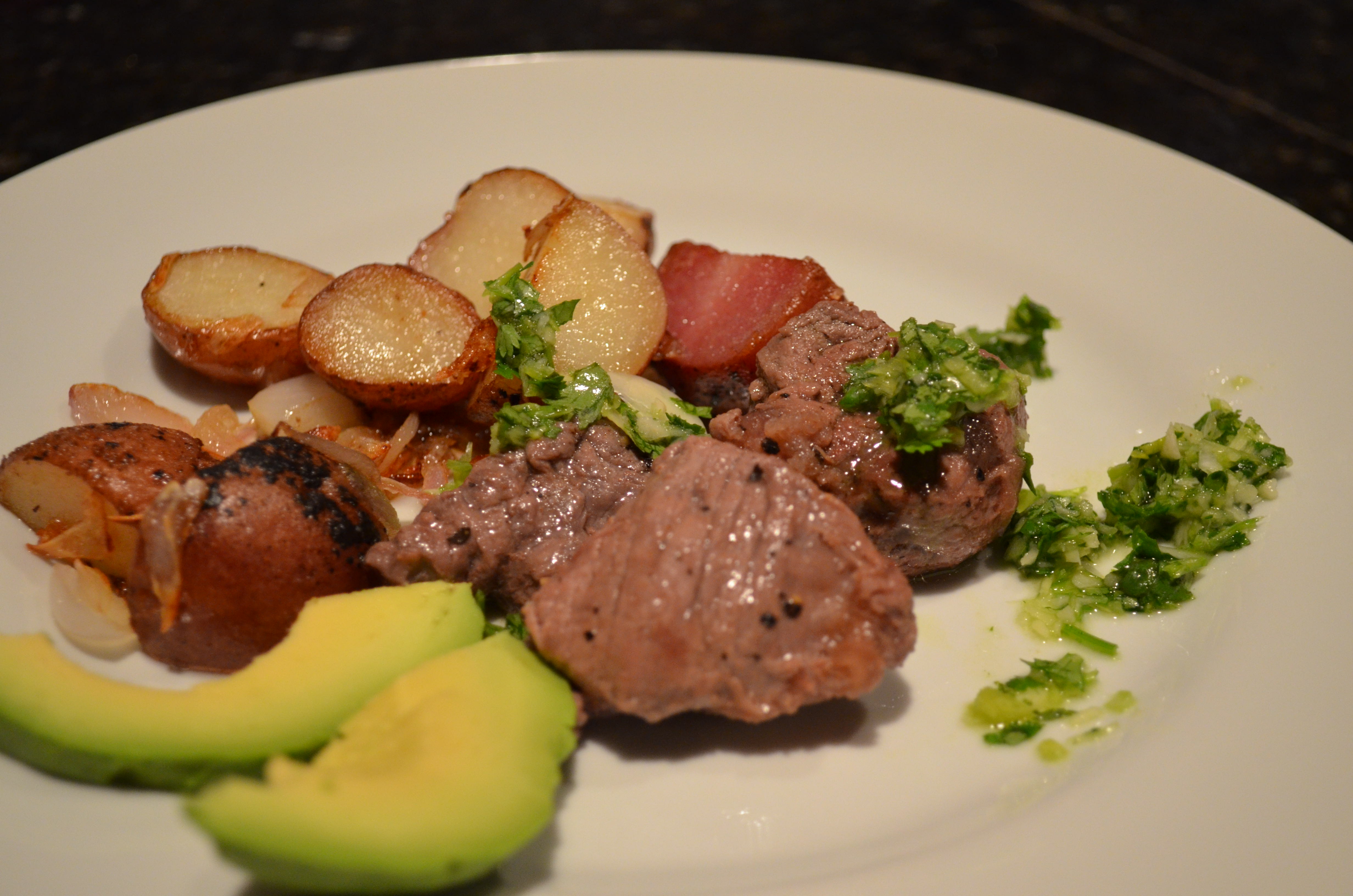 5. Drizzle steak with reserved cilantro oil and serve with potatoes and shallots. Garnish with avocado slices.
