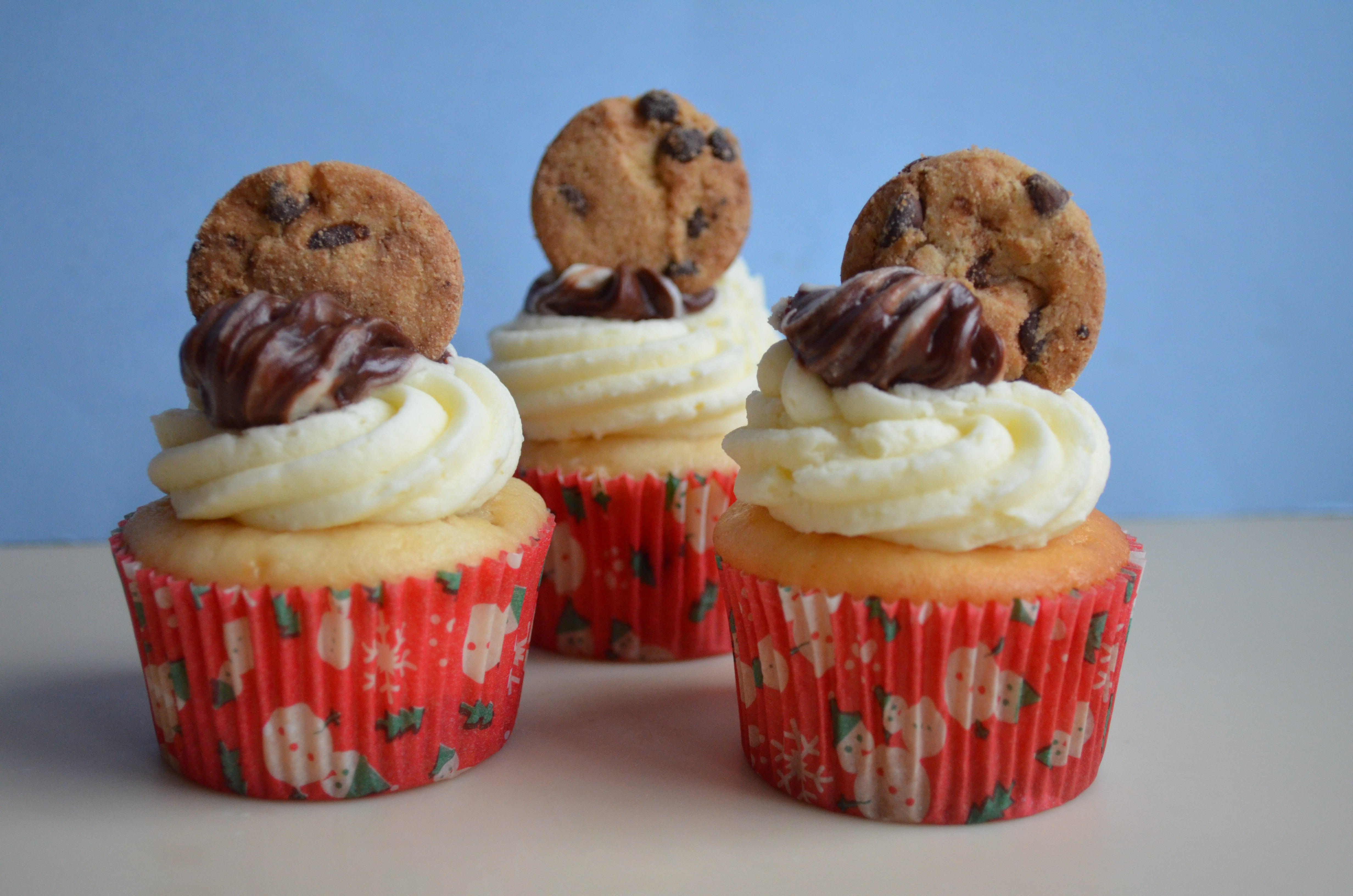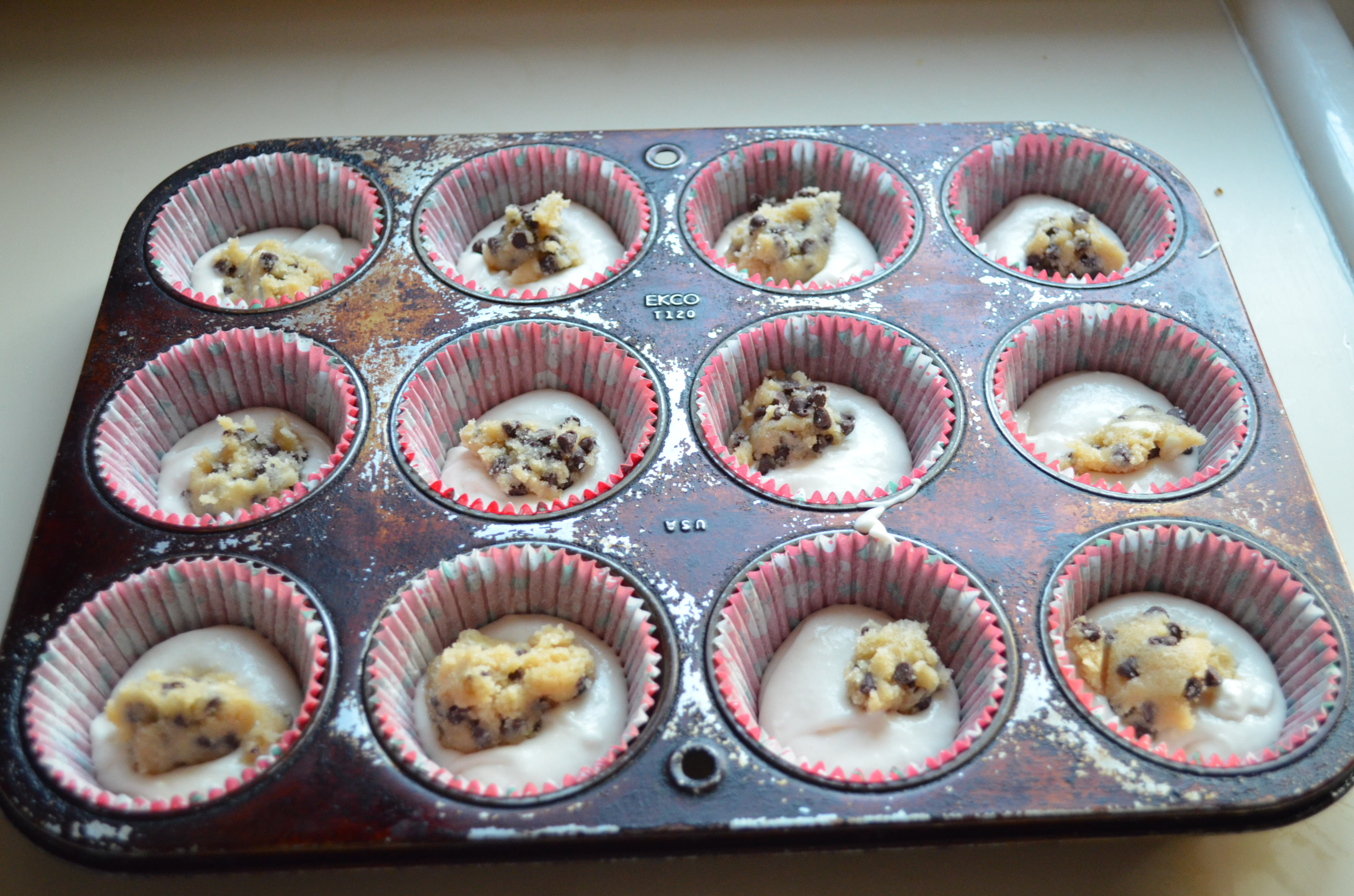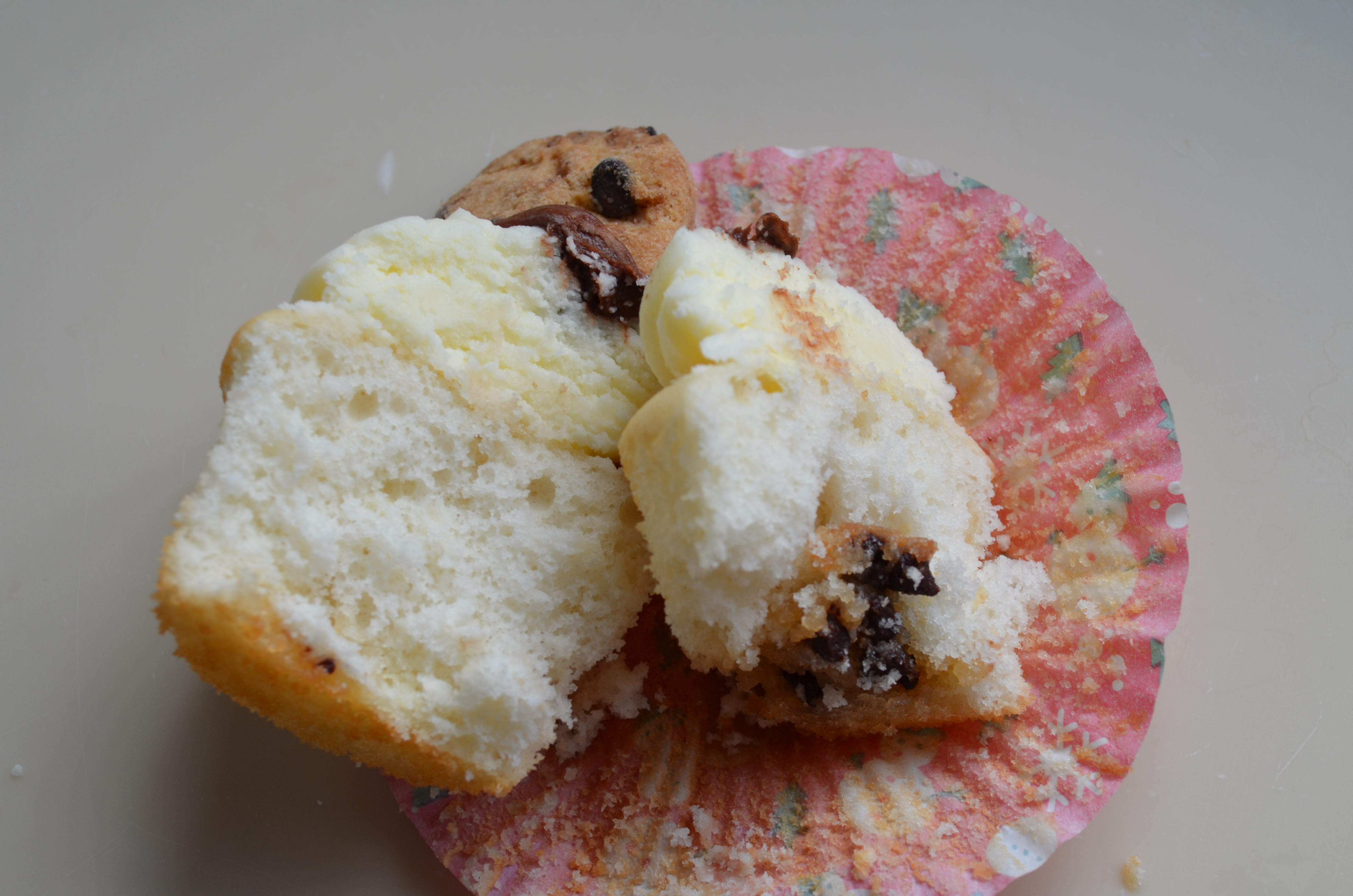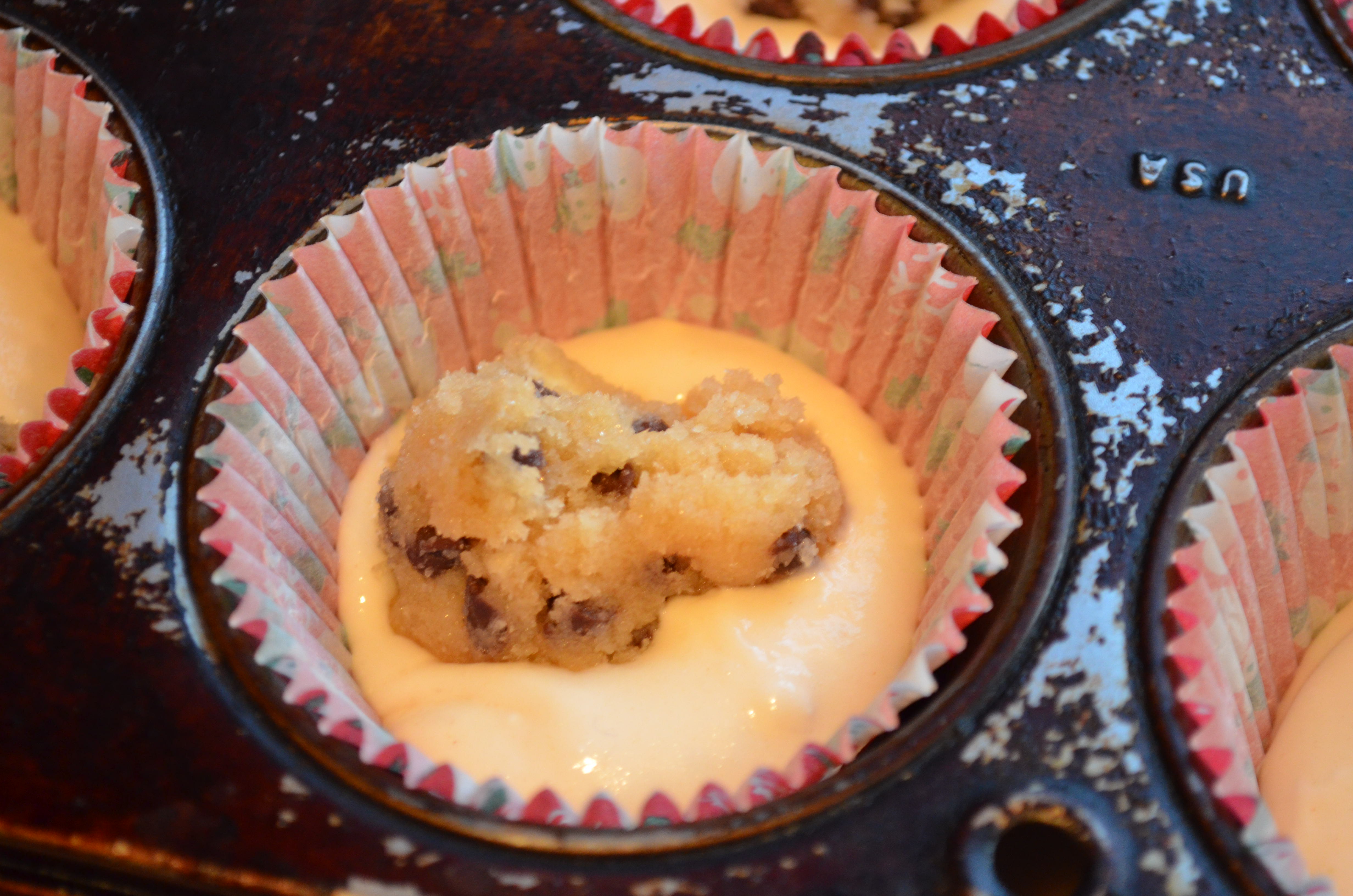 In unaccented English I am here to tell you that these cupcakes are kind of good, especially if you like chocolate chips. I thought the dough inside would be thicker, so if I made them again I might double the cookie dough quantity. Still looked cute and tasted great with hardly any effort.