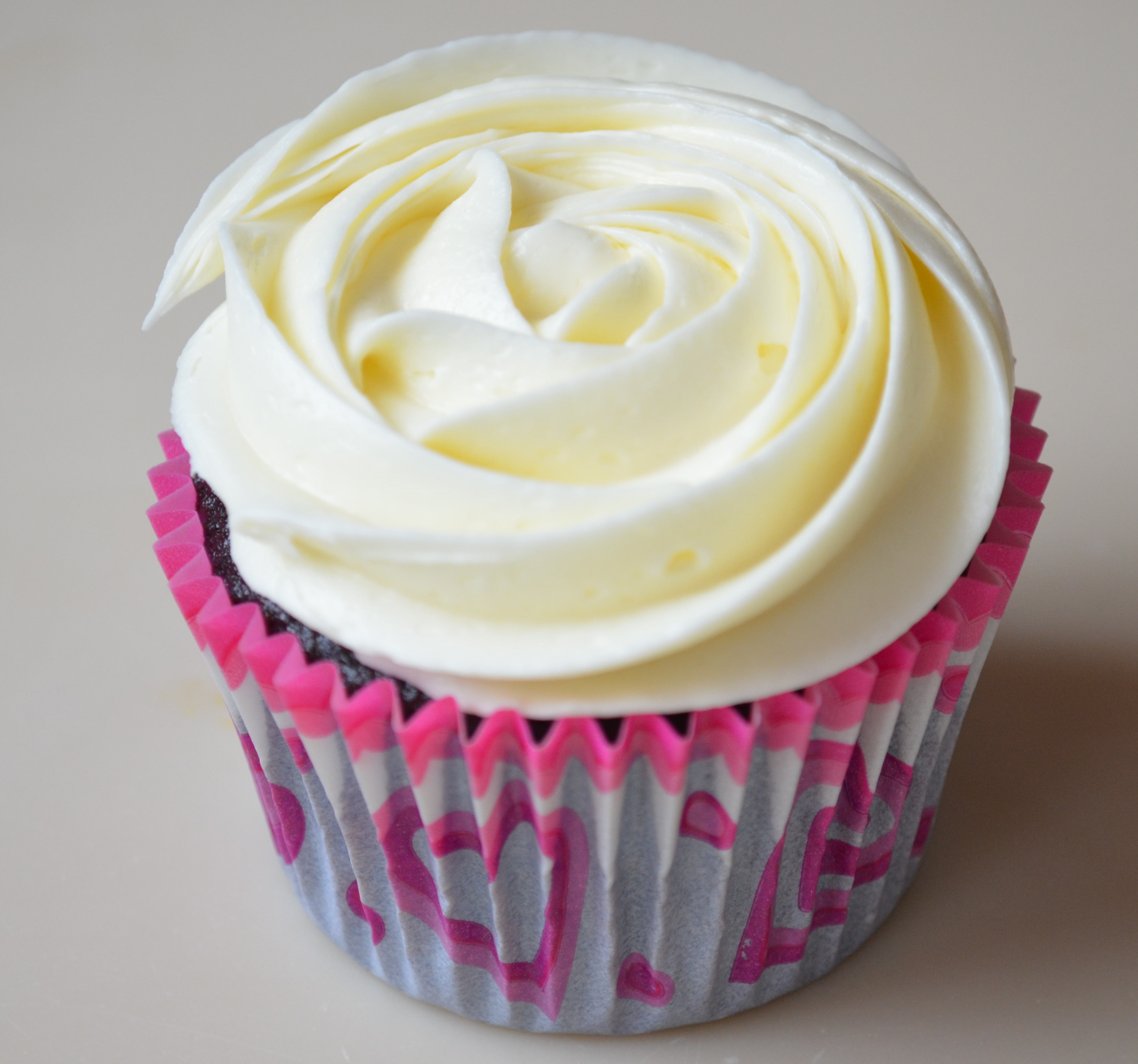 Chocolate cupcakes make a good stand in for a box of chocolates. The addition of the white chocolate in the icing makes it a breeze to pipe. I’m not a really big white chocolate fan, but I really liked how it tasted in this icing recipe.