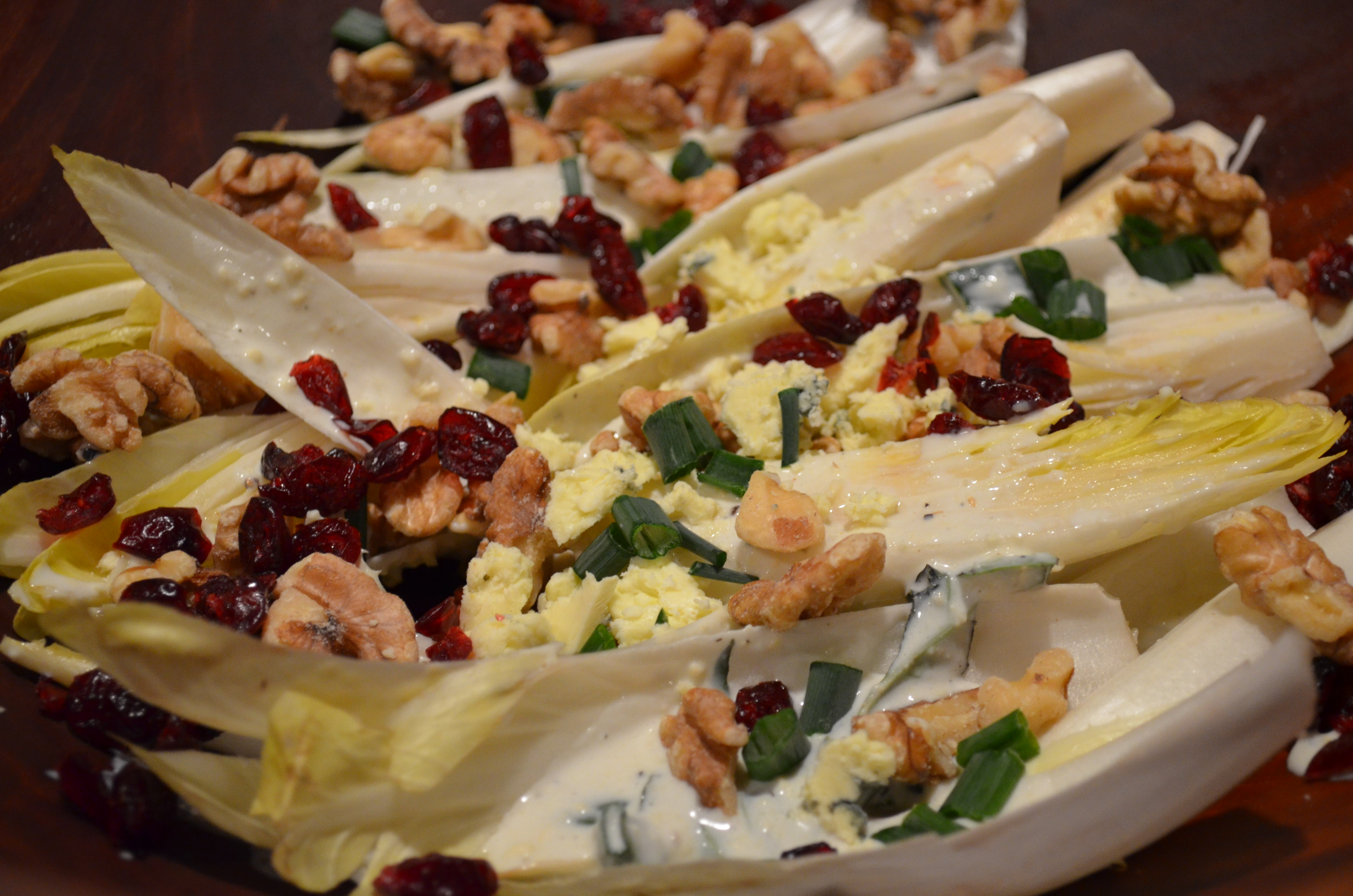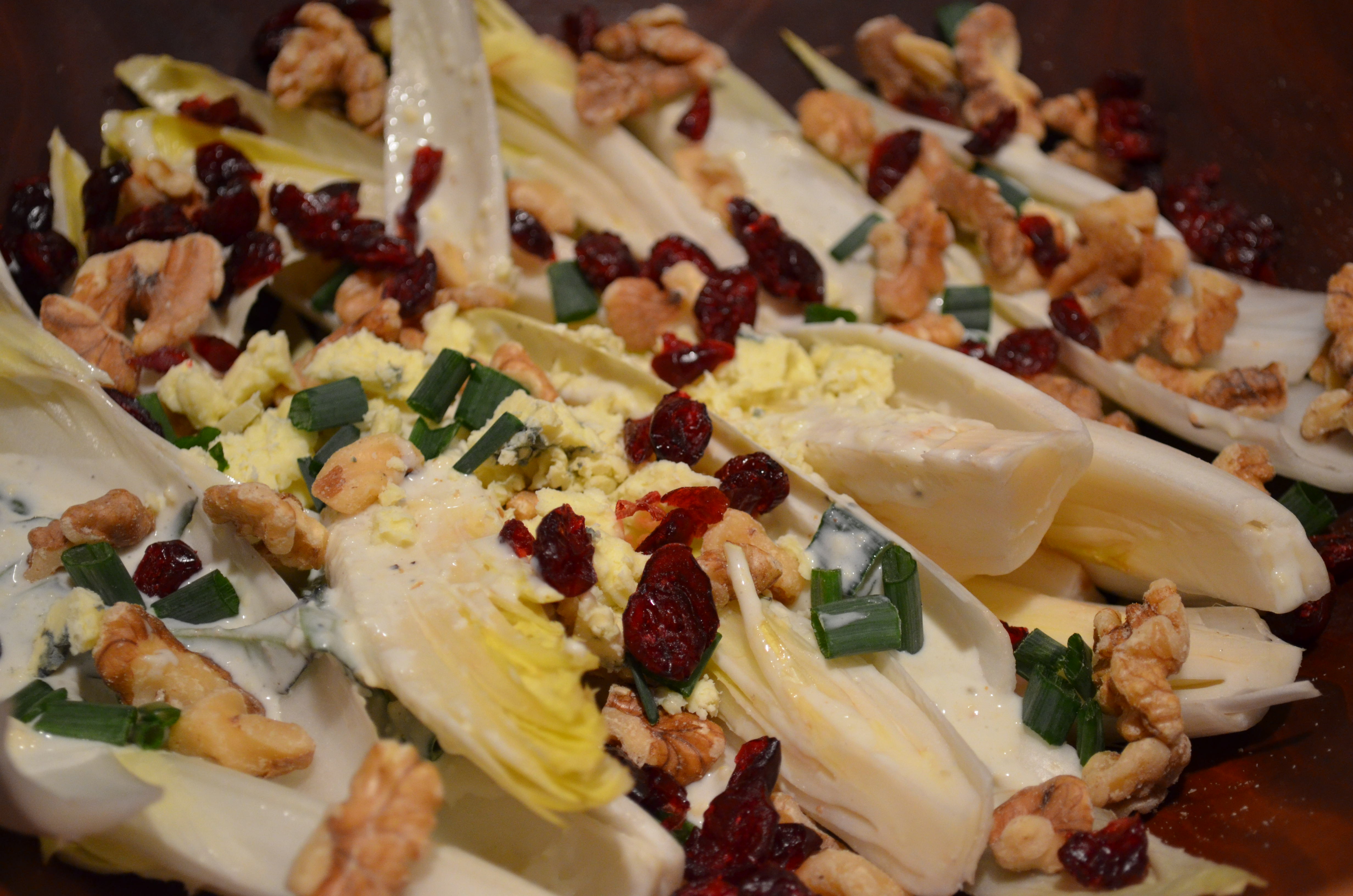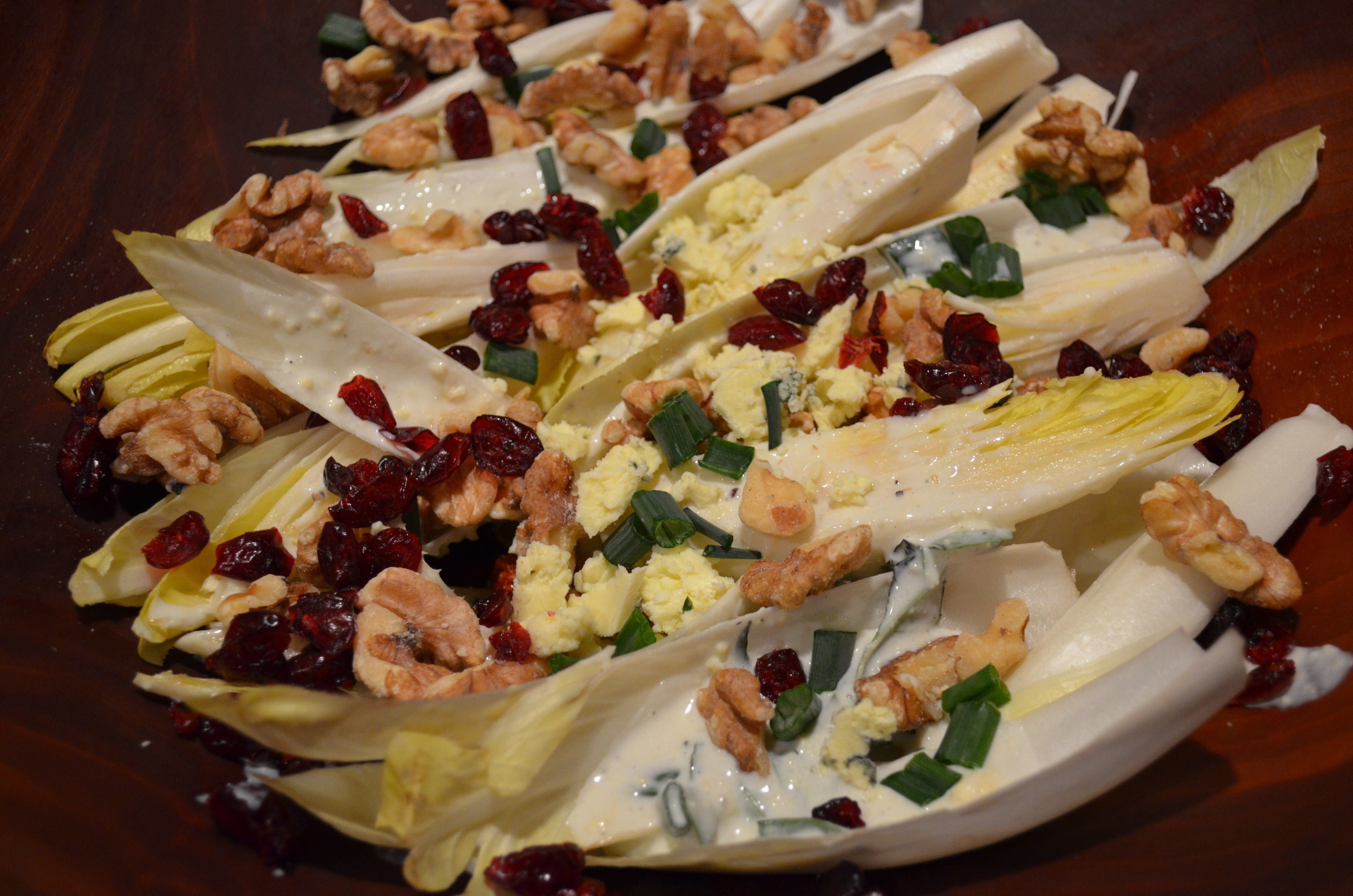 2. Slice the 4 heads of endive lengthwise; toss with the dressing. Top with toasted walnuts, dried cranberries and more blue cheese and chives.