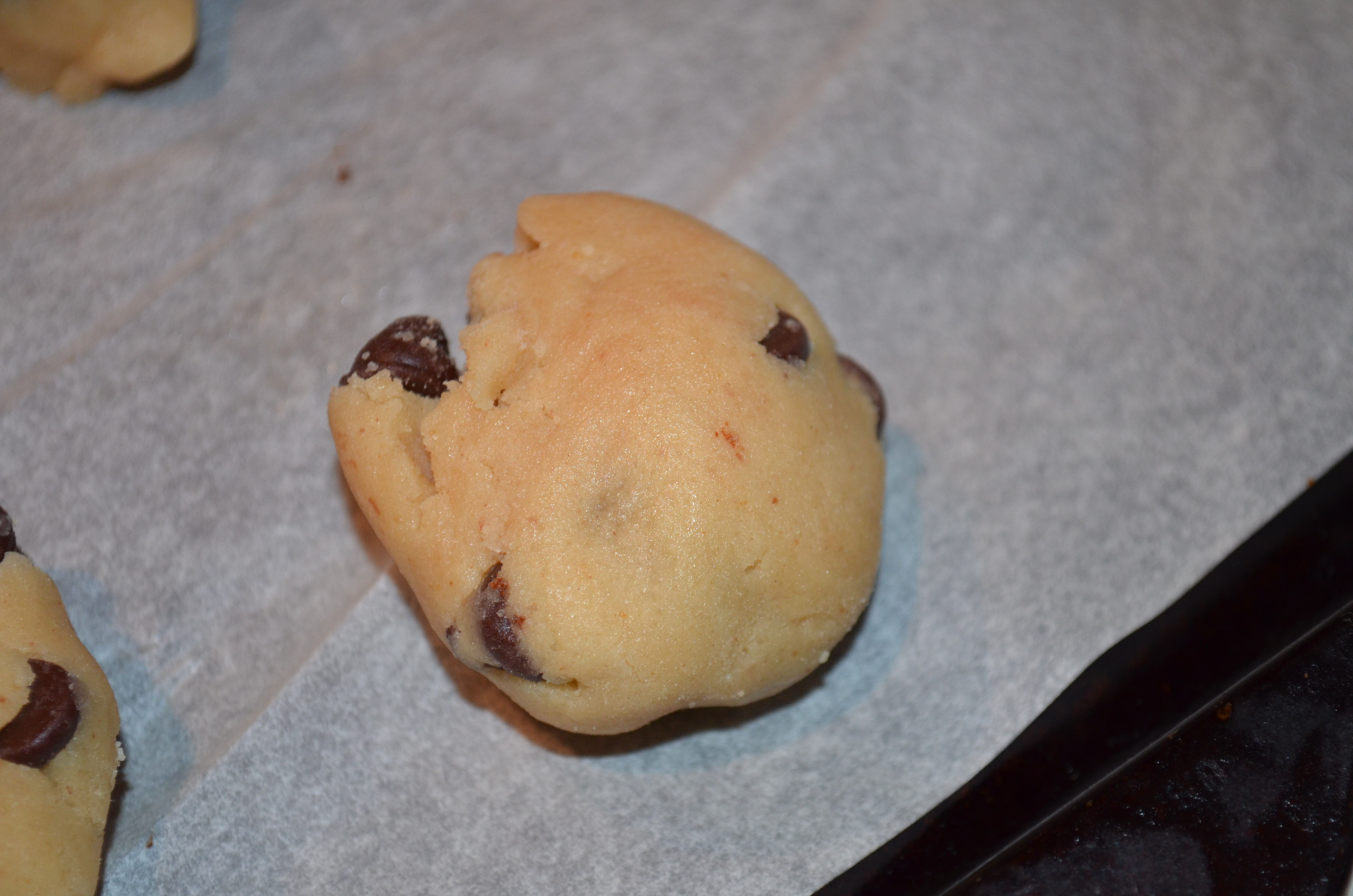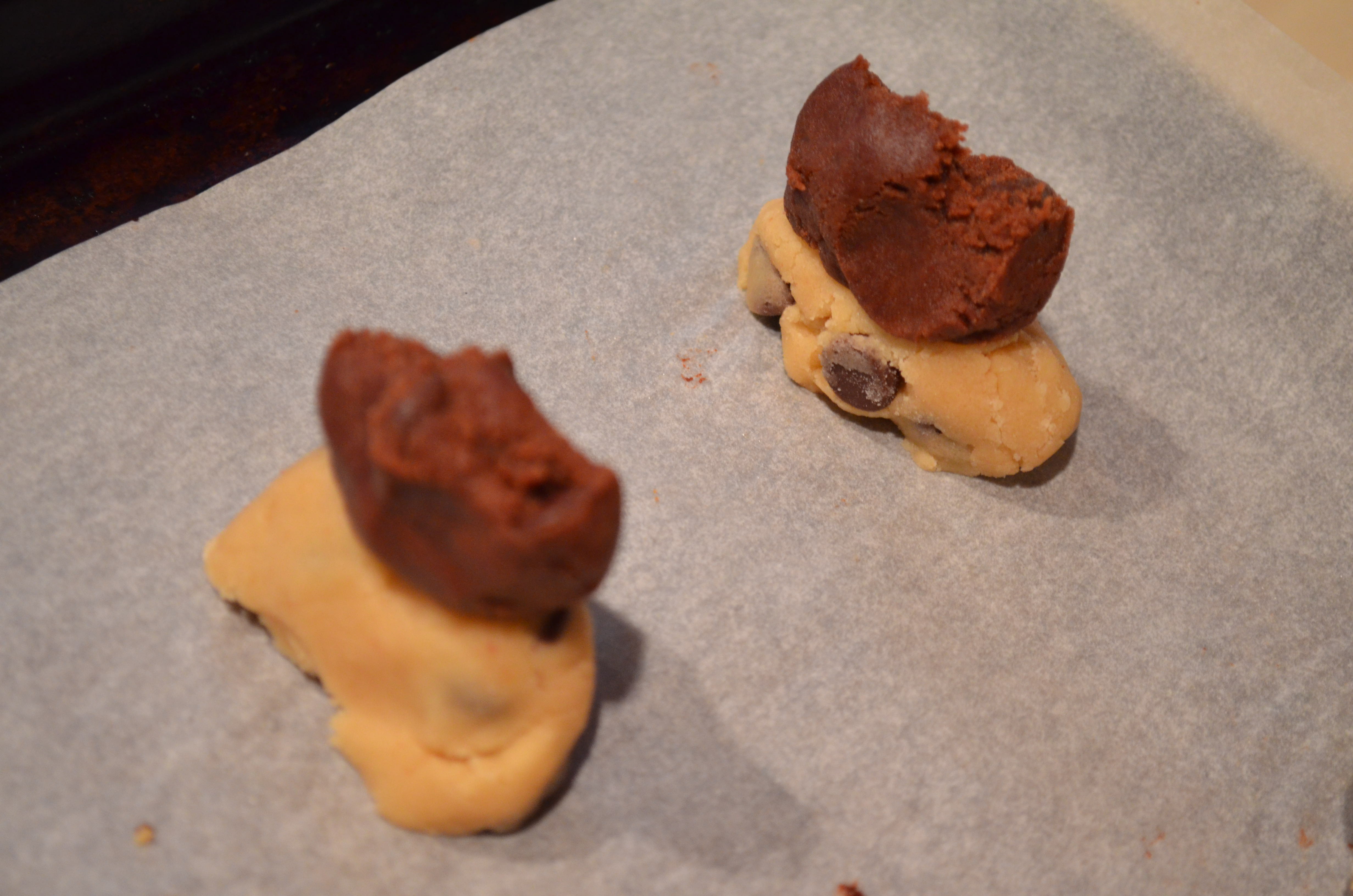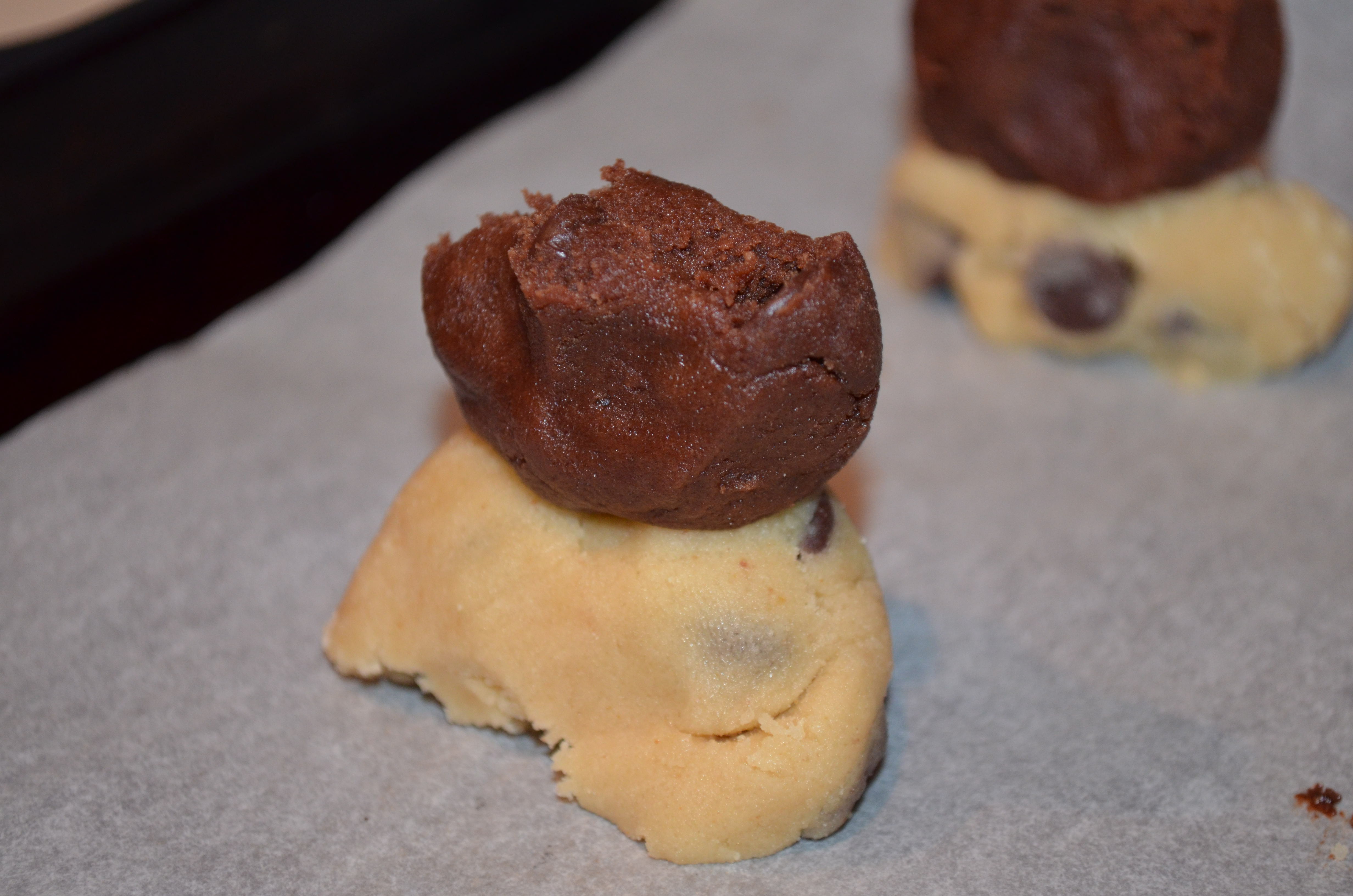 7. Roll both doughs into 12 balls (about an inch thick) so you end up with 24 balls. Pull each ball apart with your fingers. Take one chocolate chip half and one double chocolate half, placing the round ends together with the rough edges out. Place dough, rough-side down, on a parchment lined baking sheet about 2 inches apart.