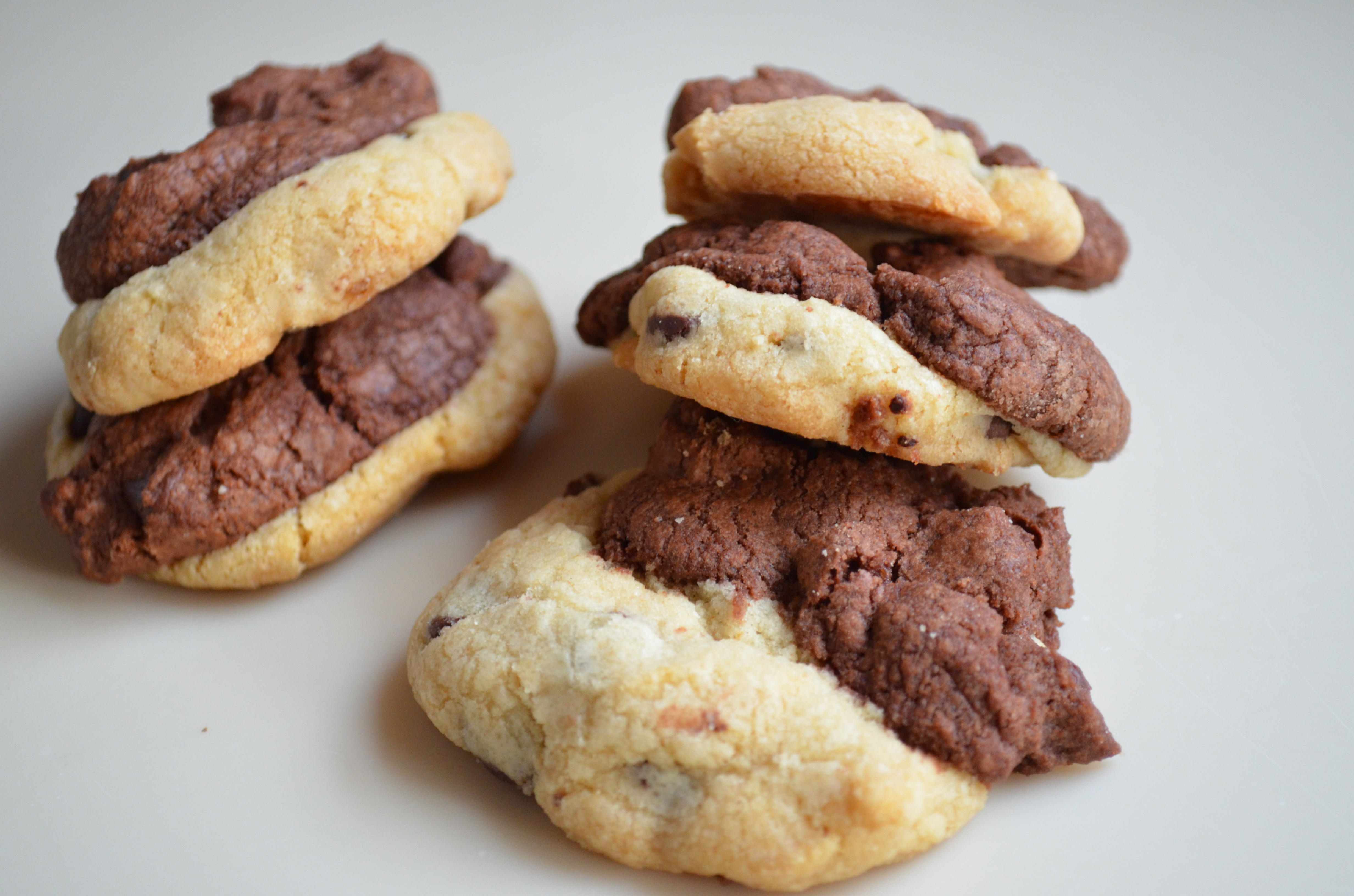 A cookie on top of a cookie. A black and white version of chocolate chips. Jumbo Yumbo.