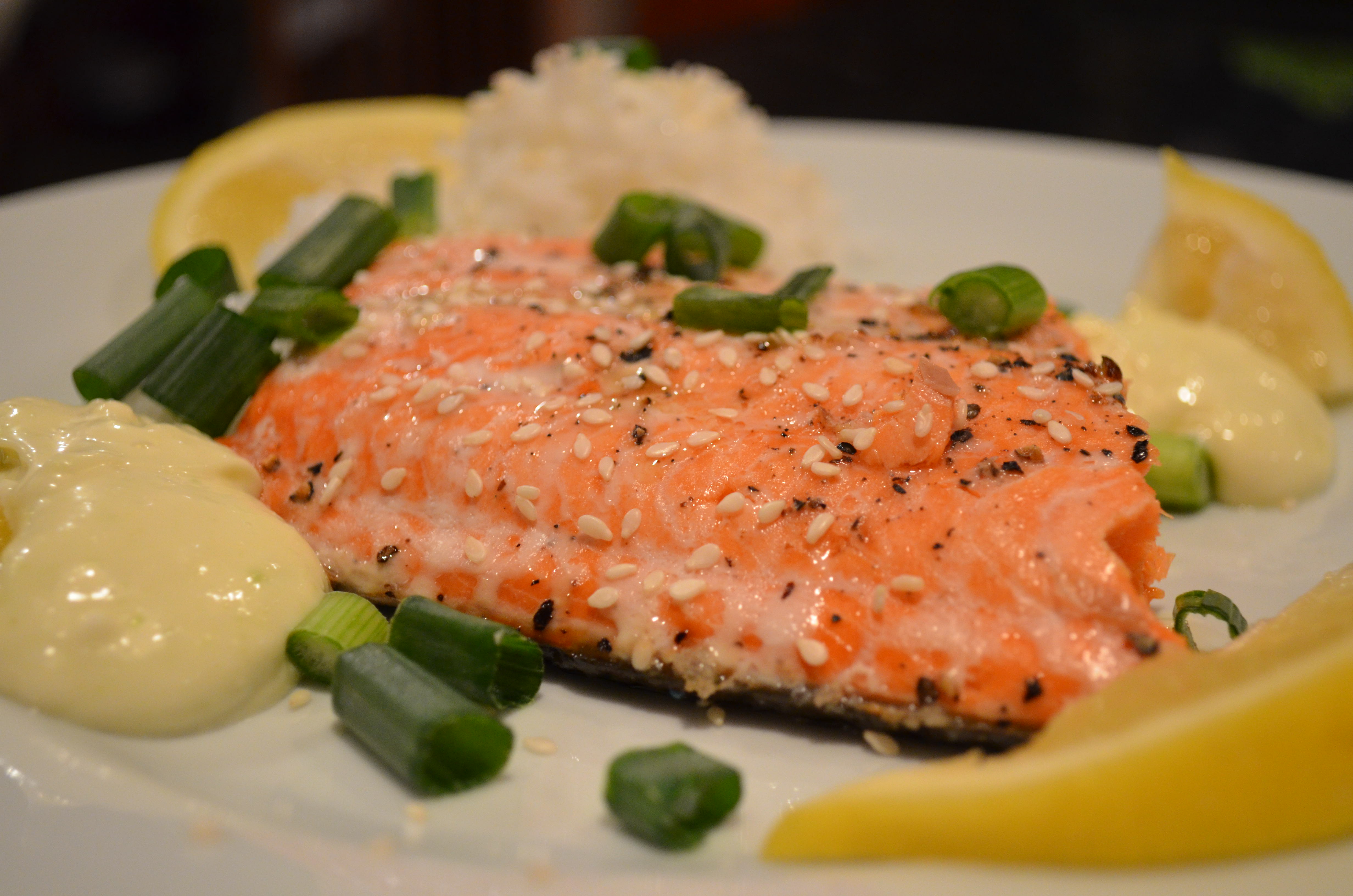 Simple, elegant and flavorful. The salmon, with hints of sesame, is truly fine with the spicy wasabi mayonnaise. Splash some lemon juice over and serve with rice. Perfect.