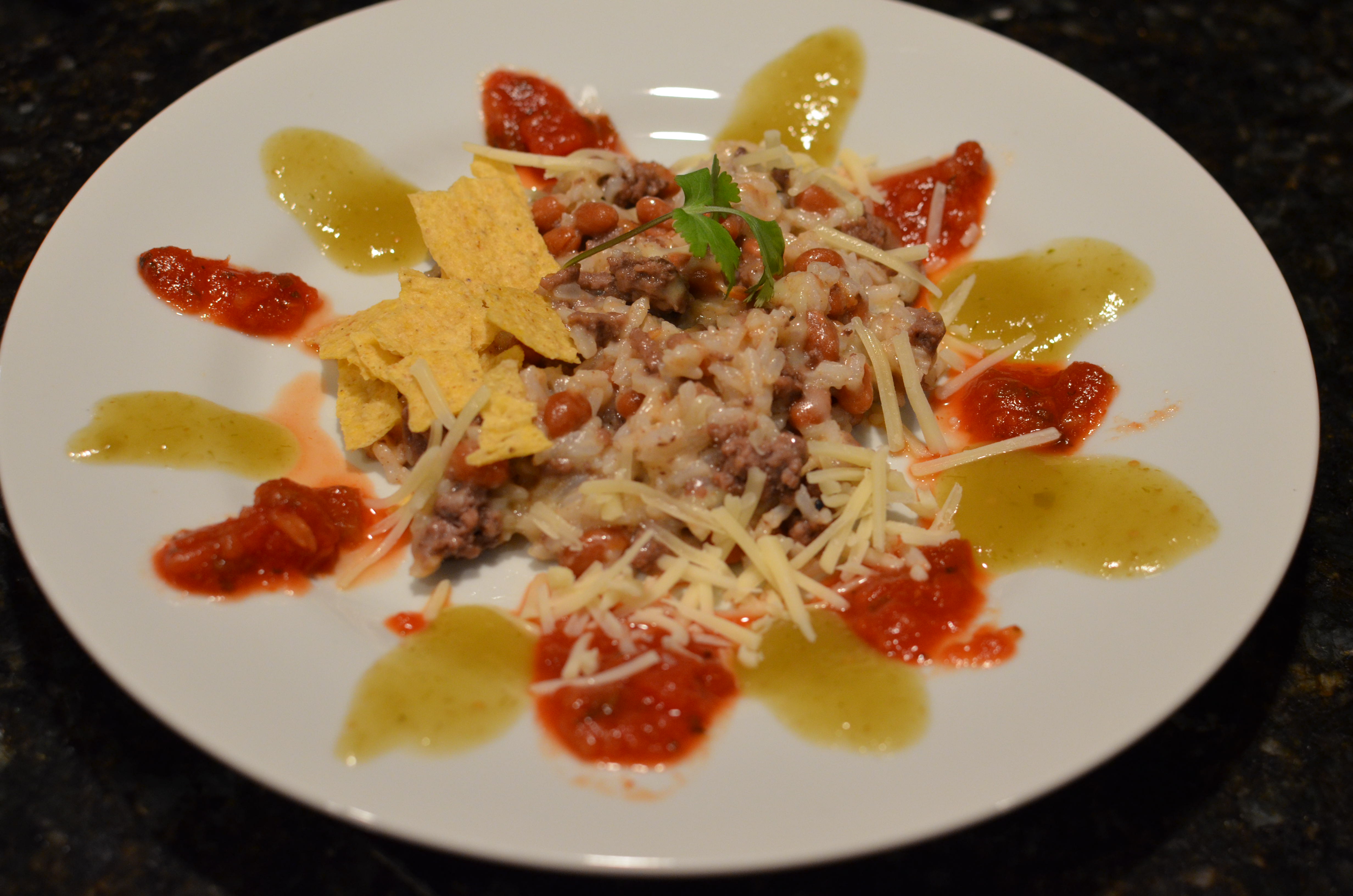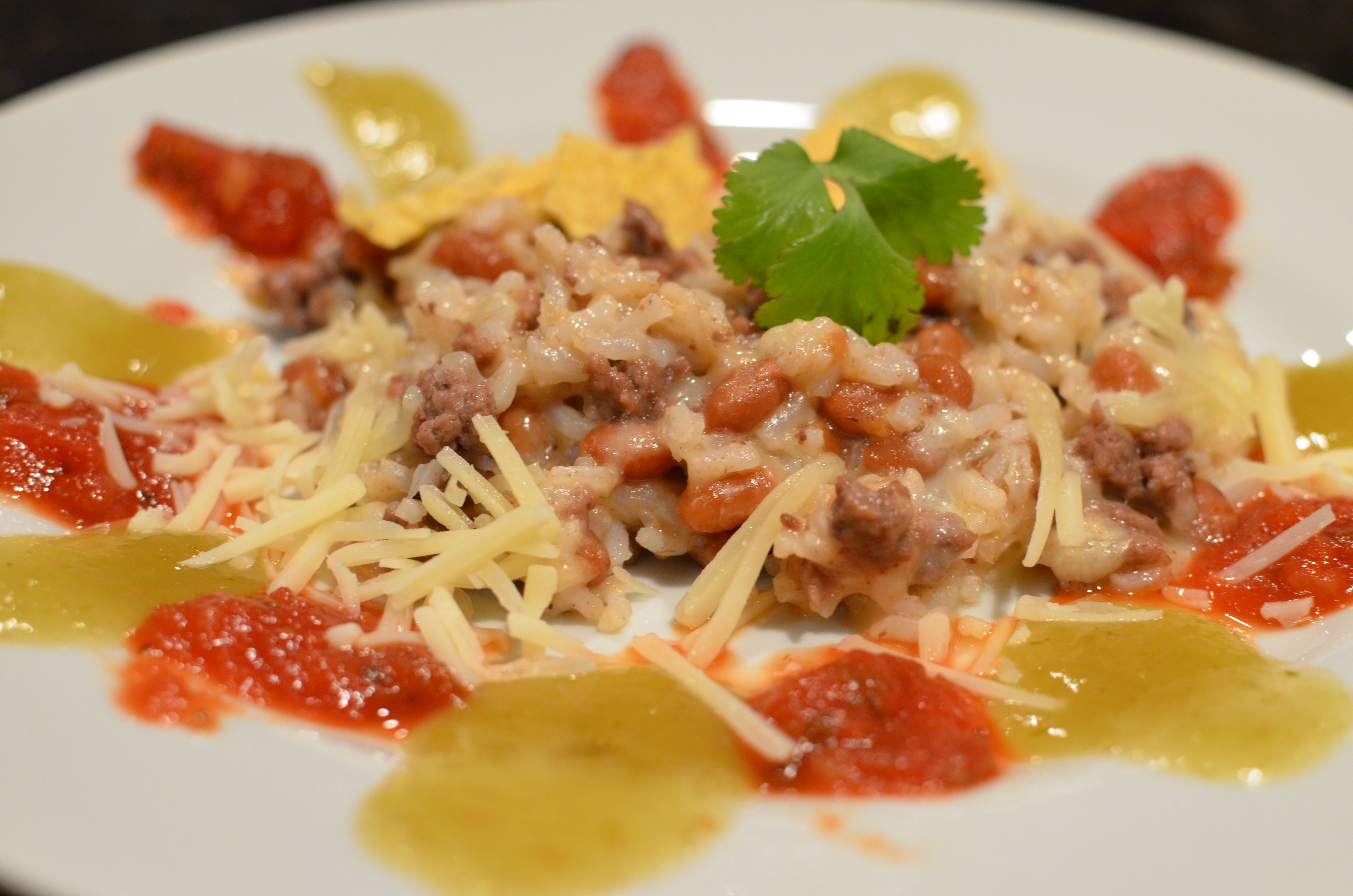 Back to the Cheesy Beefy Beans And Rice. As I said, super simple to make. To glam up the servings a bit, I alternated the two salsas around the edge of the plates. Looked good. Tasted better.