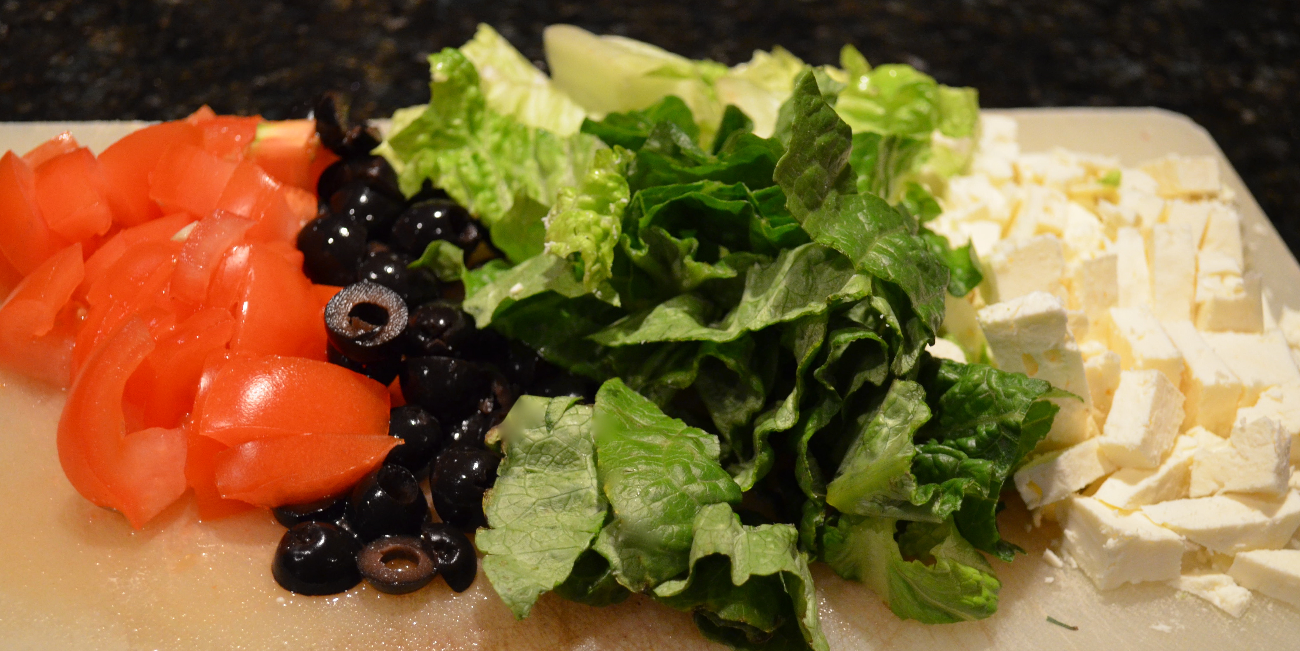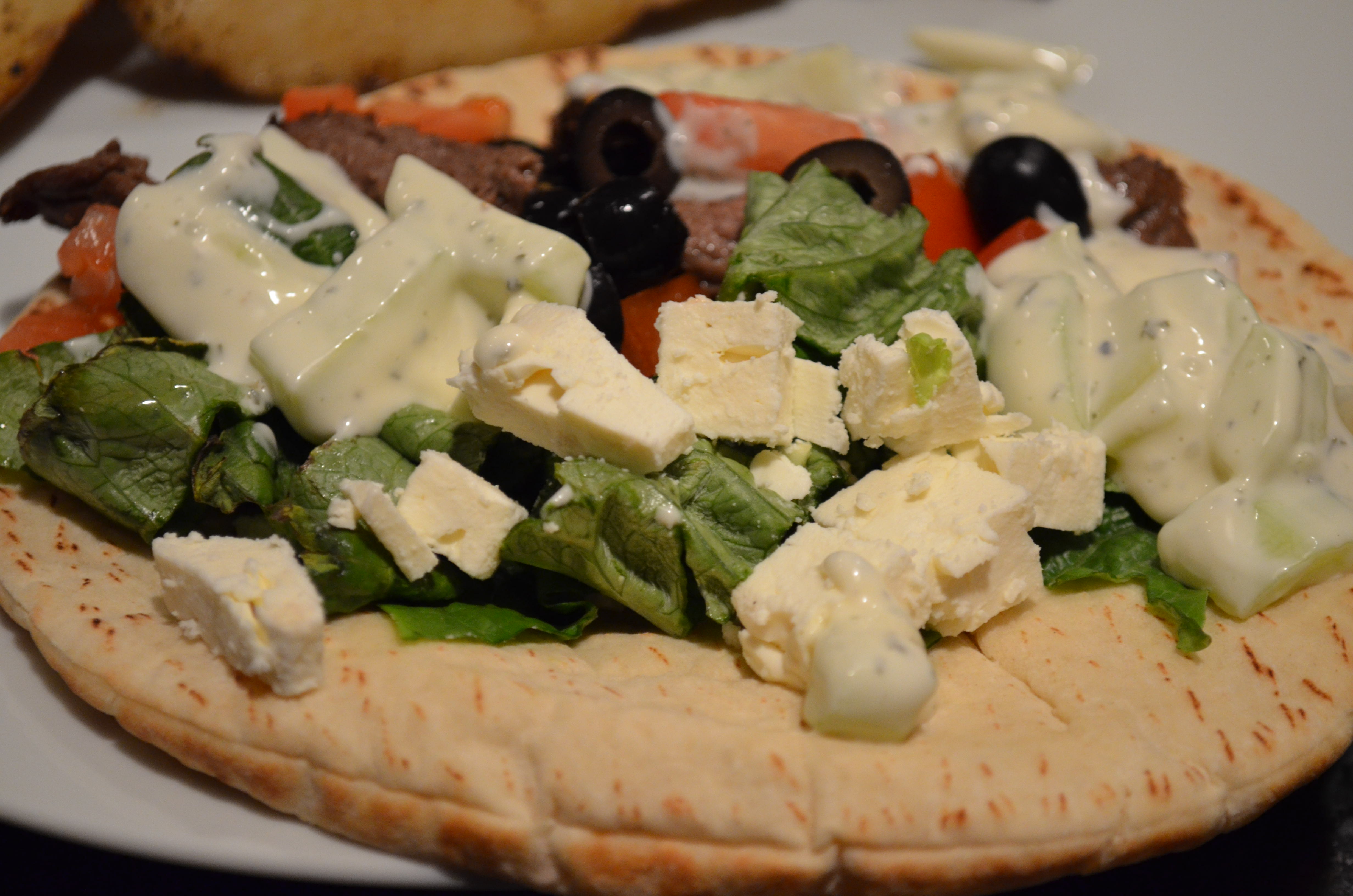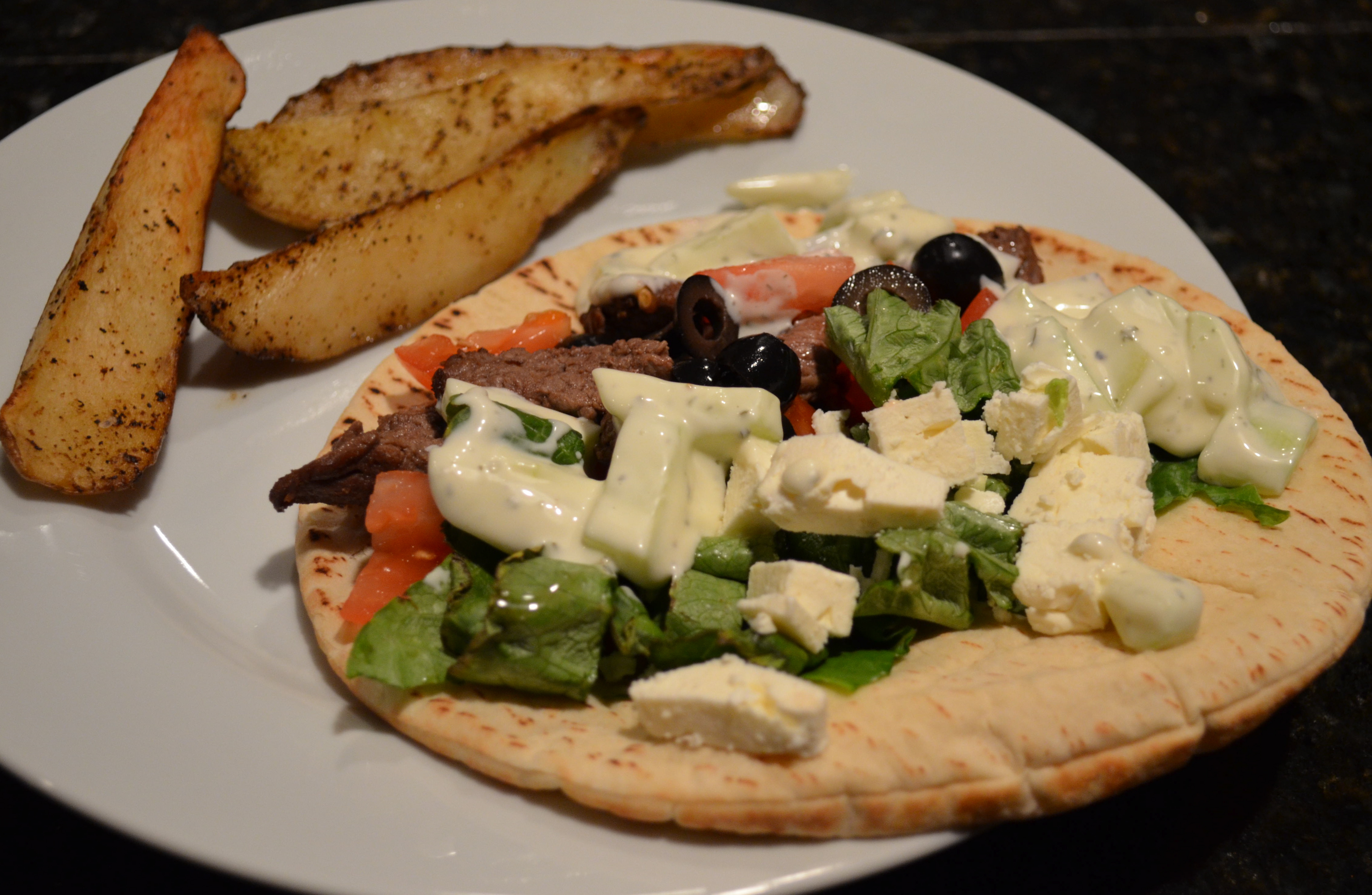 3. Layer half of each pita with steak, tomato, olives, onion, cheese, lettuce and dressing mixture. Fold each pita over filling.