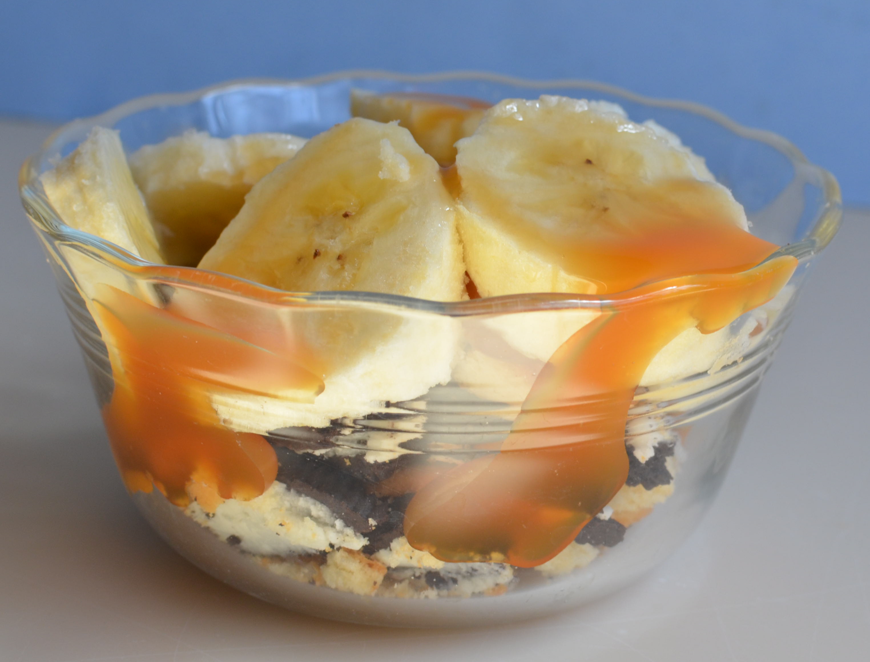 1. Divide the crumbled biscuits between 2 x 250ml ramekins. Lay the sliced bananas on top and drizzle with the toffee sauce.