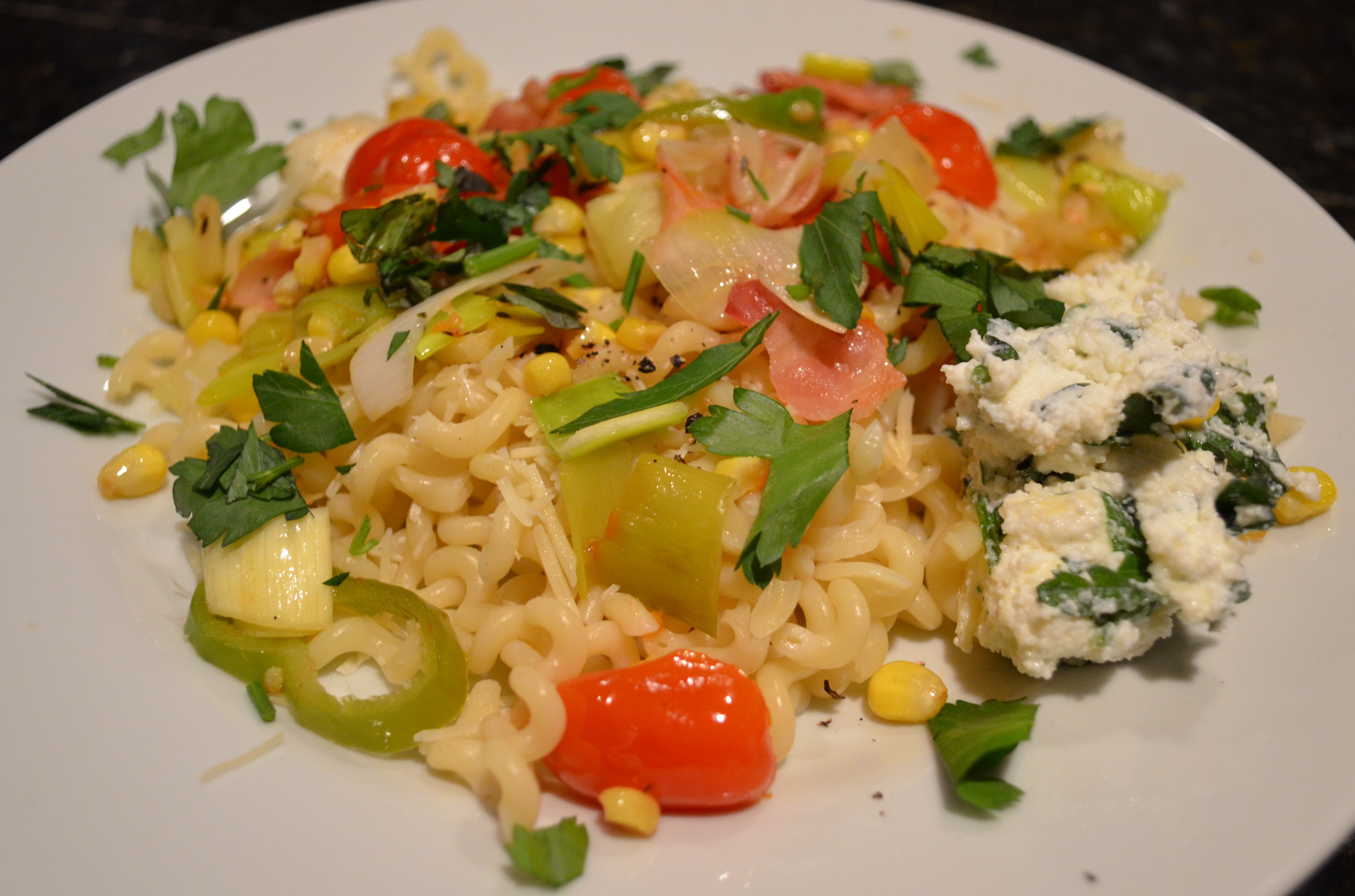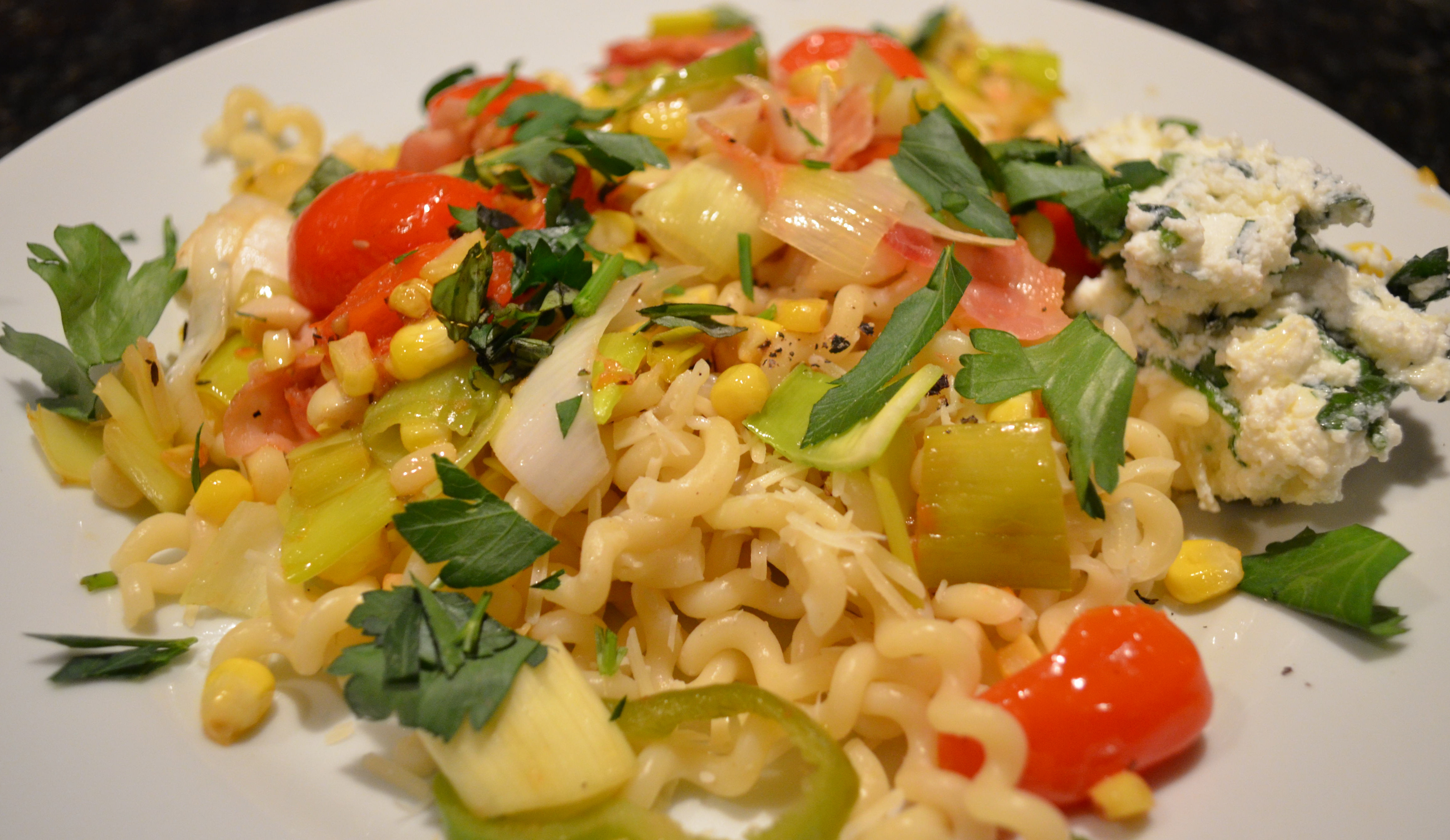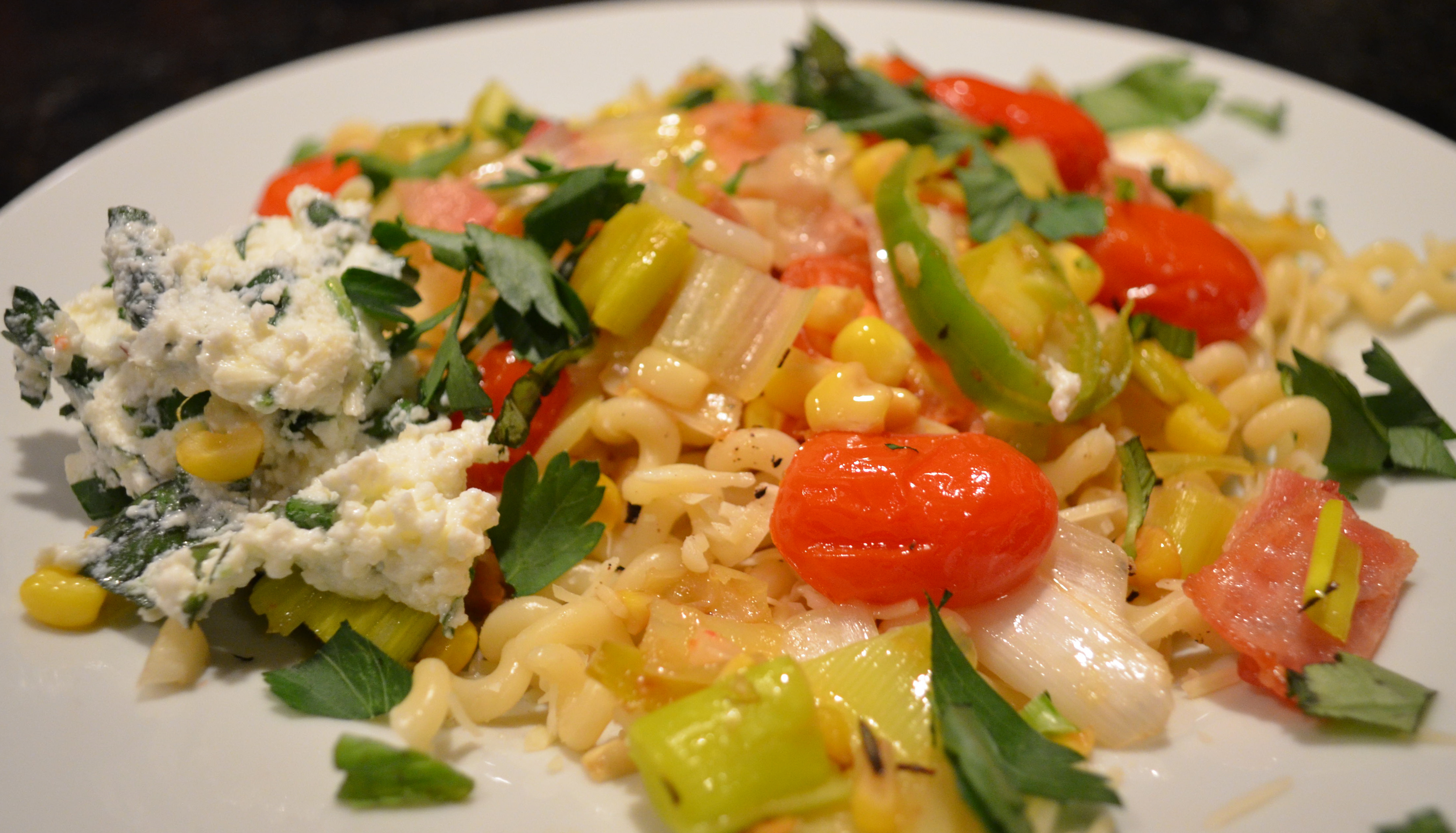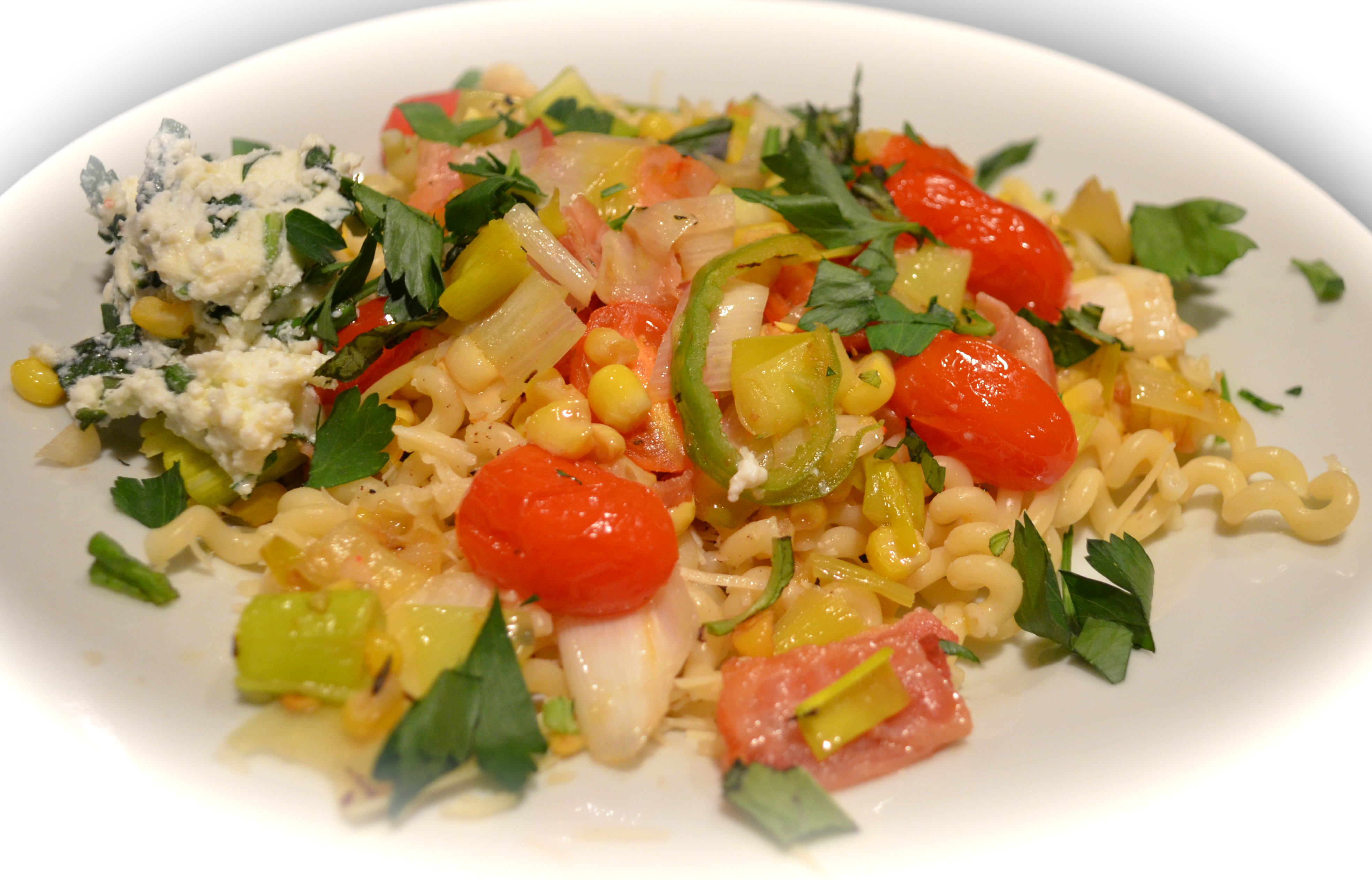 BLT Pasta, in this case Bacon, Leek and Tomato is so good scattered with fresh corn and fresh herbed ricotta on the side. The perfect warm weather dish.