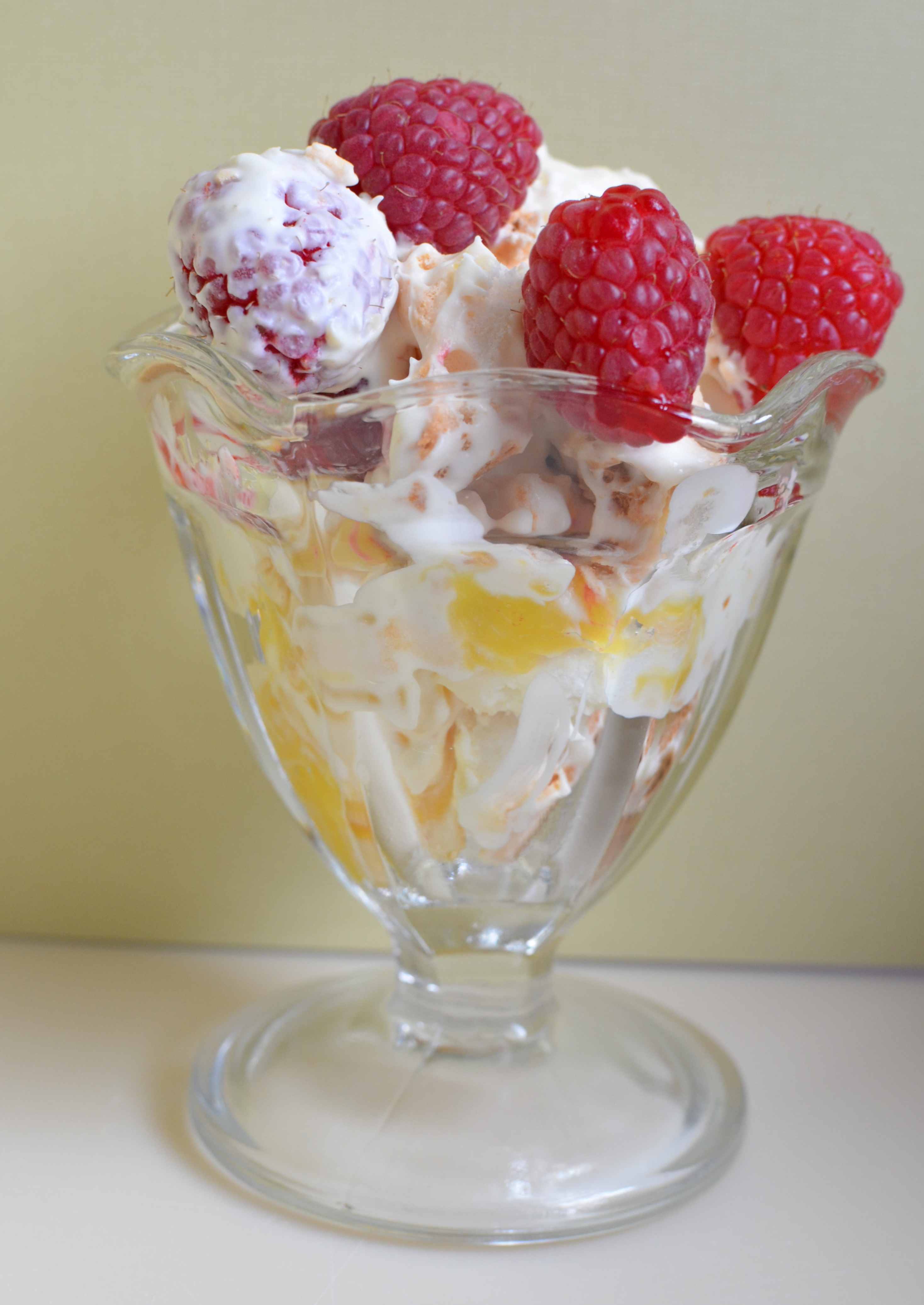 2. Gently fold in about 3/4 of the raspberries, the lemon curd and the broken meringues. Make sure that some of the raspberries break up, leaving a ripple effect.