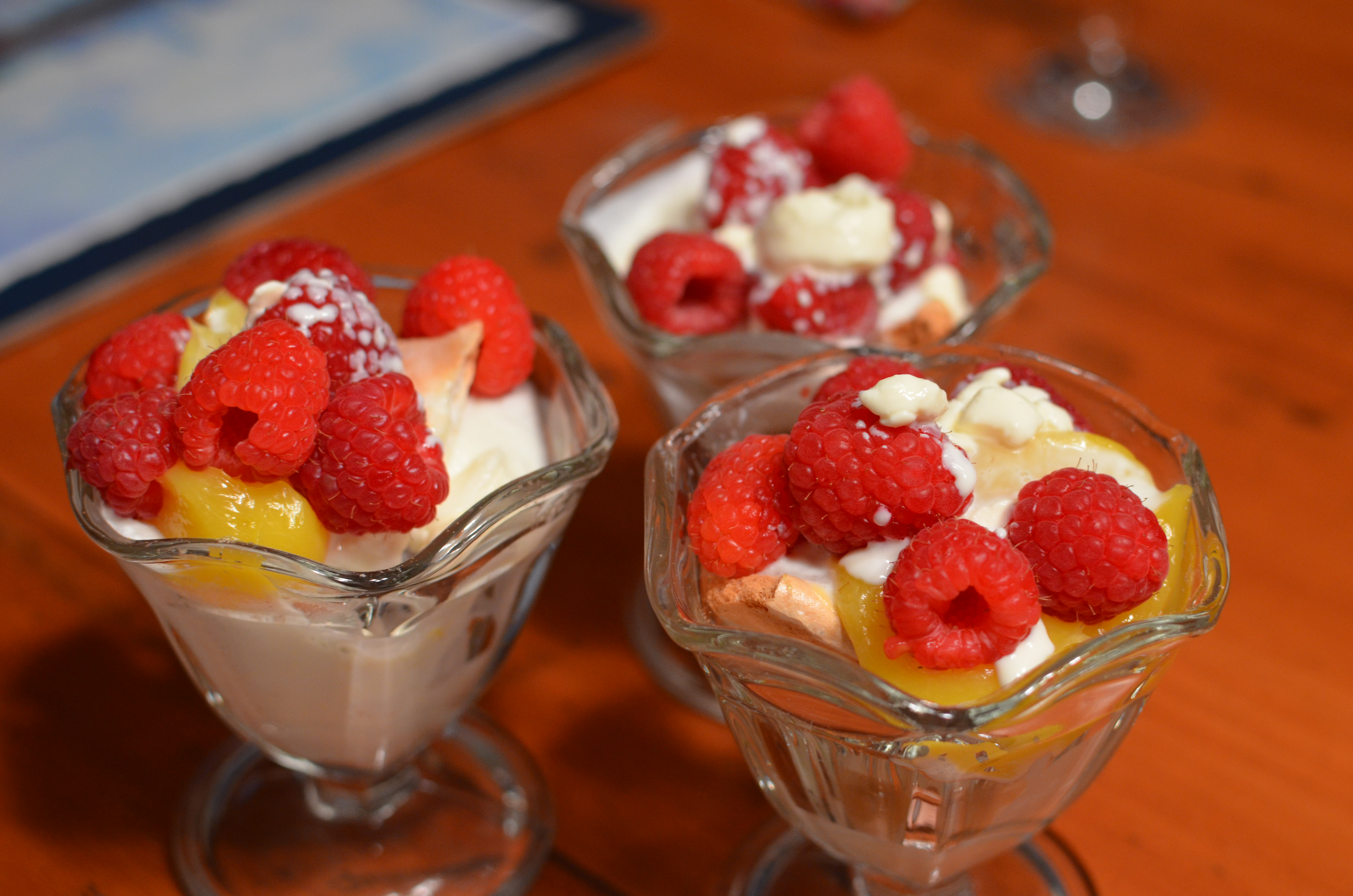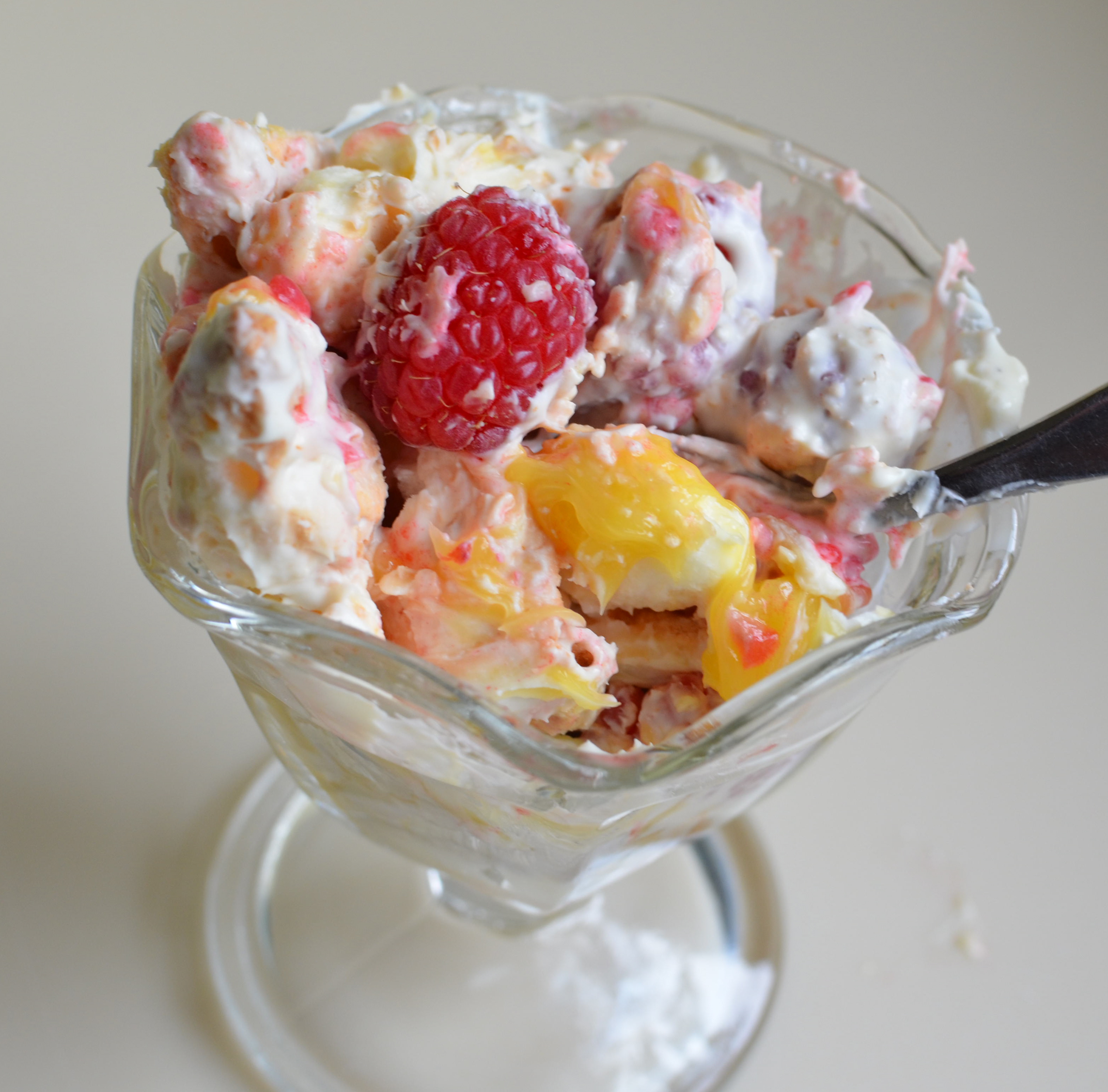 Tart yet sweet raspberries, crisp but getting soft meringue, the tang of lemon curd…all swirled together with some whipped cream.