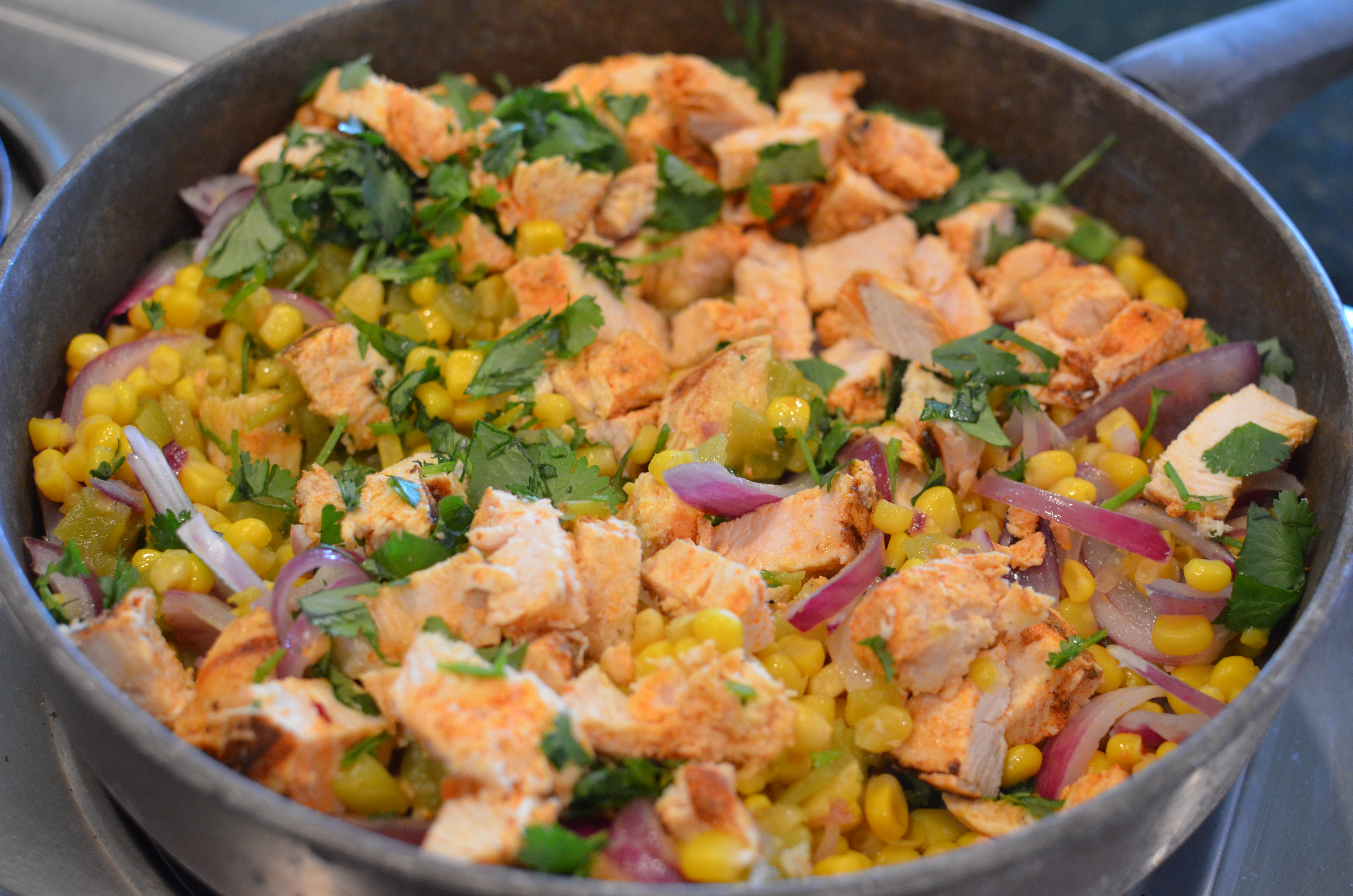 2. For the filling, in a large skillet, heat oil over medium heat. Add onions and corn. Cook and stir until onions are tender, about 4 minutes. Add green chiles. Cook and stir for one minute more. Remove skillet from heat. Stir in cooked chicken, cilantro, salt, pepper. Mix well.