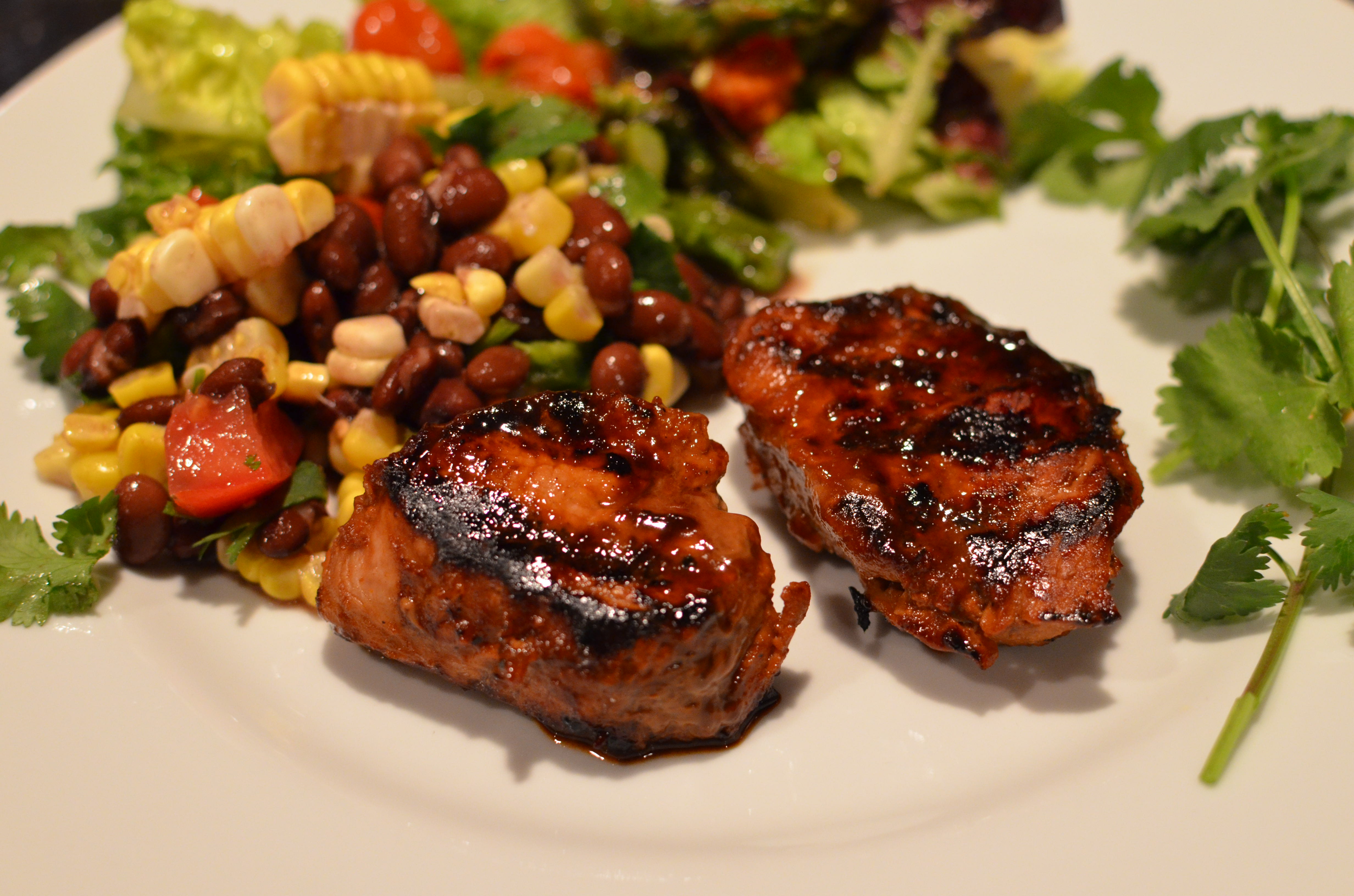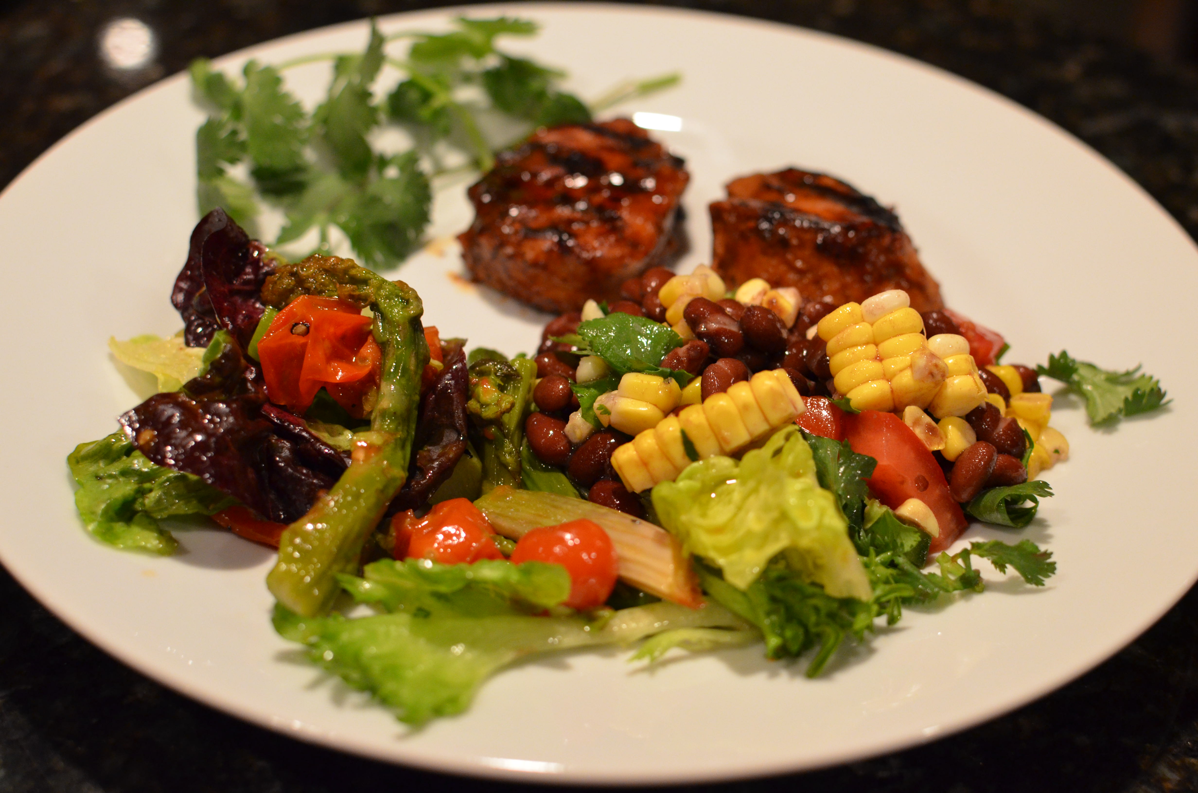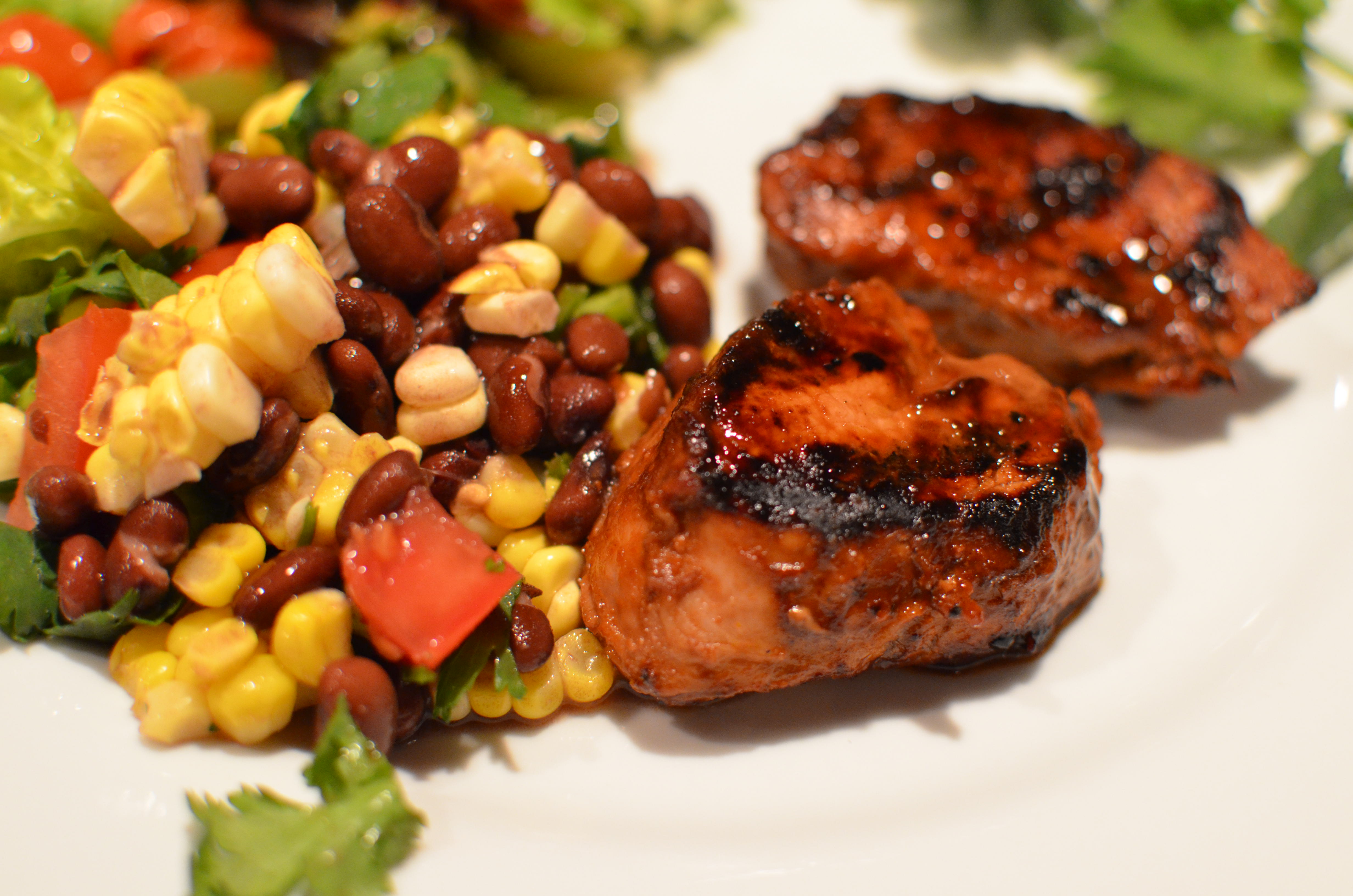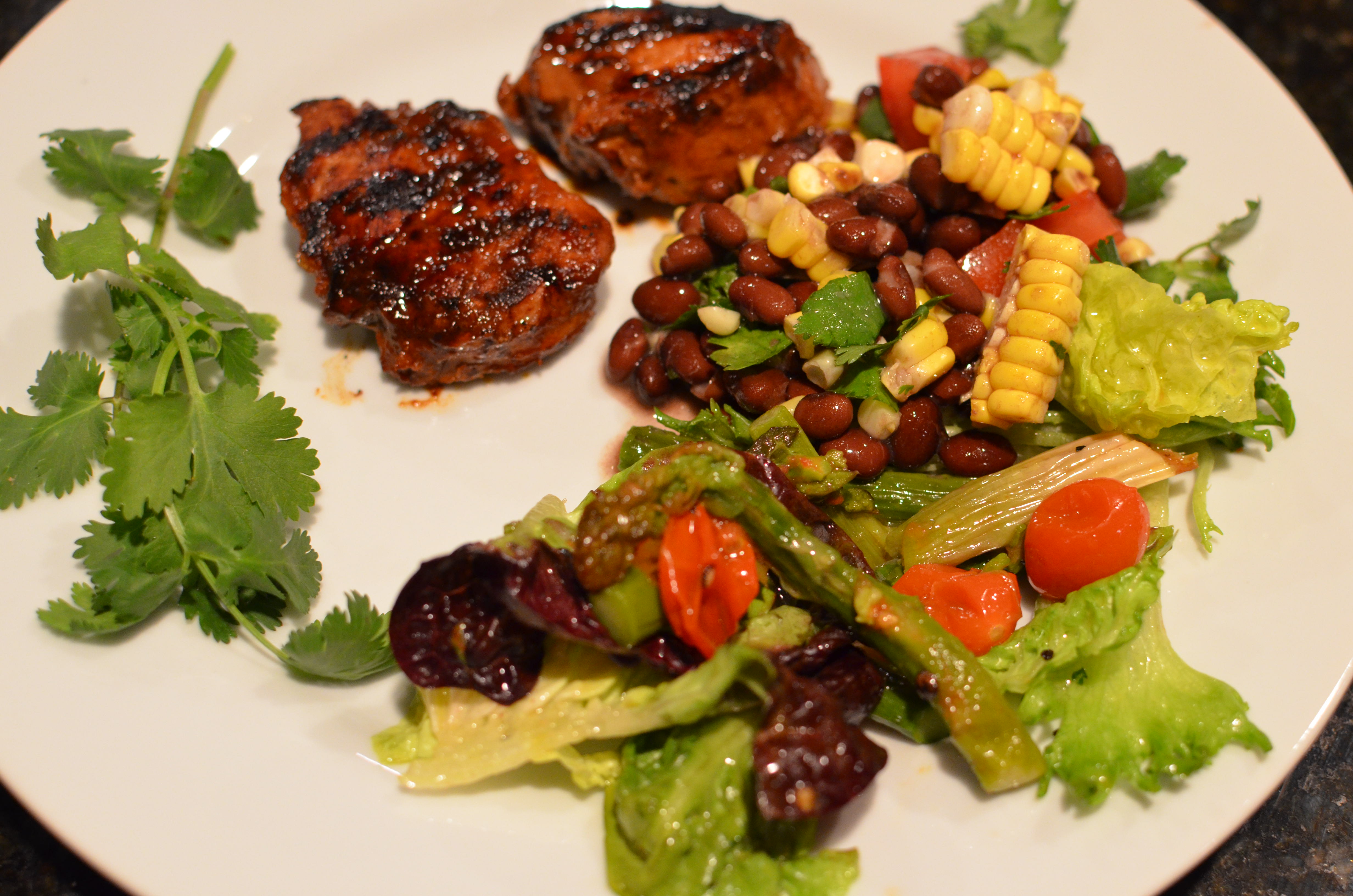 Whip up a batch of this super good tangy, salty and sweet marinade and use it to grill up some pork. The Bean And Corn Salsa is the perfect side and full of crunch and spice. I also had some leftover roasted asparagus and tomatoes from this recipe which I served cold, tossed with mixed greens.