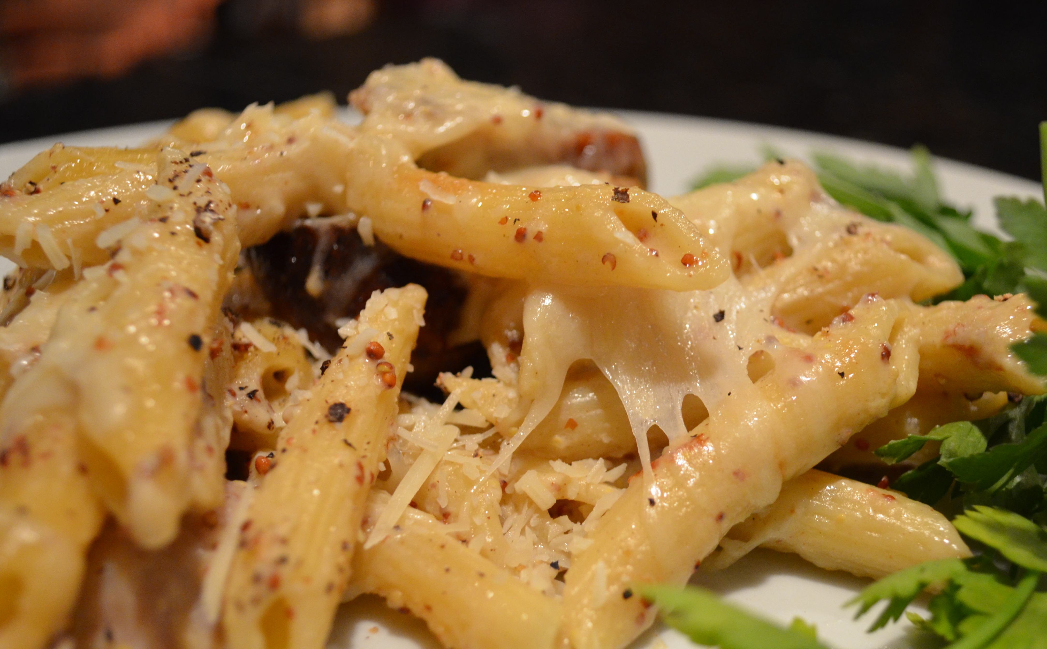 You and he will love this creamy, cheesy, mustardy pasta bake filled with sausage.