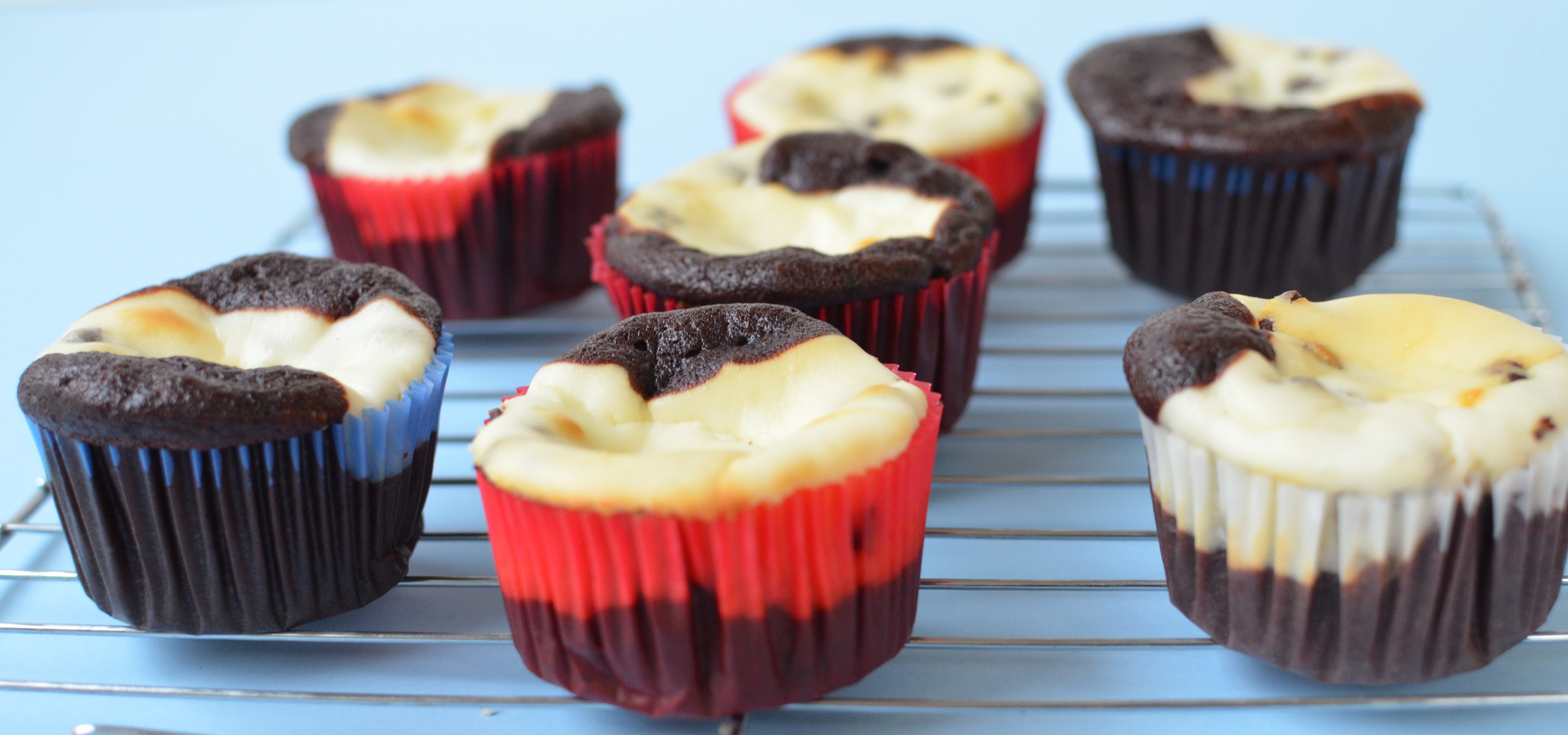To dress up these Black Bottom Cupcakes for Independence Day, I made them in Red, White and Blue liners.