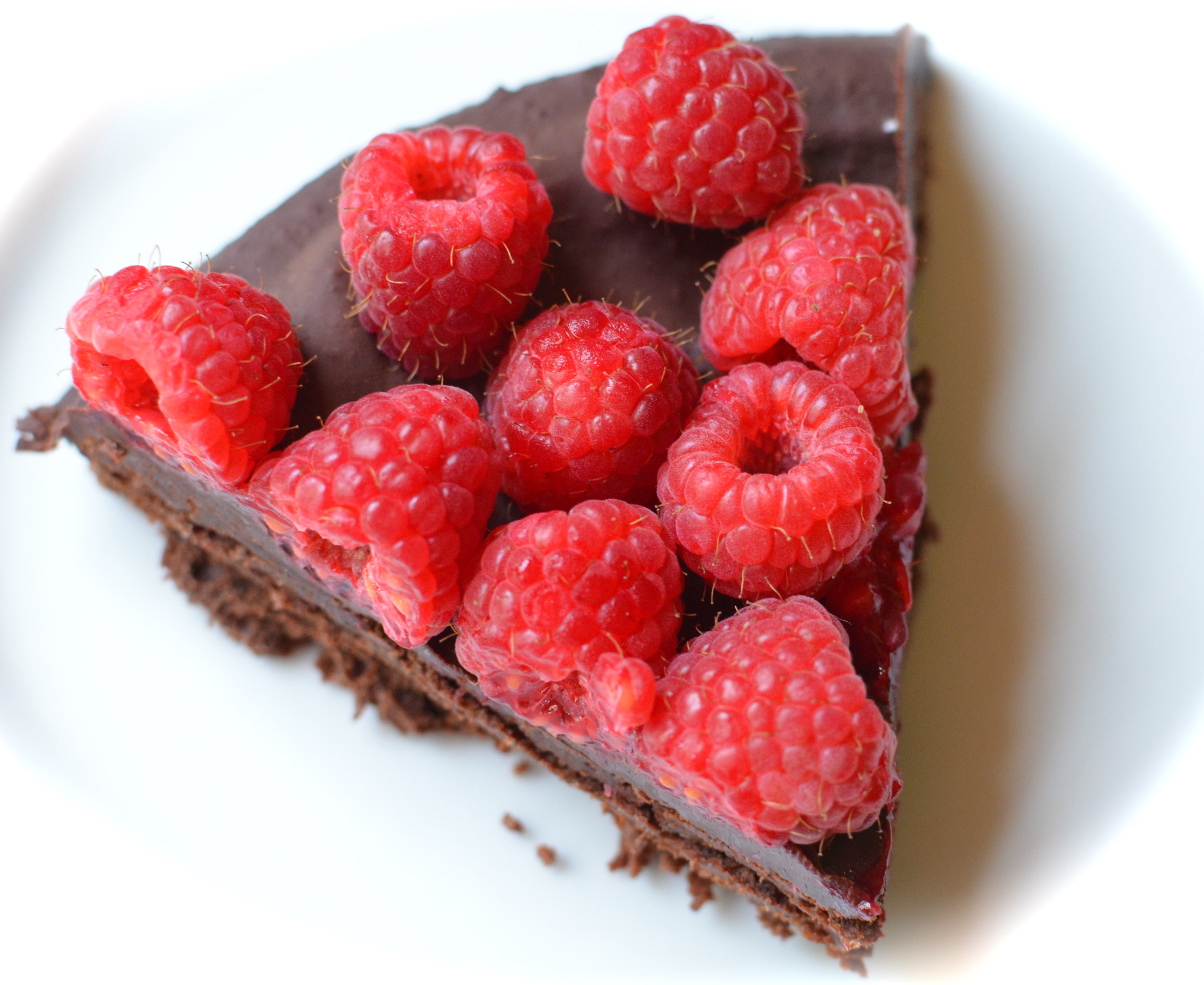 9. Pour ganache on the cake and spread with a metal icing spatula over the top of the cake. Stud the surface with raspberries.