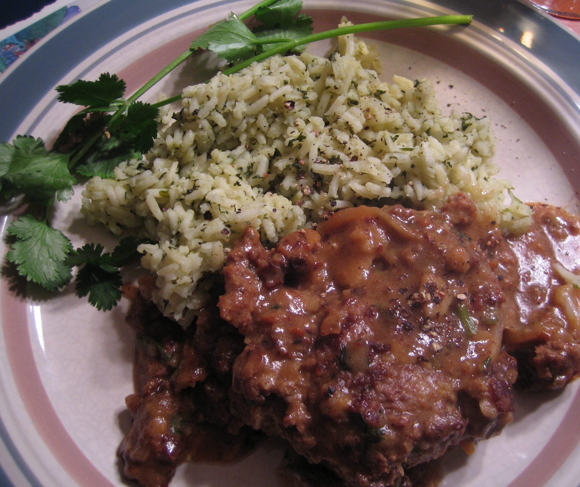 3. Add reserved onion mixture and flour to skillet and cook until flour is golden and fragrant, about a minute. Slowly stir in broth, scraping up any browned bits, and bring to simmer. Return patties to skillet, cover, and simmer over medium low heat for 4 minutes. Remove lid and cook until patties are cooked through and sauce is slightly thickened, 4 to 10 minutes. Season with salt and pepper and serve.
