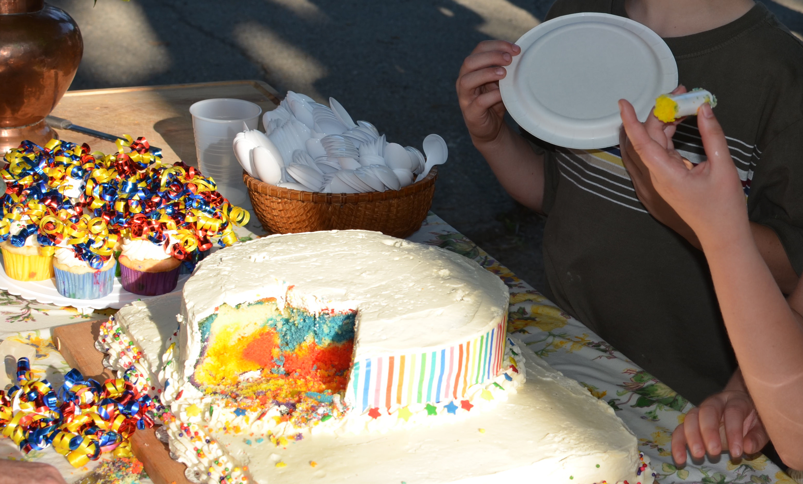 Tiered Rainbow Celebration Cake With Confetti Cupcakes. Make Noise For All Will Be Quiet.