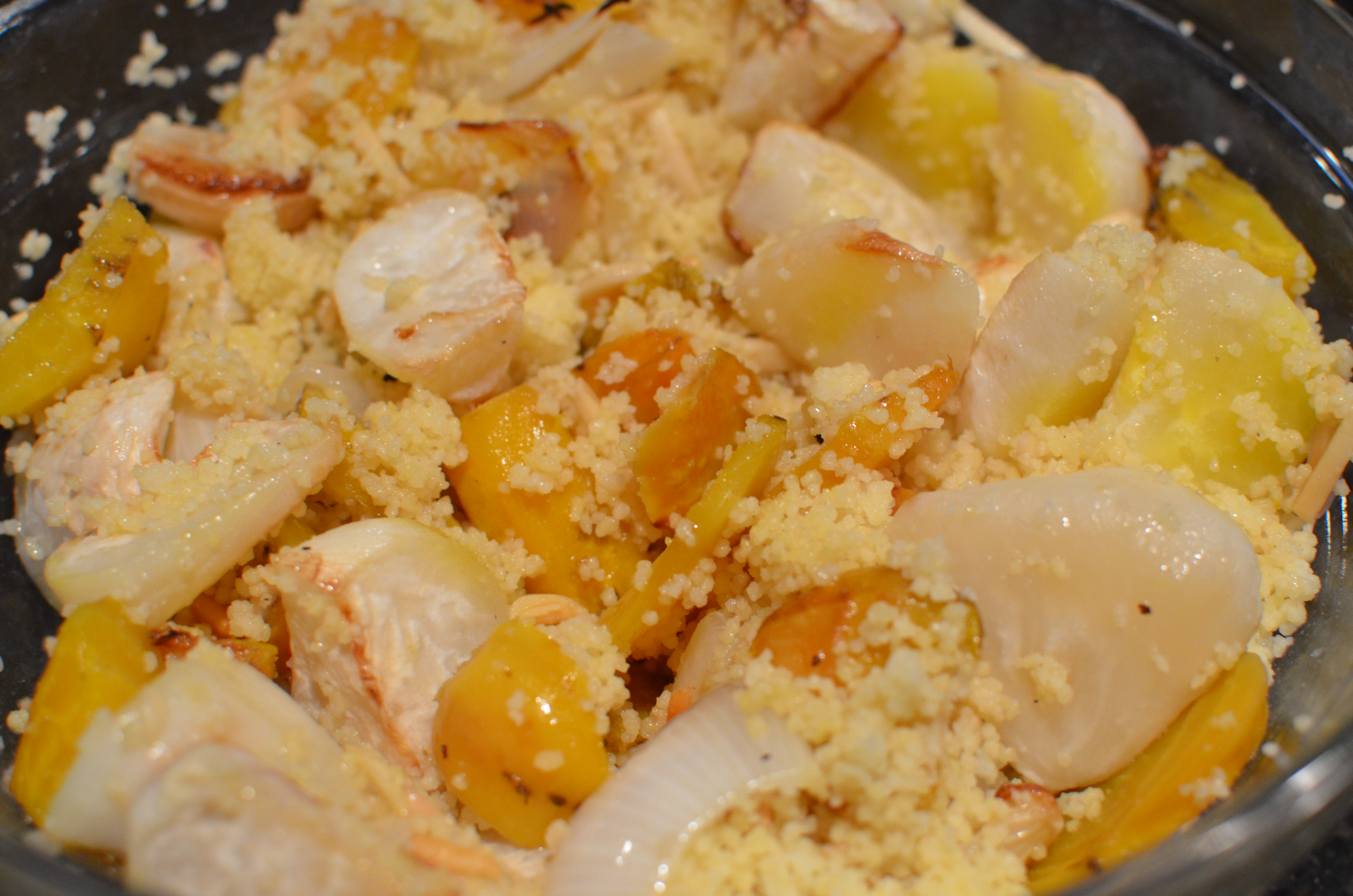 Use your favorite vegetables in the couscous. I had to use up some bell peppers and turnips, but next time I will add some carrots and zucchini for a bigger color punch.
