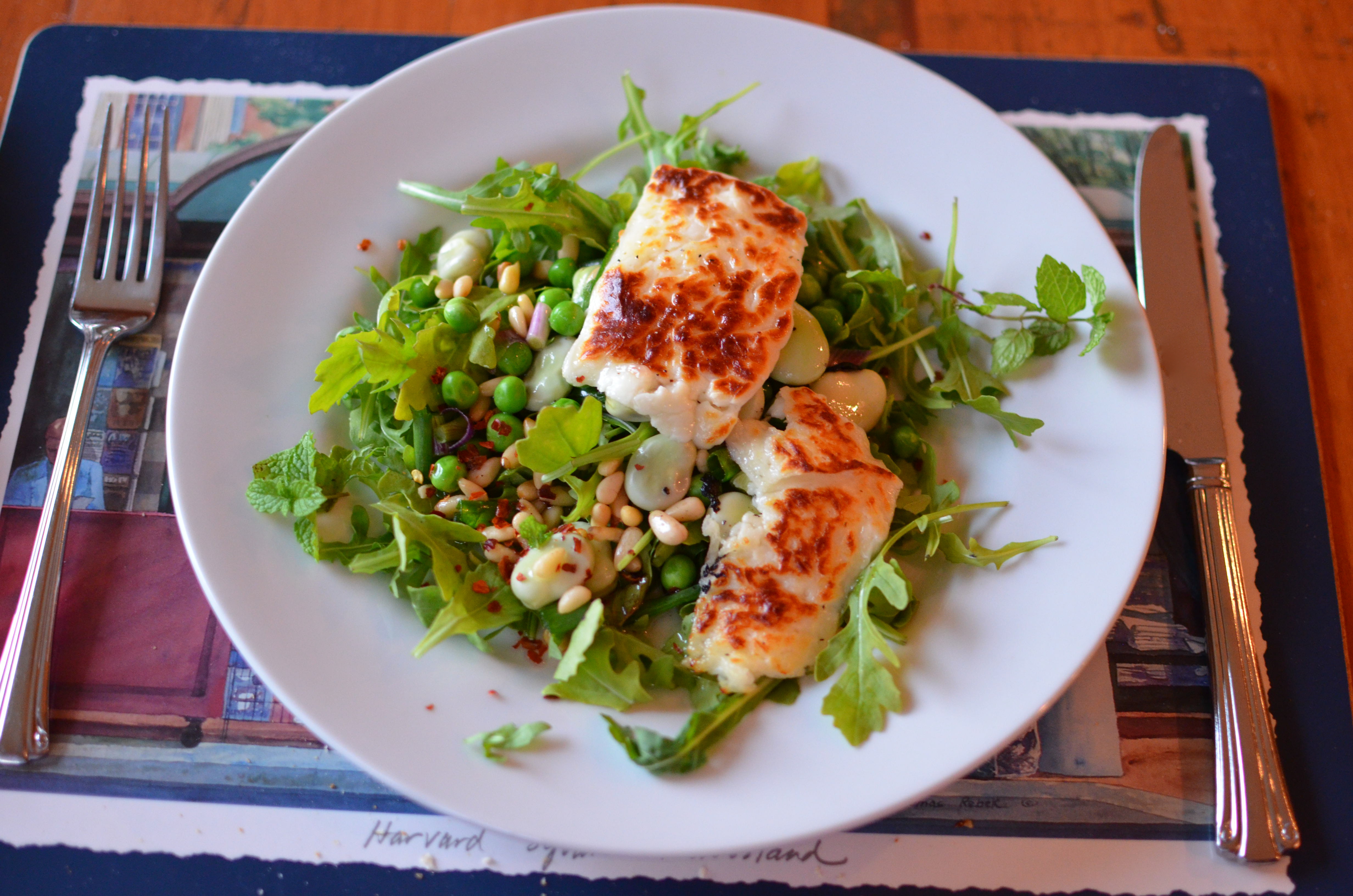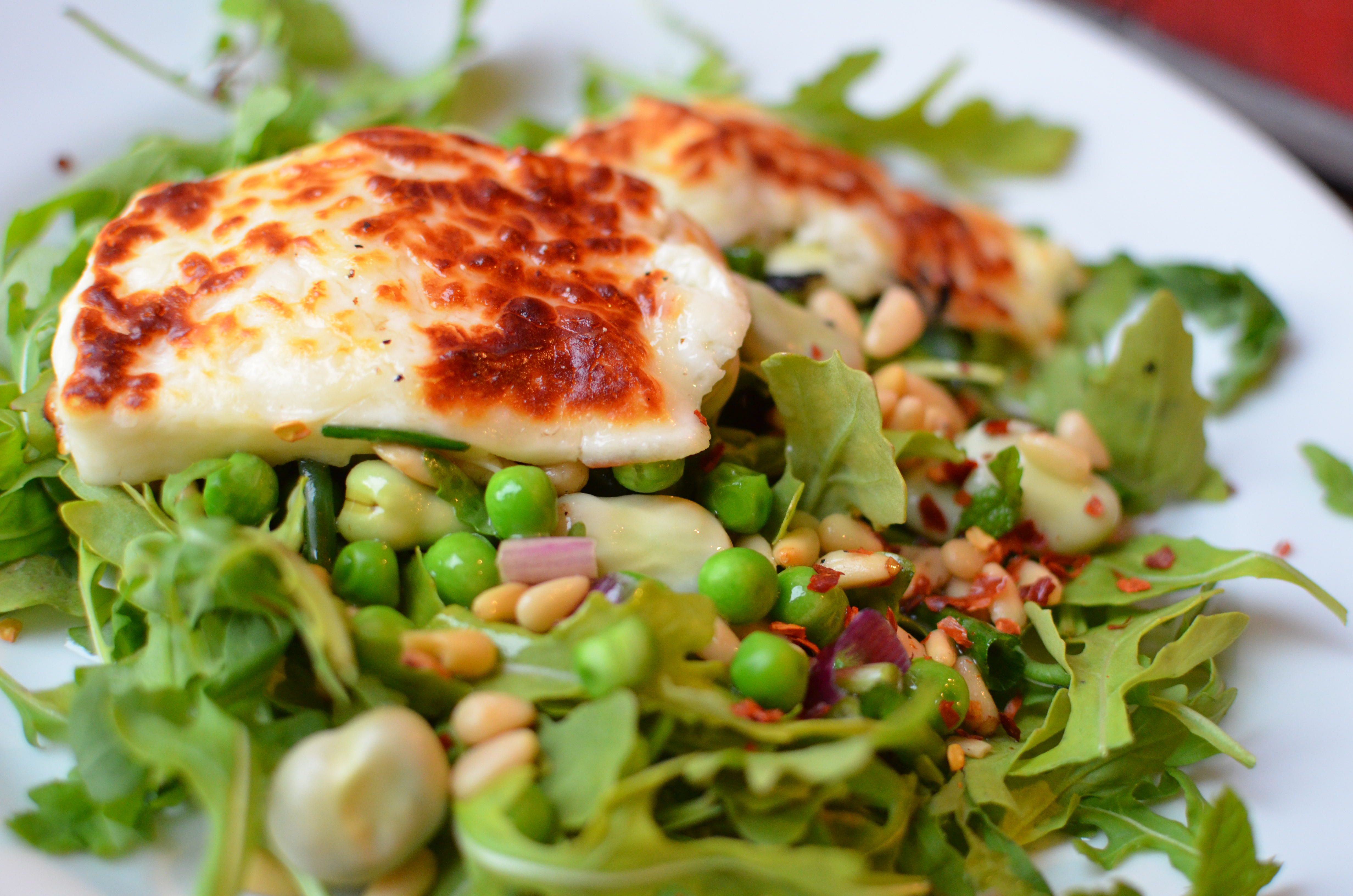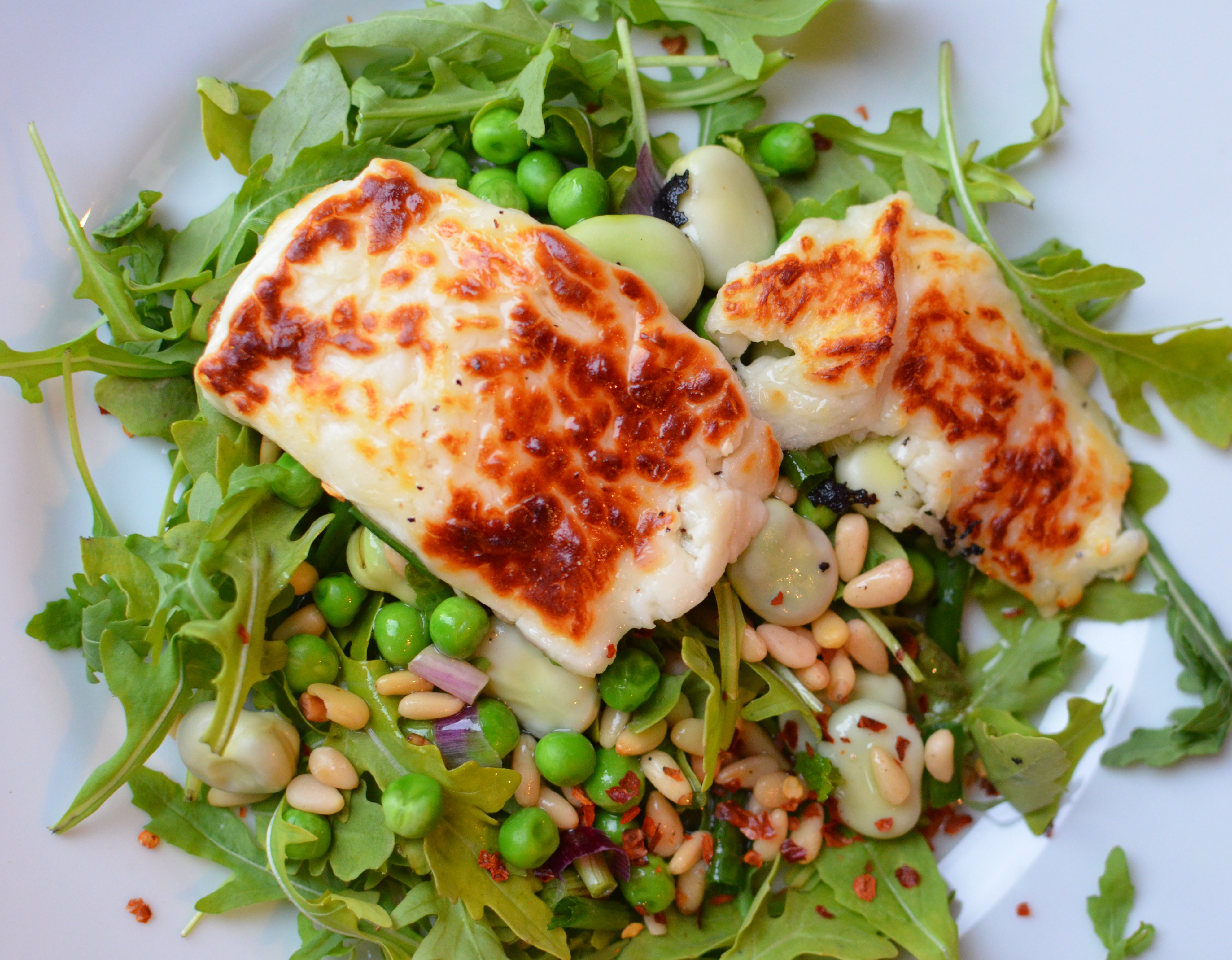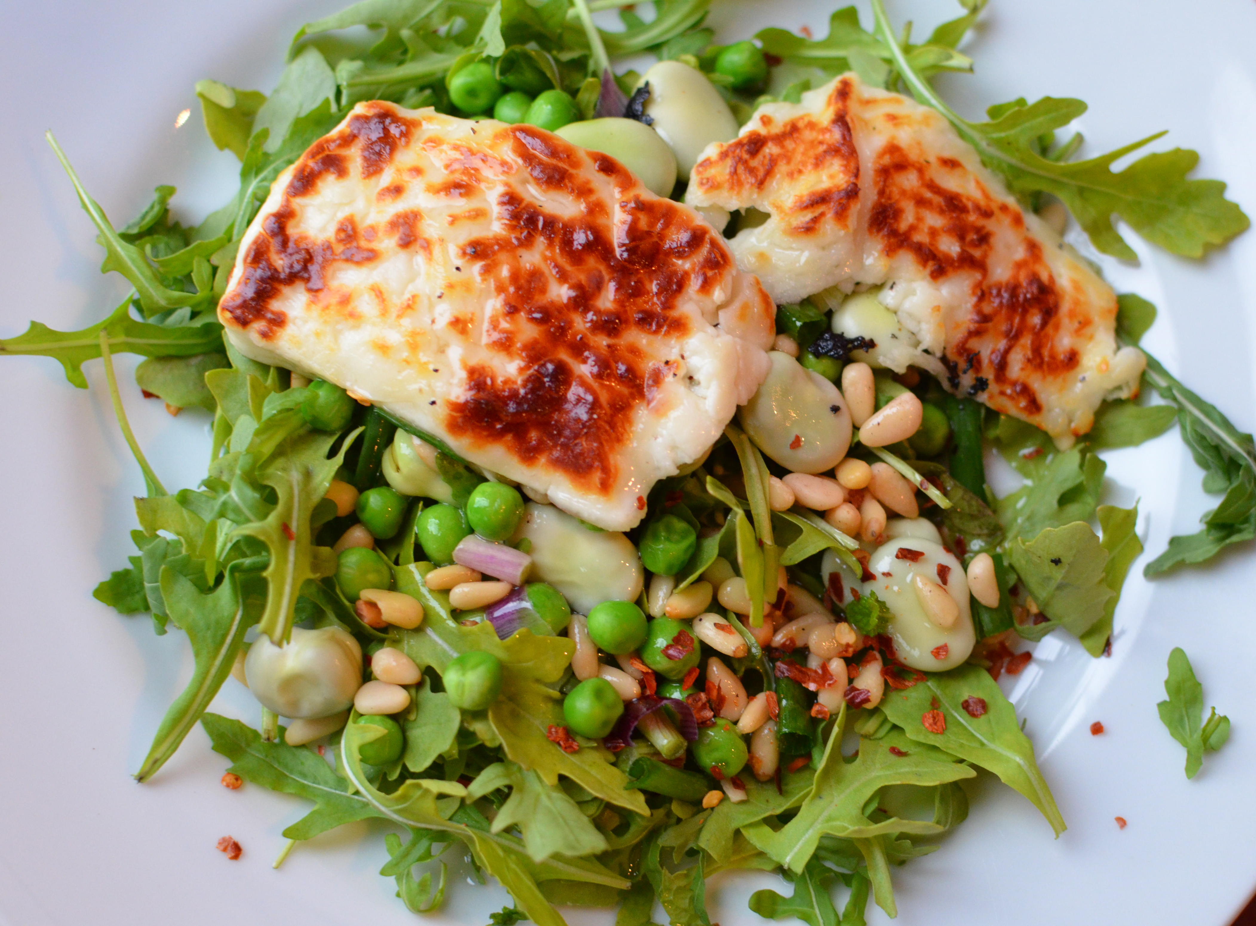 Grilled Halloumi With Peas, Pine Nuts, Broad Beans And Rocket