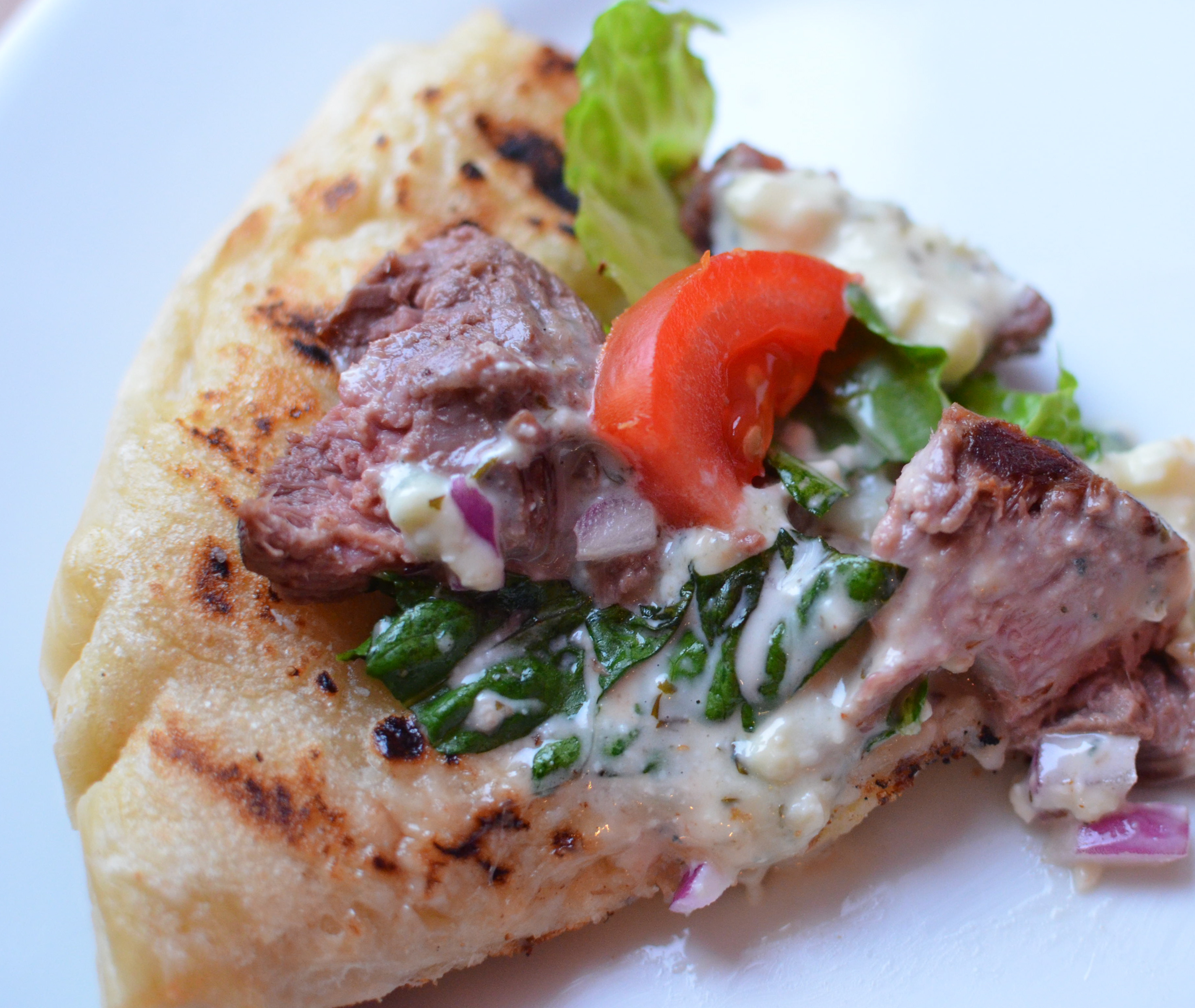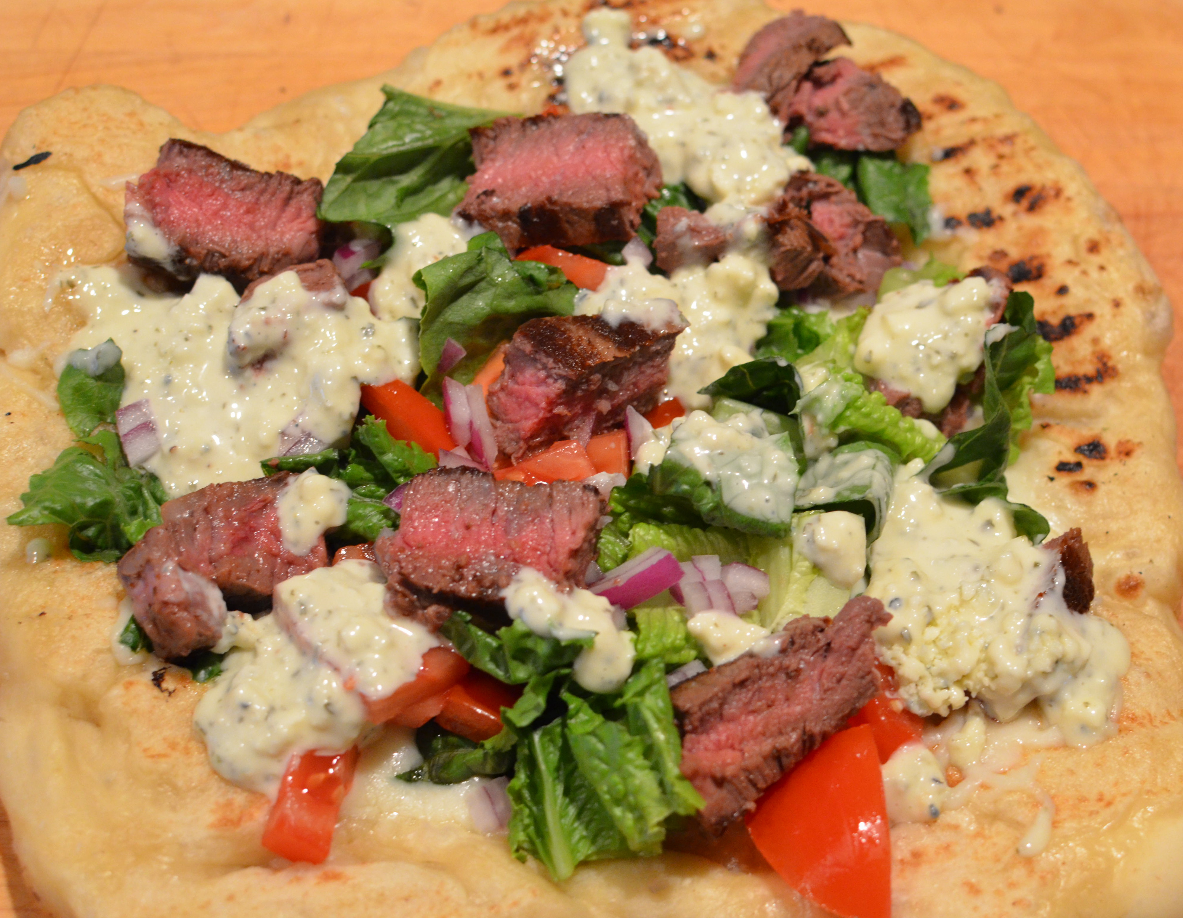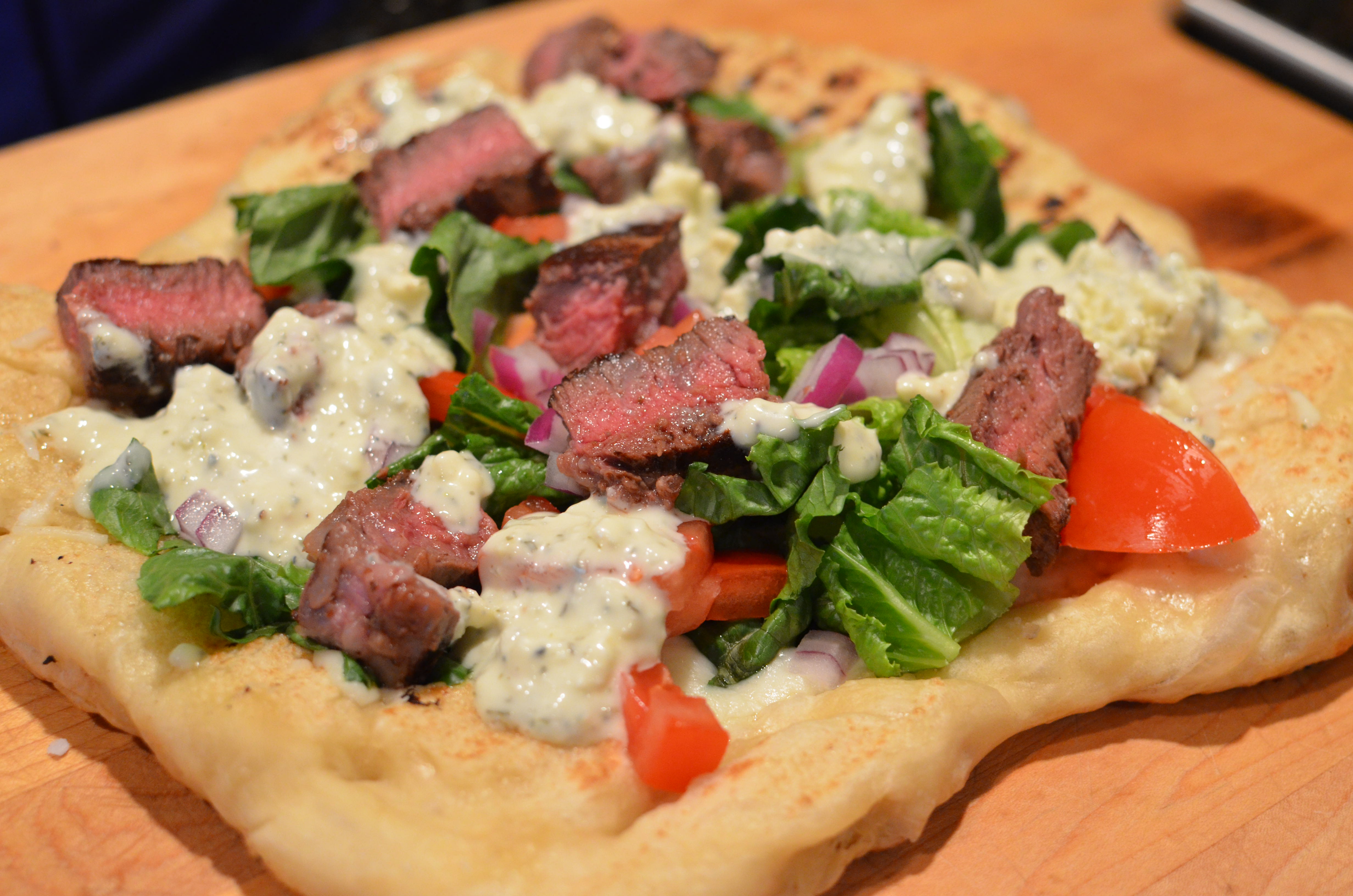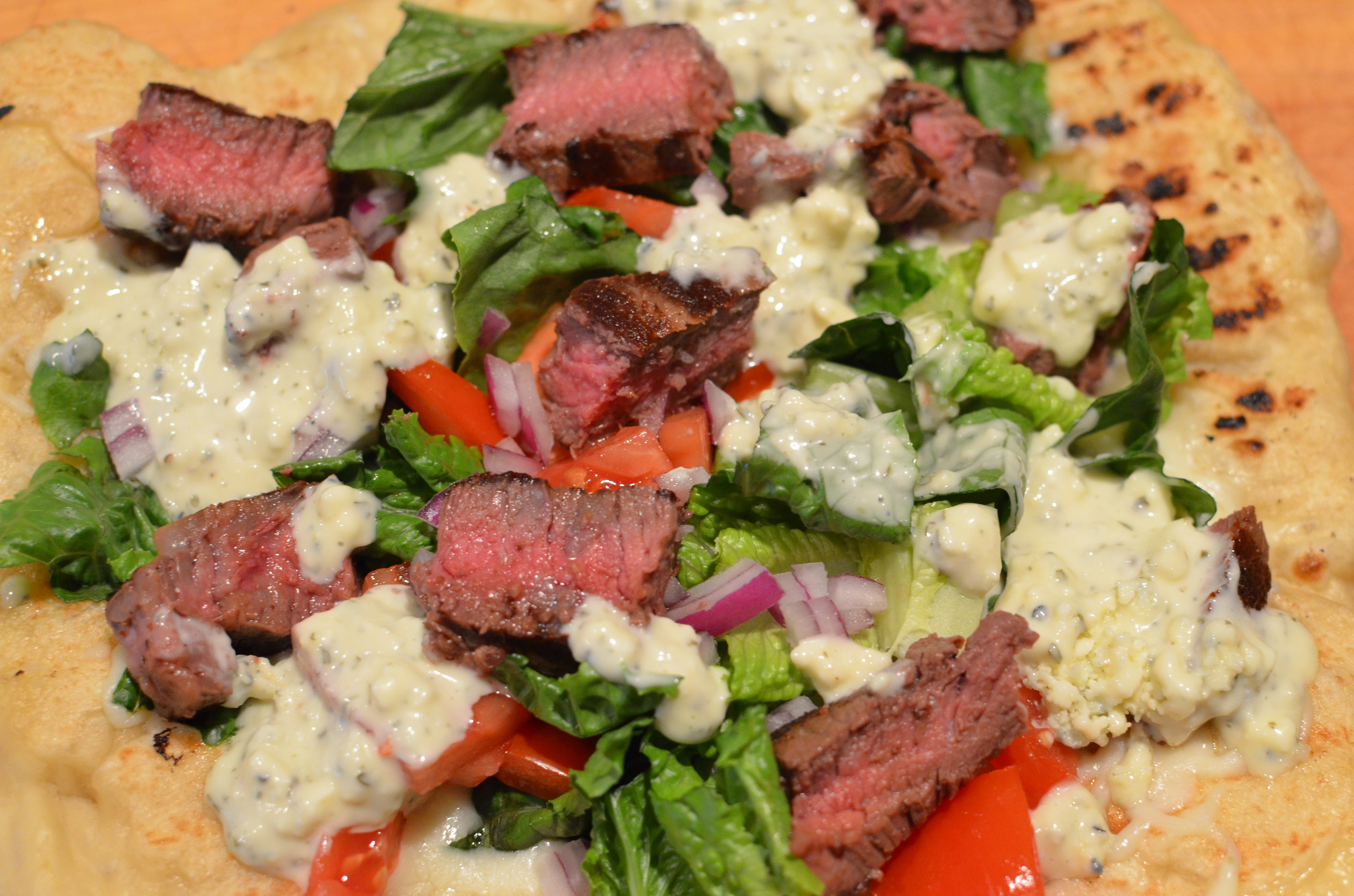 5. Top grilled dough with romaine, tomato, onion, and steak slices. Drizzle pizza with Chunky Blue Cheese Dressing.