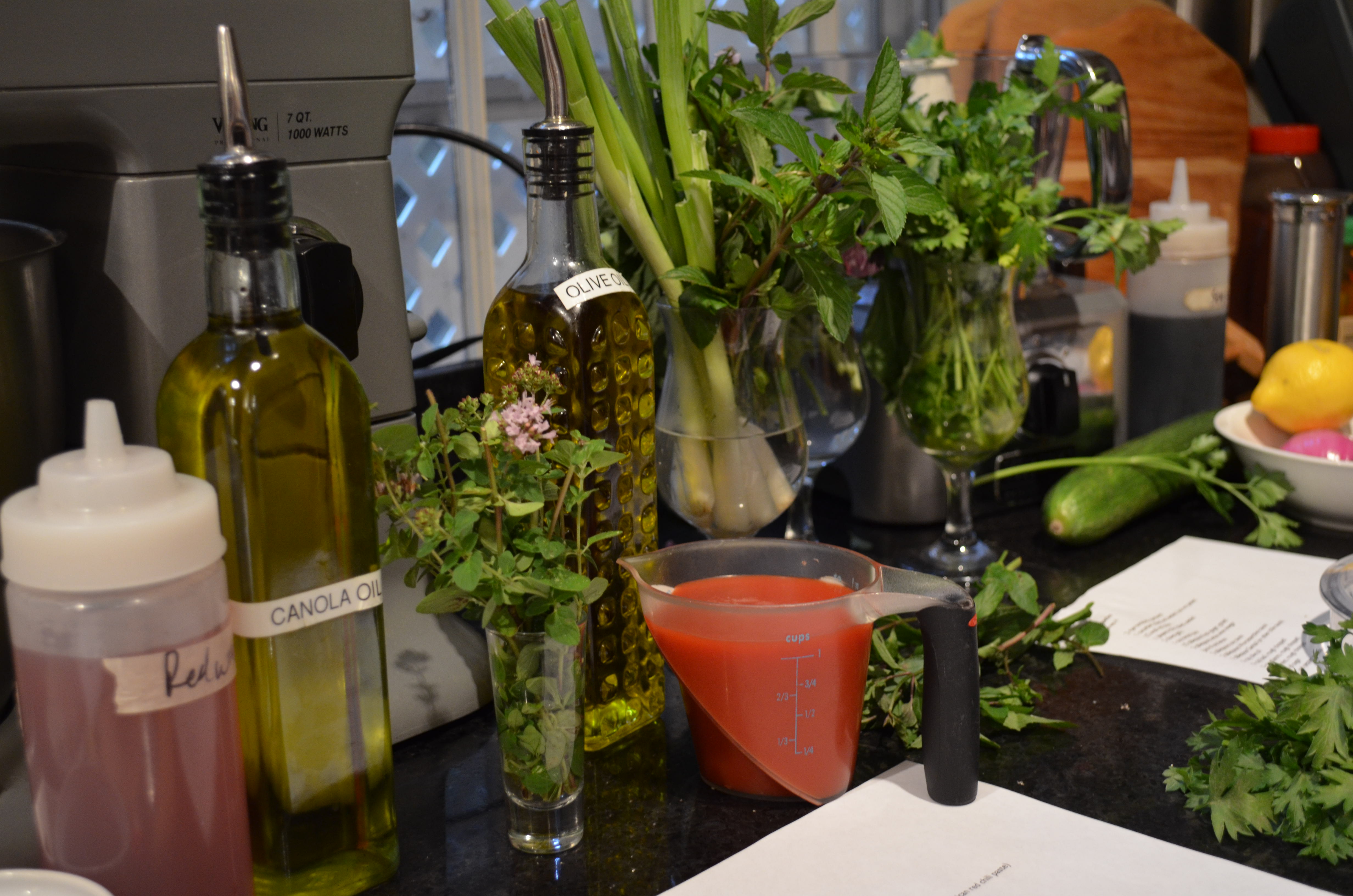 One of my favorite recipes of the class was for these Gazpacho Shooters. The presentation in the shot glasses is so cute and inviting. The balance of herbs, flavorings and vegetables is as perfect as you can get. It is Souper. Ha!