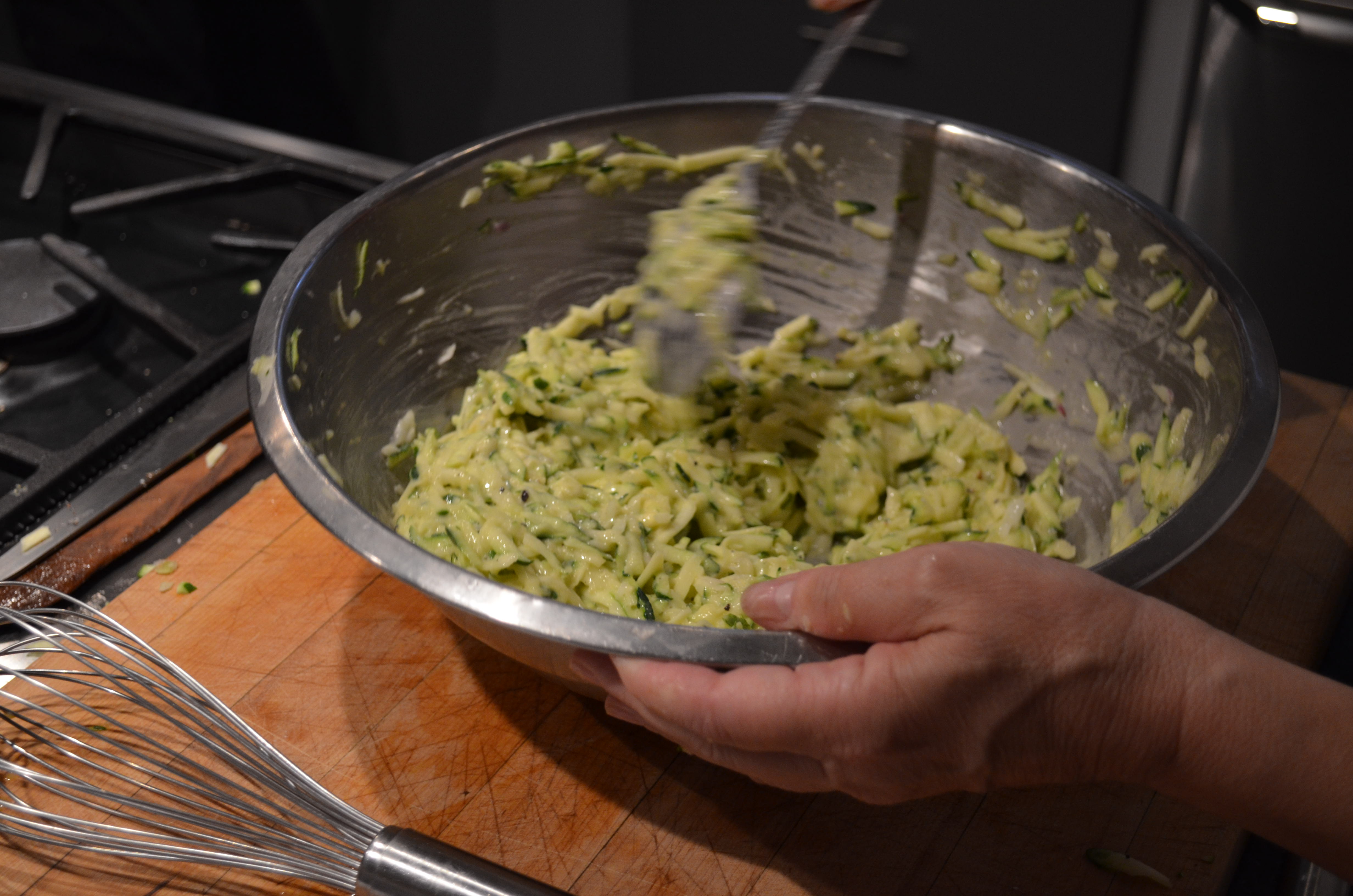 2. Coursely grate the zucchini. Squeeze in a colander to remove excess liquid. Stir in onion and eggs.