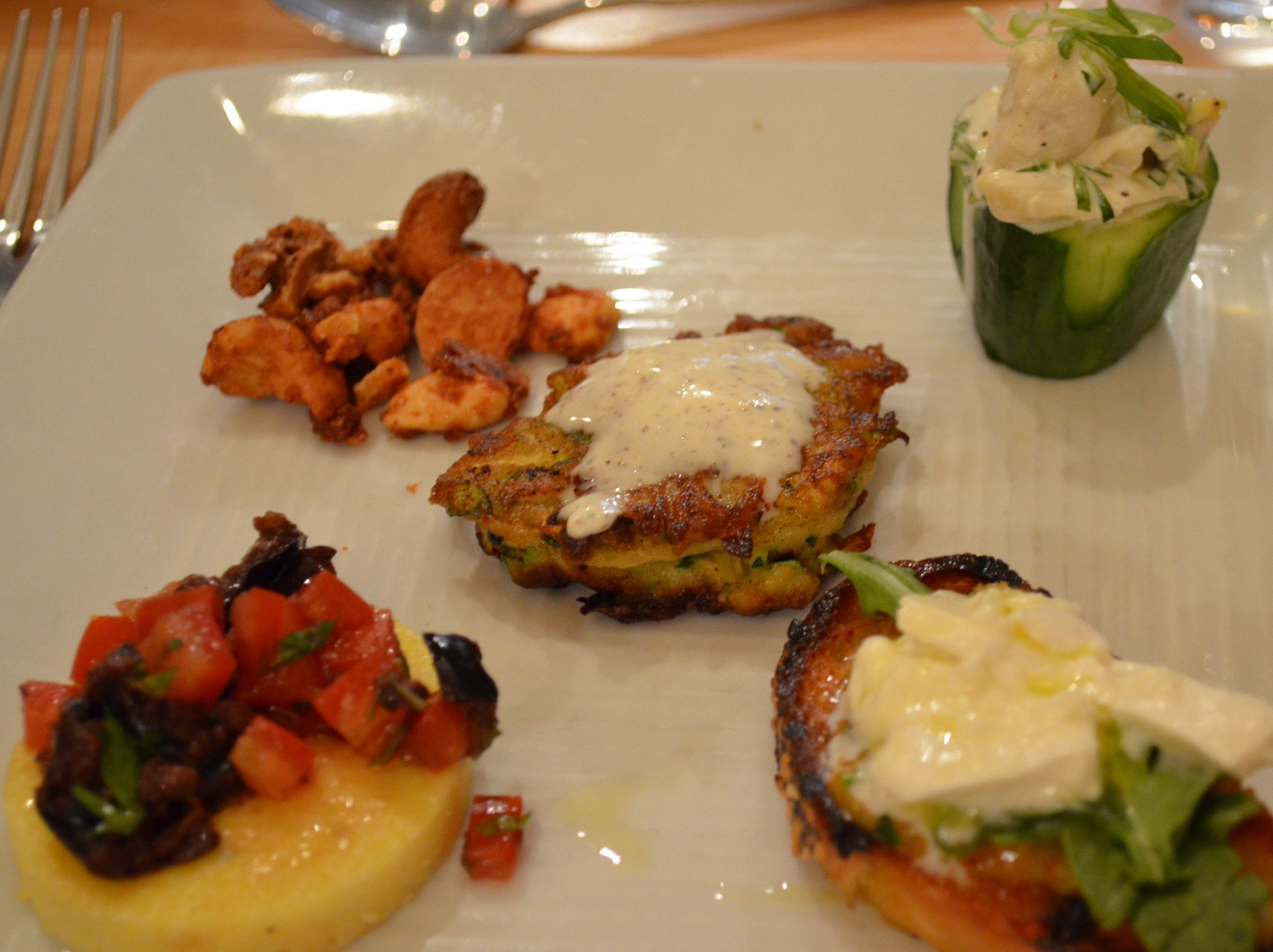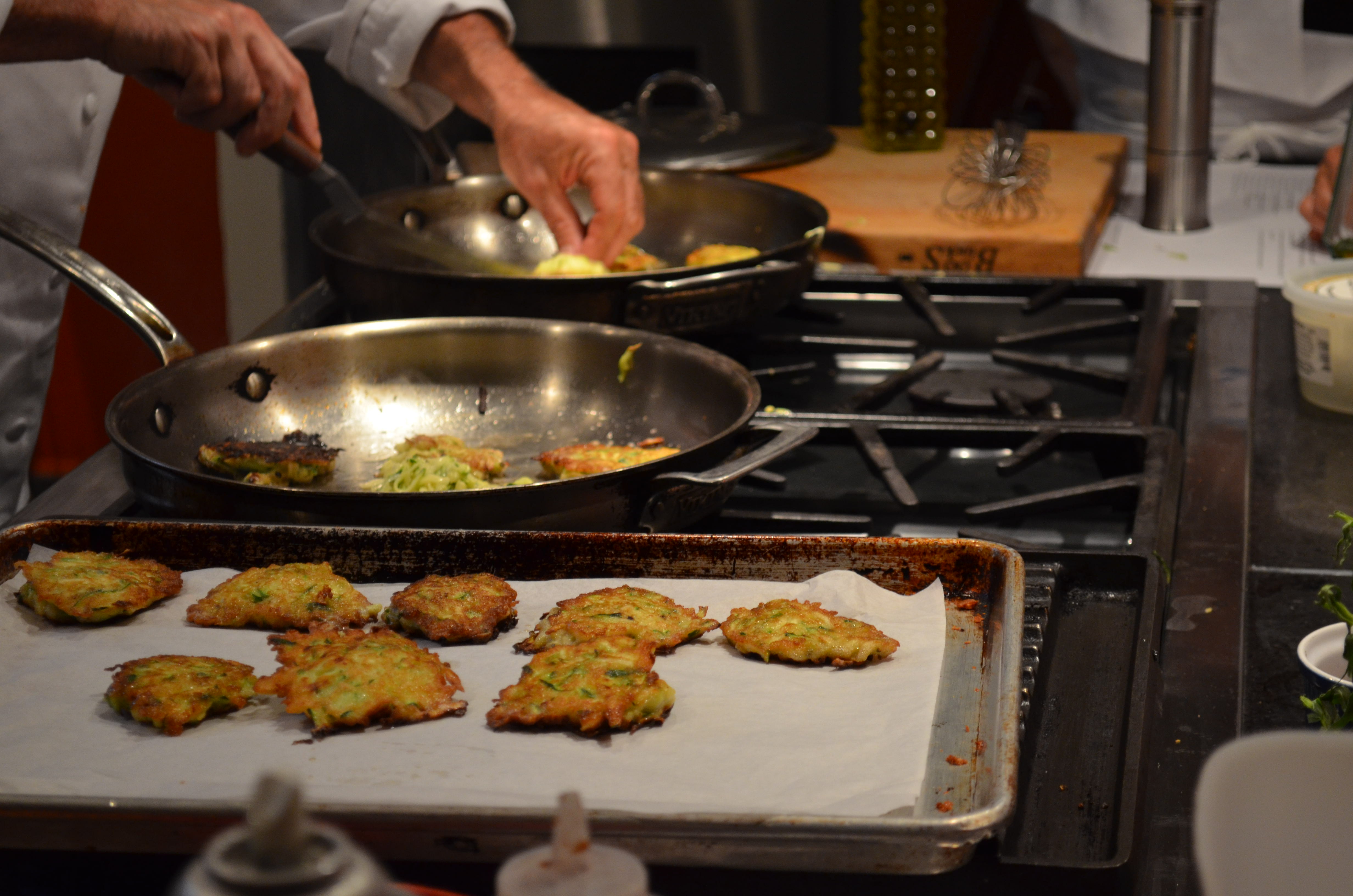 We’ll start with the Zucchini Pancakes With Za’atar Crème Frâiche.