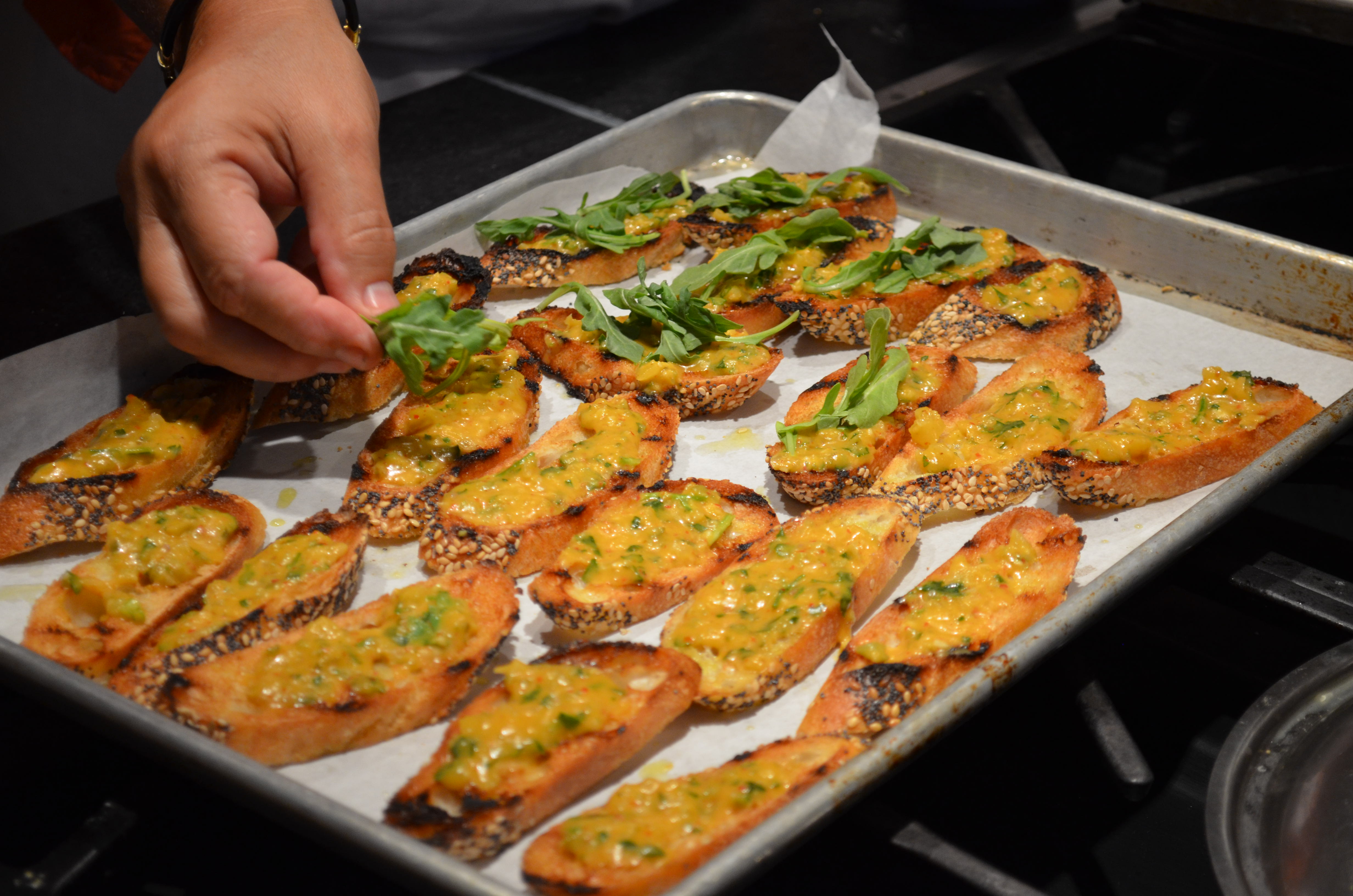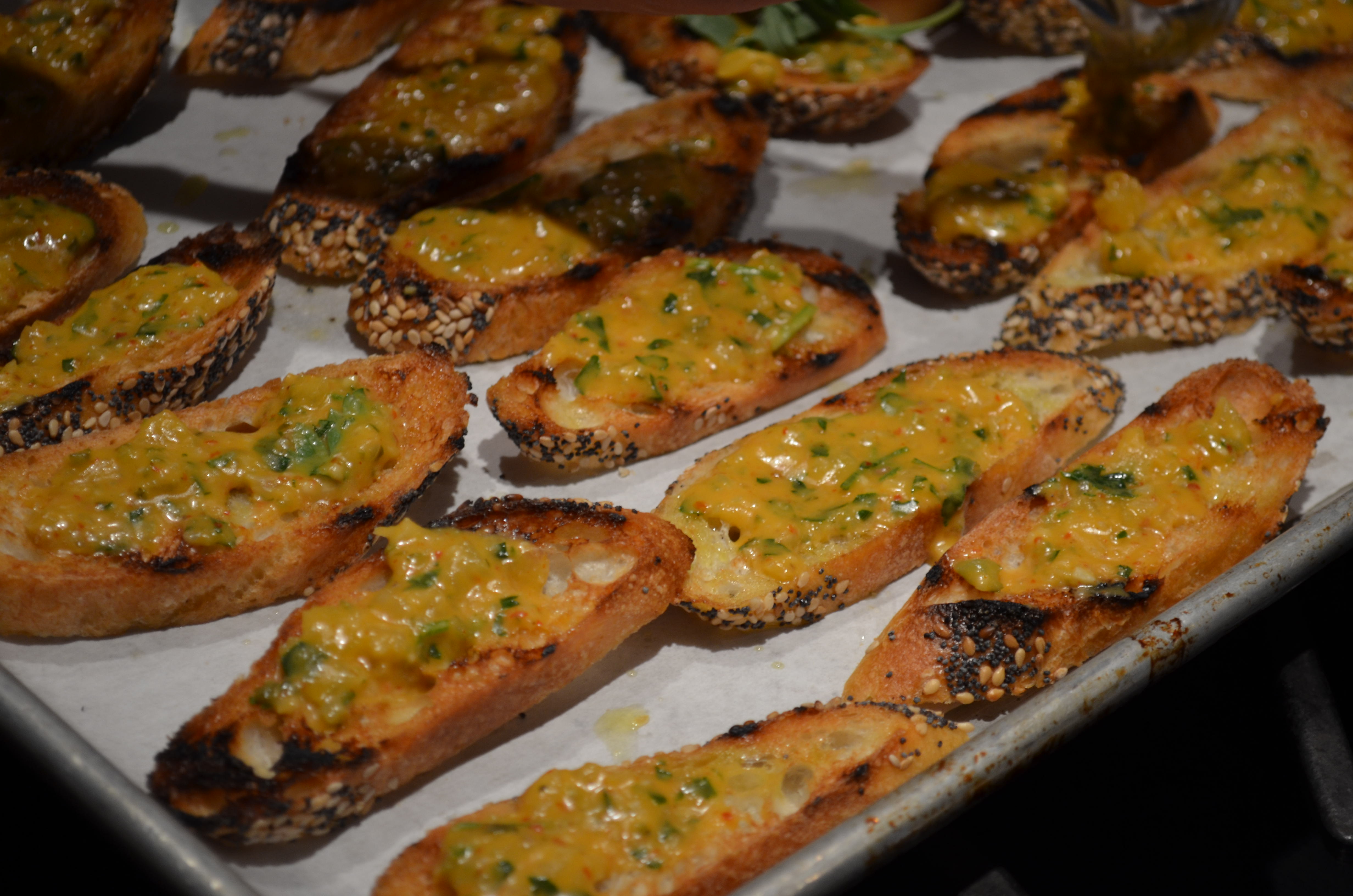 Preserved Lemon Spread On Grilled Baguette Slices With Arugula And Burrata Cheese