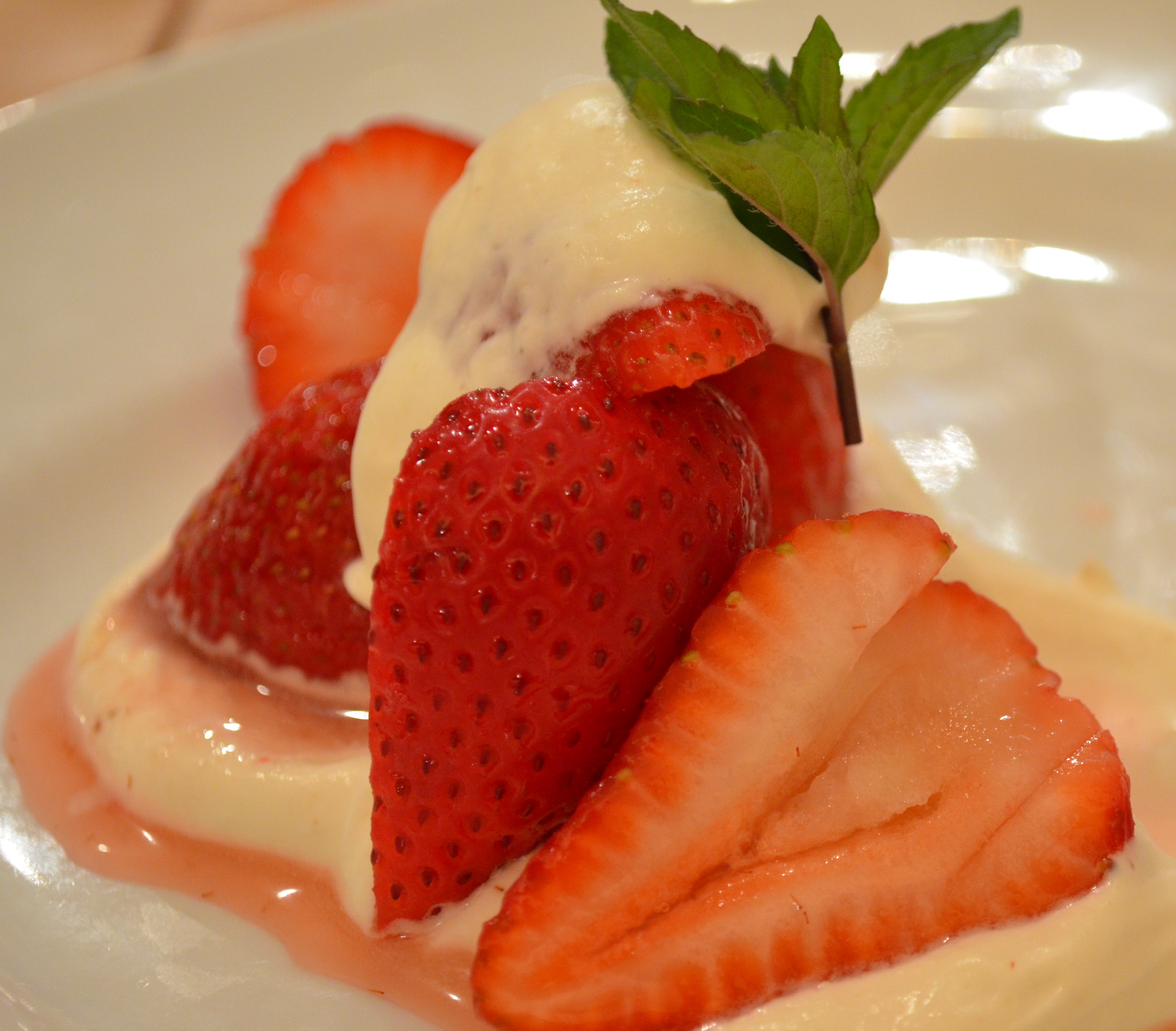 3. Serve in chilled parfait glasses or smoothed across dessert plates, accompanied by strawberries and a sprig of mint.