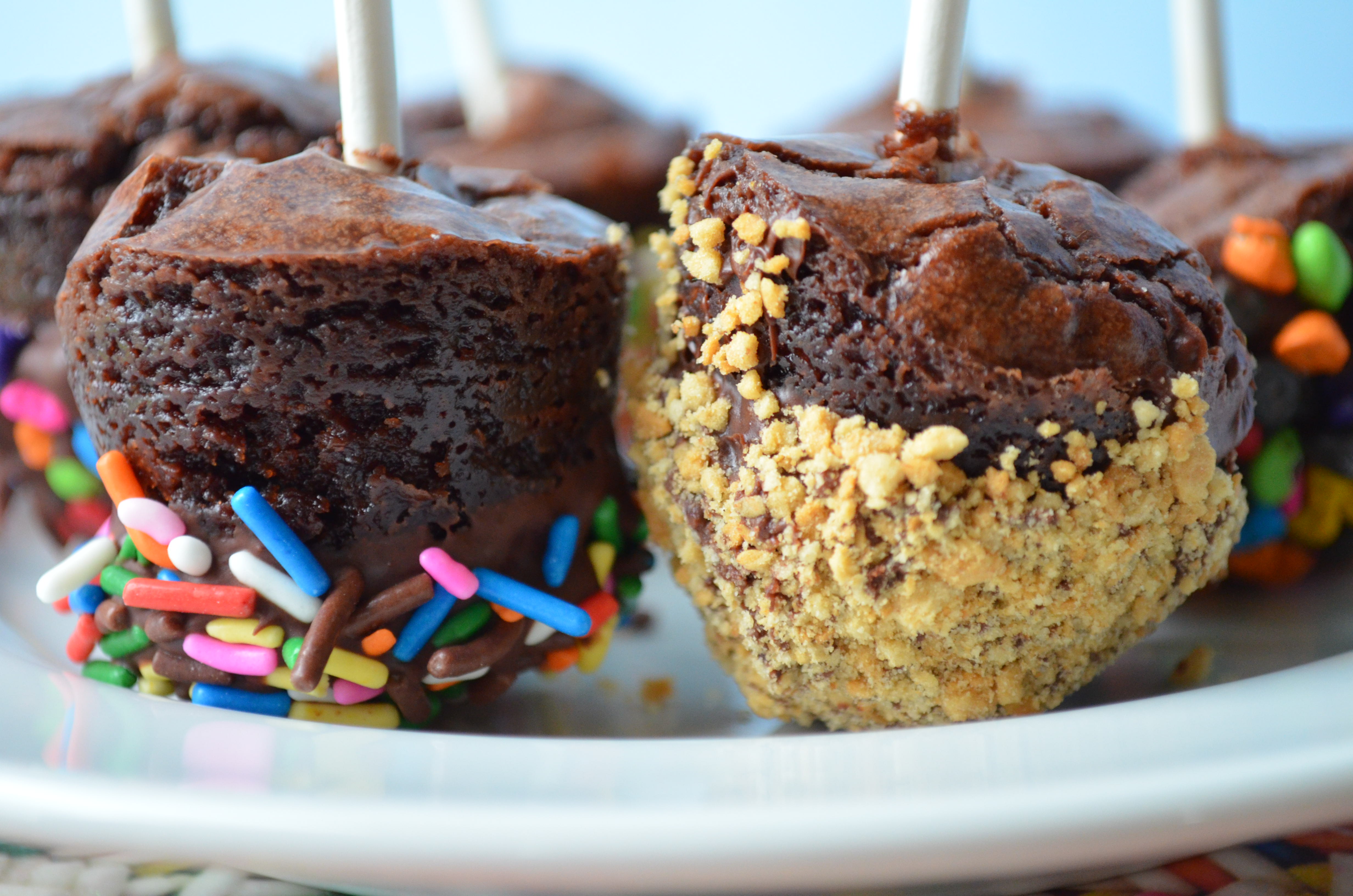 8. Melt chocolate. Dip brownie pop in chocolate and then roll in your choice of topping.