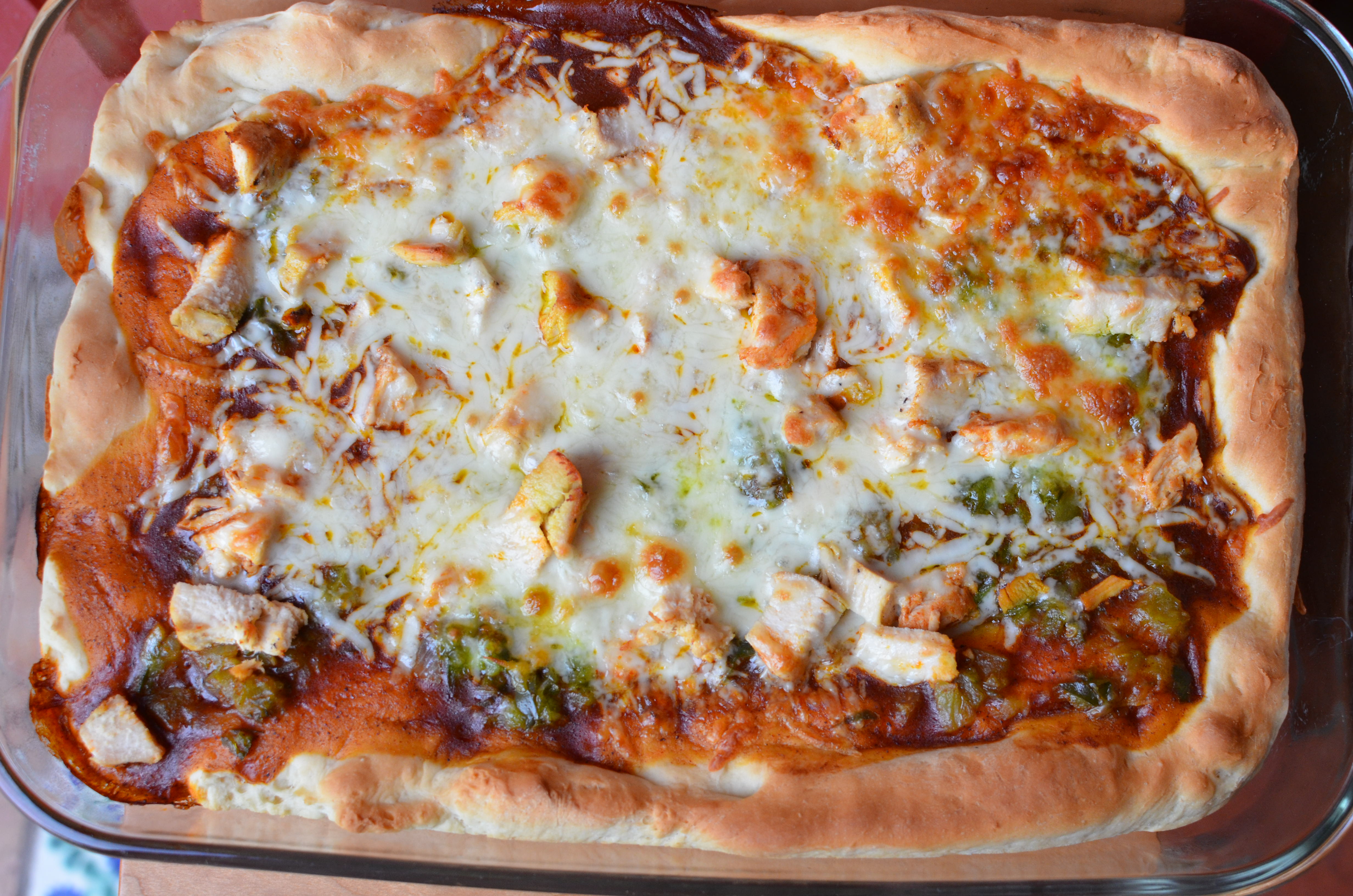 I used an old stand-by favorite pizza dough recipe which is very quick and easy to make. It is a thicker crust, which I like now and again. The Chicken Enchilada Pizza would be very good on top of a thin crust, too.