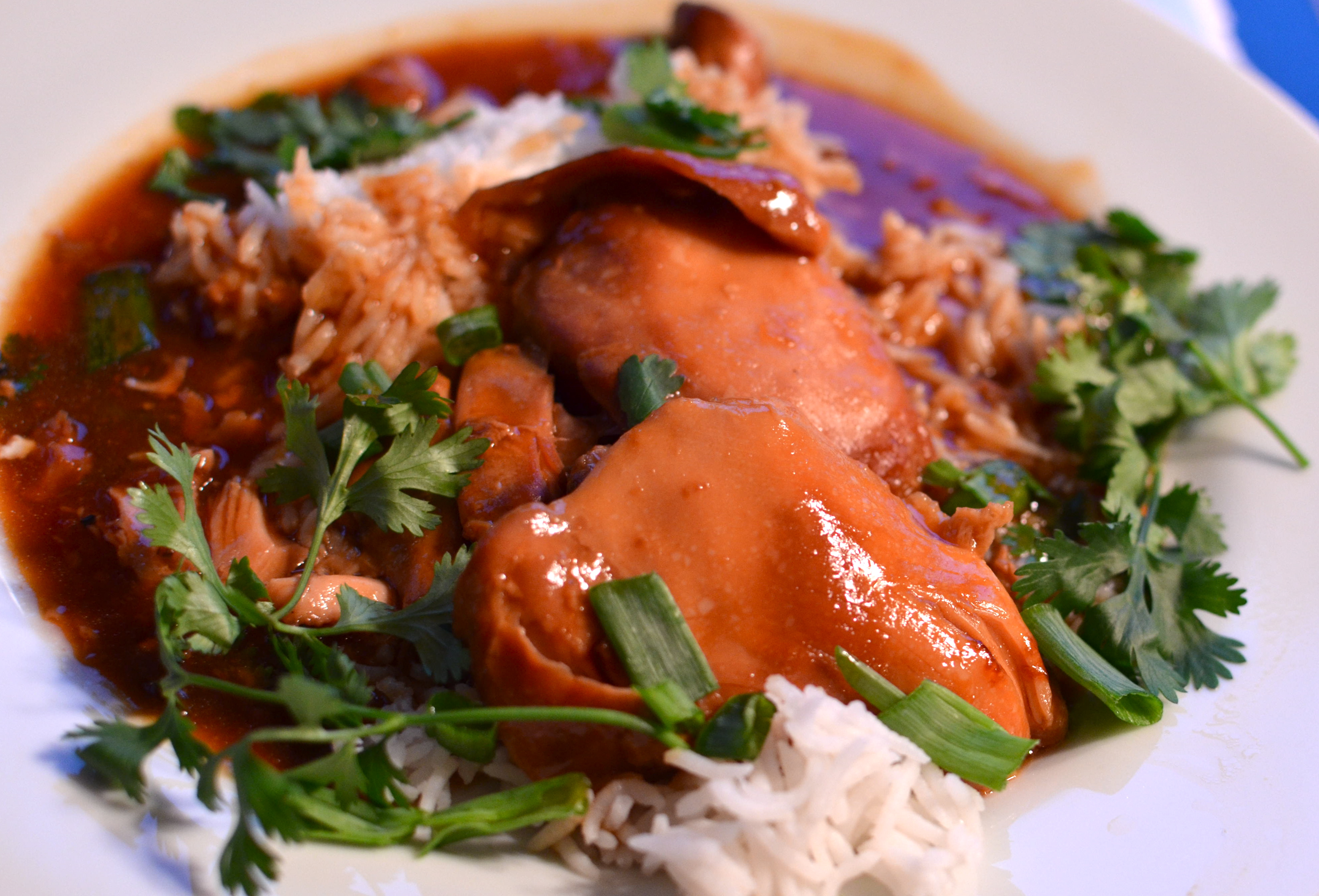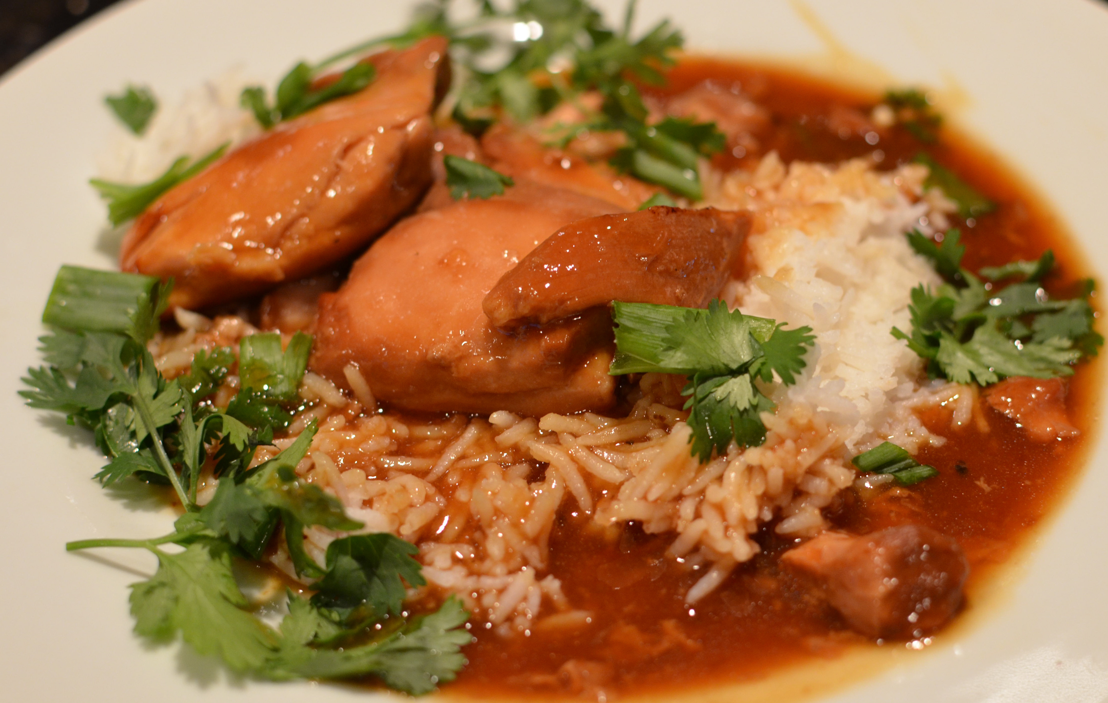 4. Skim fat from cooking liquid. Place liquid in a saucepan and bring to a boil. Combine cornstarch and water until smooth. Gradually stir into liquid and stir until sauce is thickend. Serve with chicken and rice. Scatter over the green onions and cilantro.