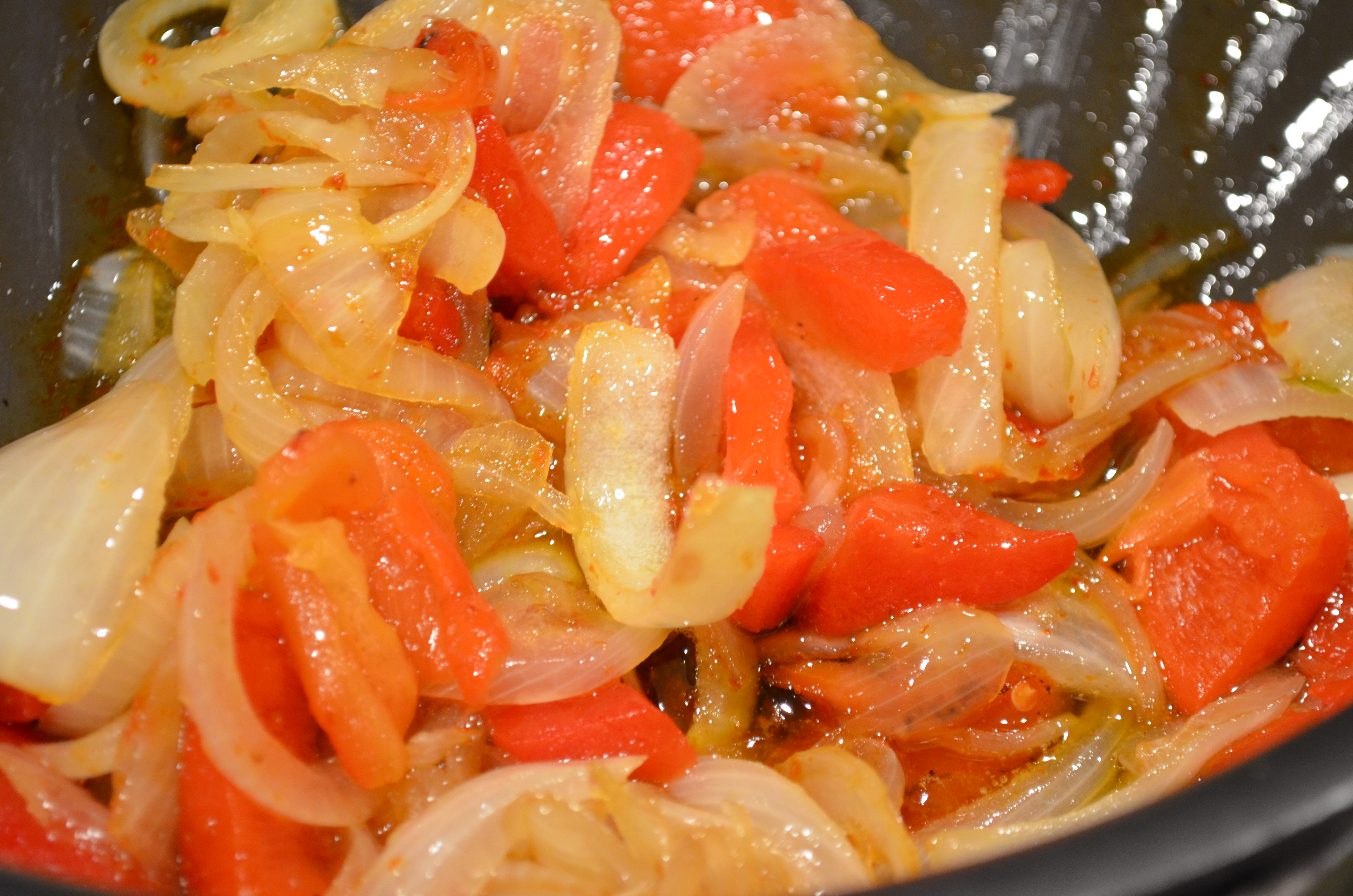 4. Add the brown sugar, pepper and harissa into the onions. Cook for 1 minute until the sugar has melted.