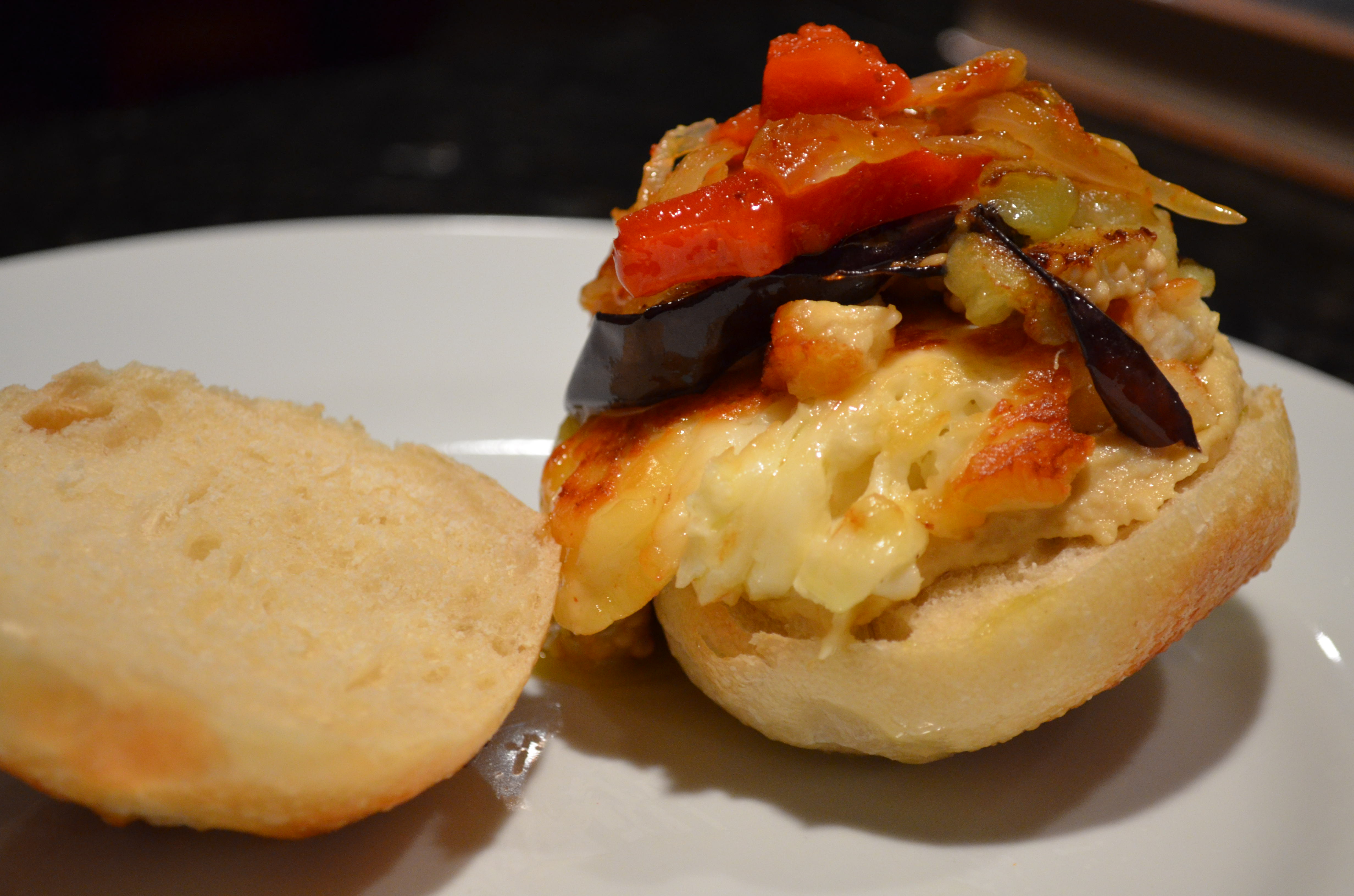 5. While the relish is cooking, spread the rolls with hummus and top with halloumi and aubergine slices. Spoon the harissa relish over and serve.