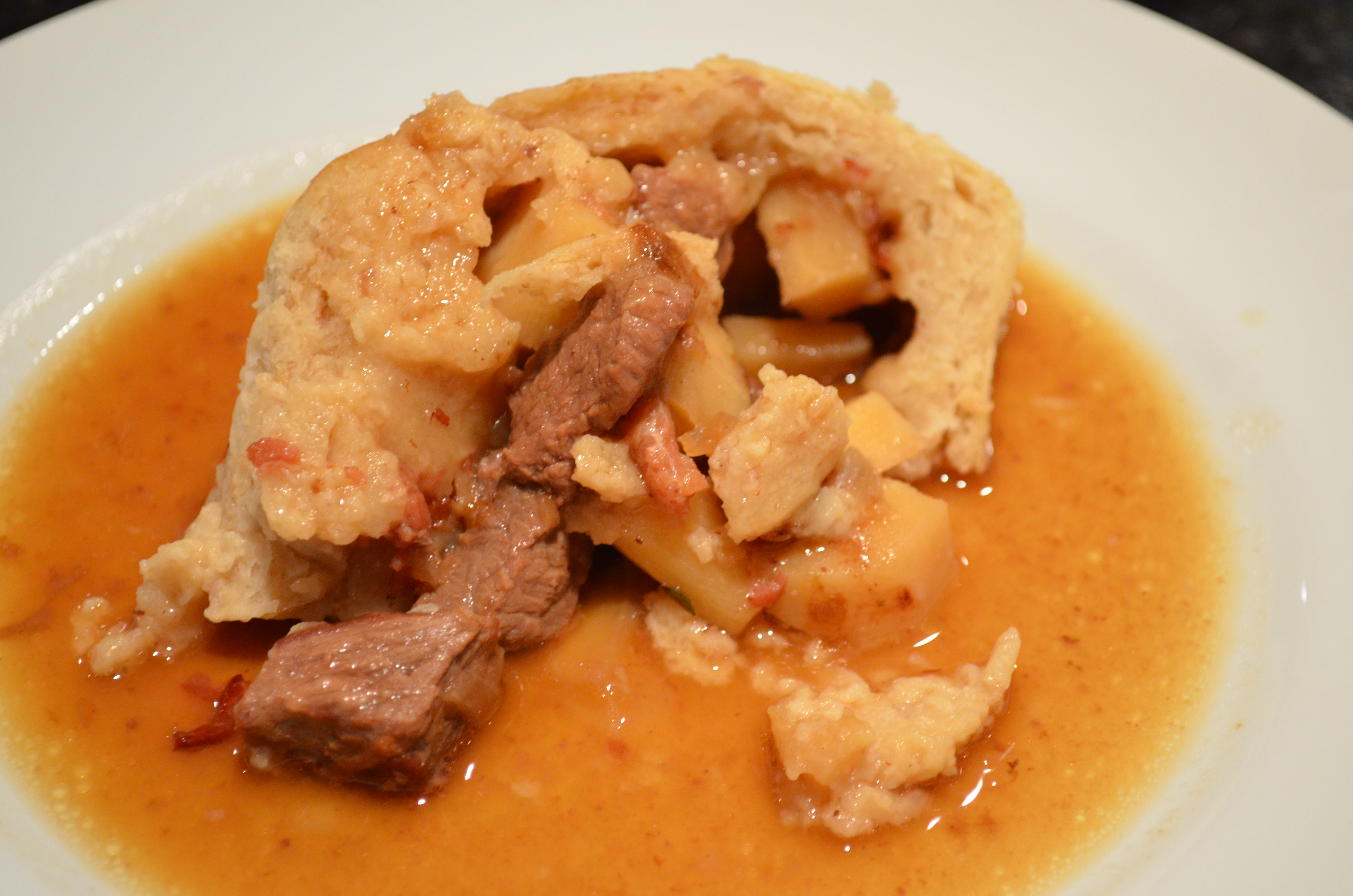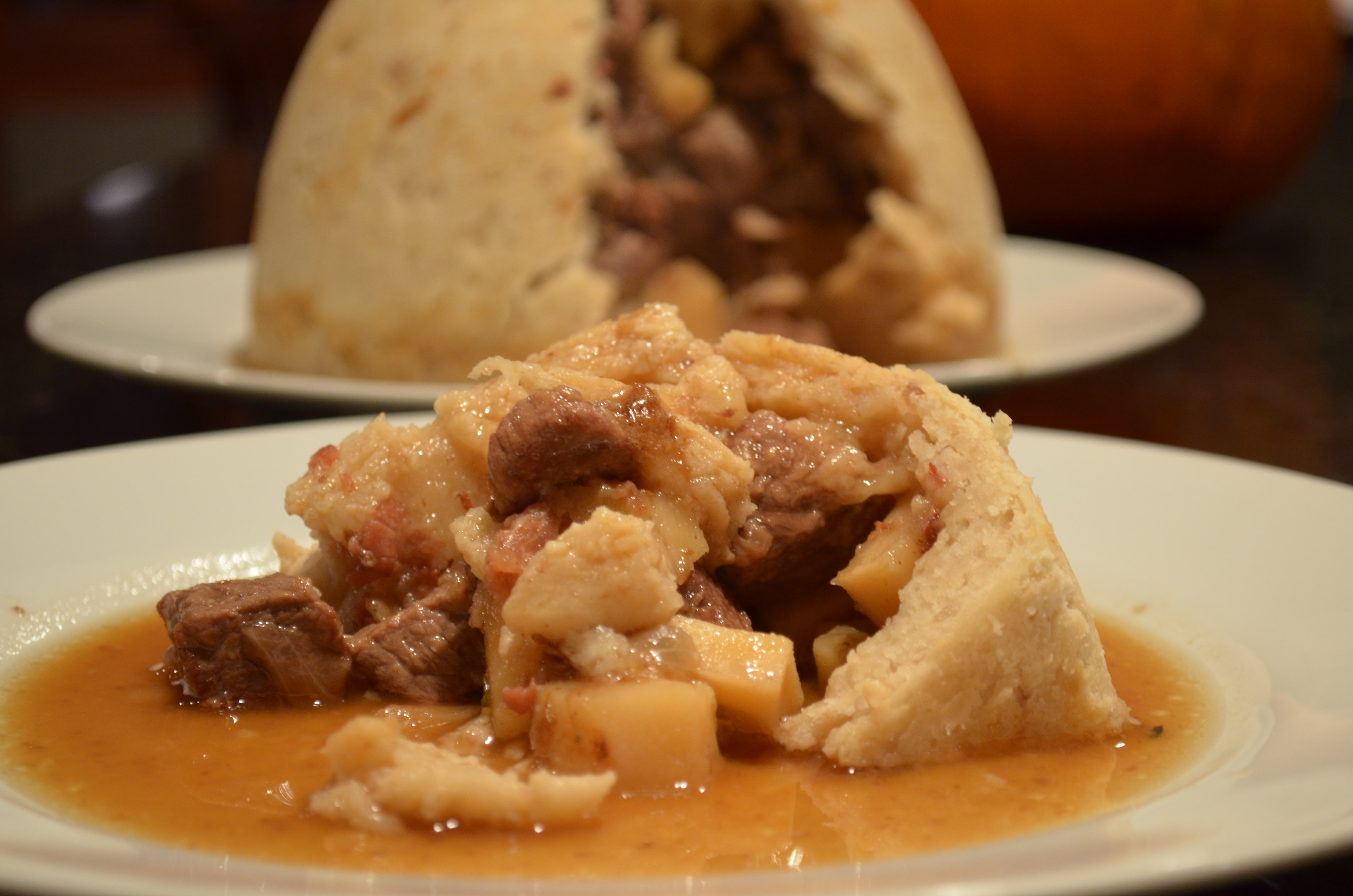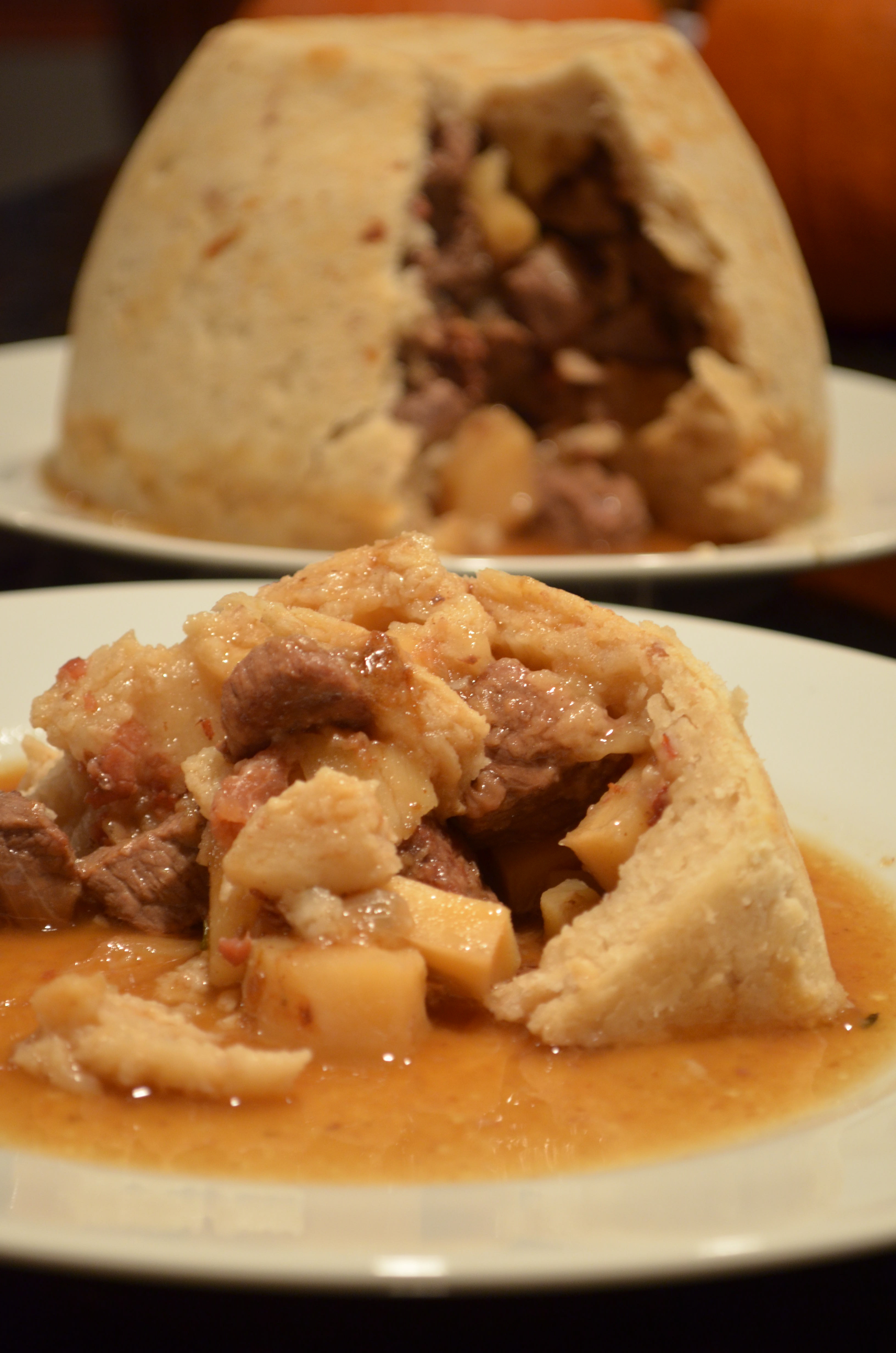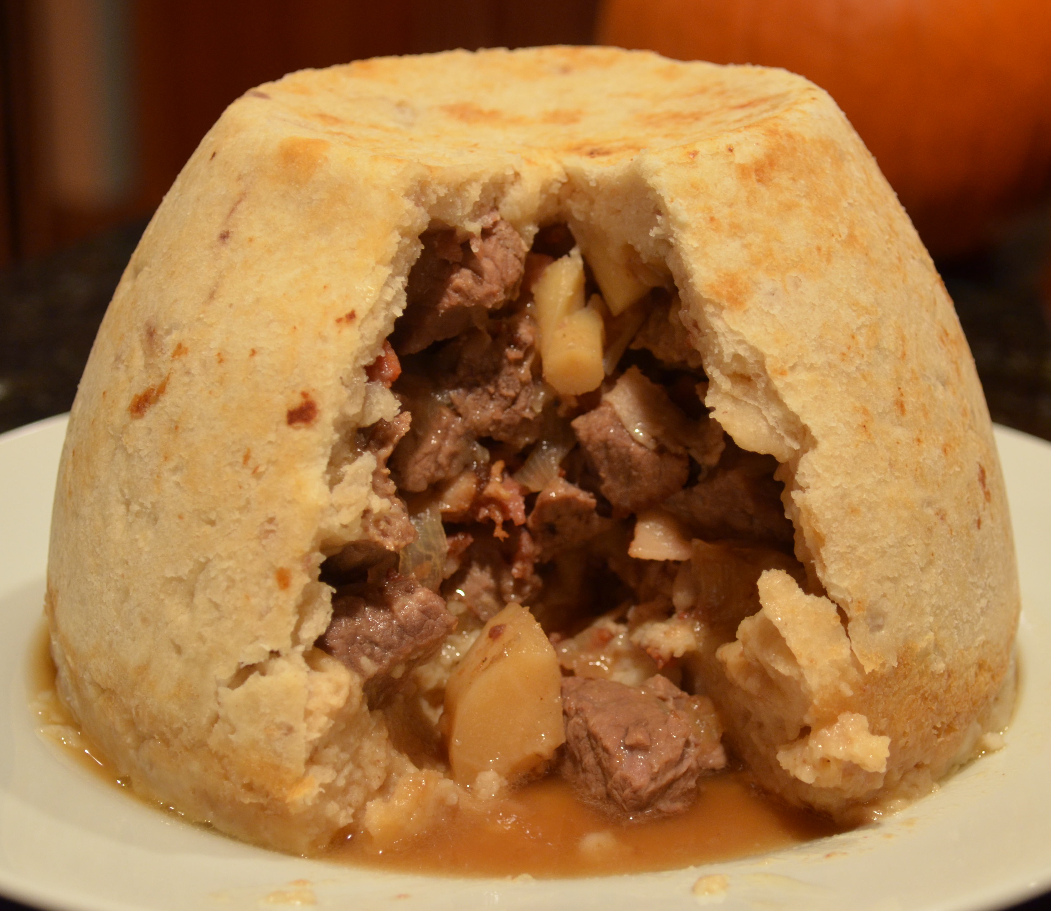 Basically, a really flavorful stew steamed inside a suet pastry.