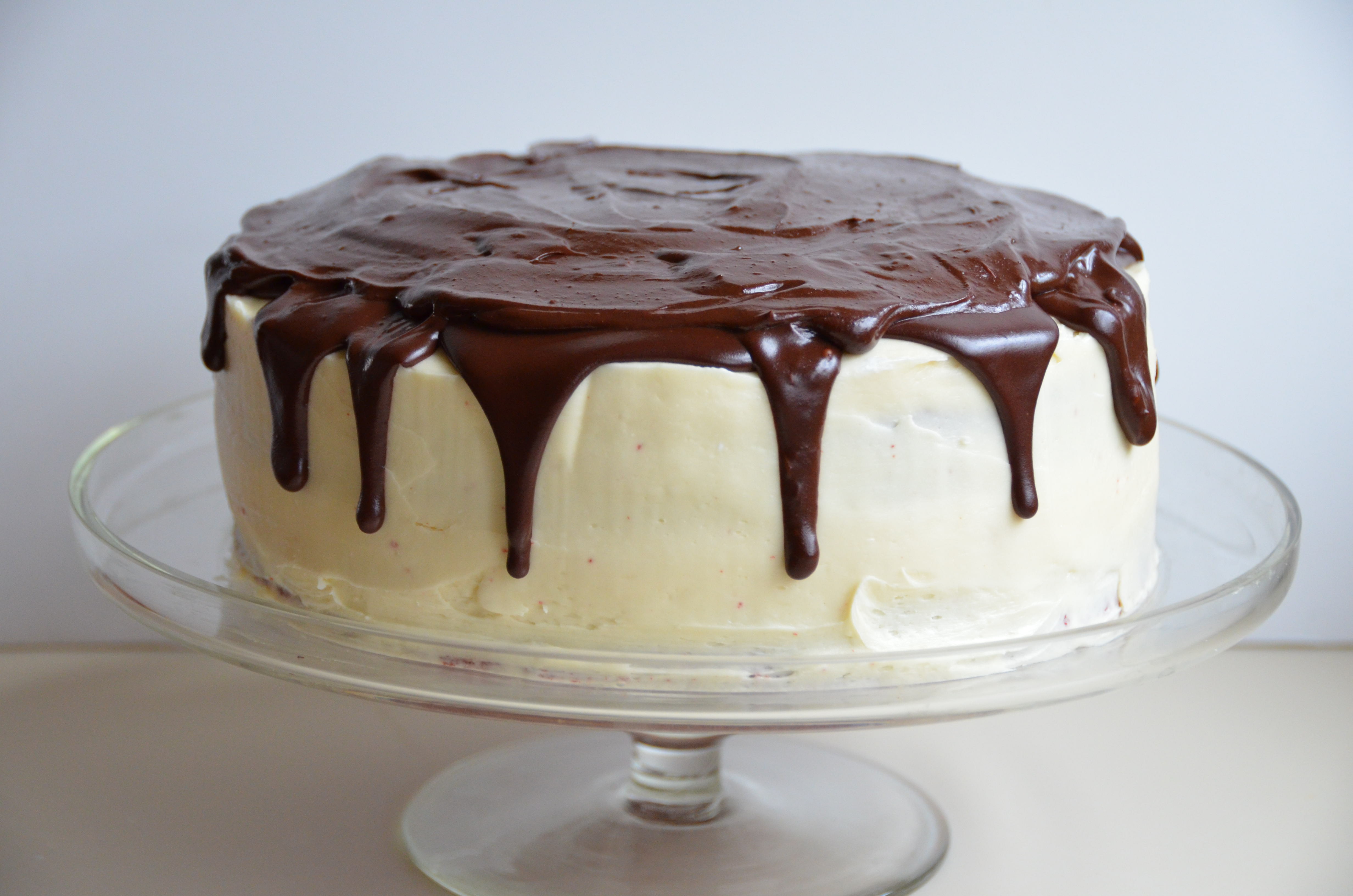 6. Drizzle chocolate ganache over the top of the cake and allow to drip down the sides. (I find this is a lot harder to do than it sounds. If you work too quickly it can be a messy glop down the sides instead of an attractive drip.)