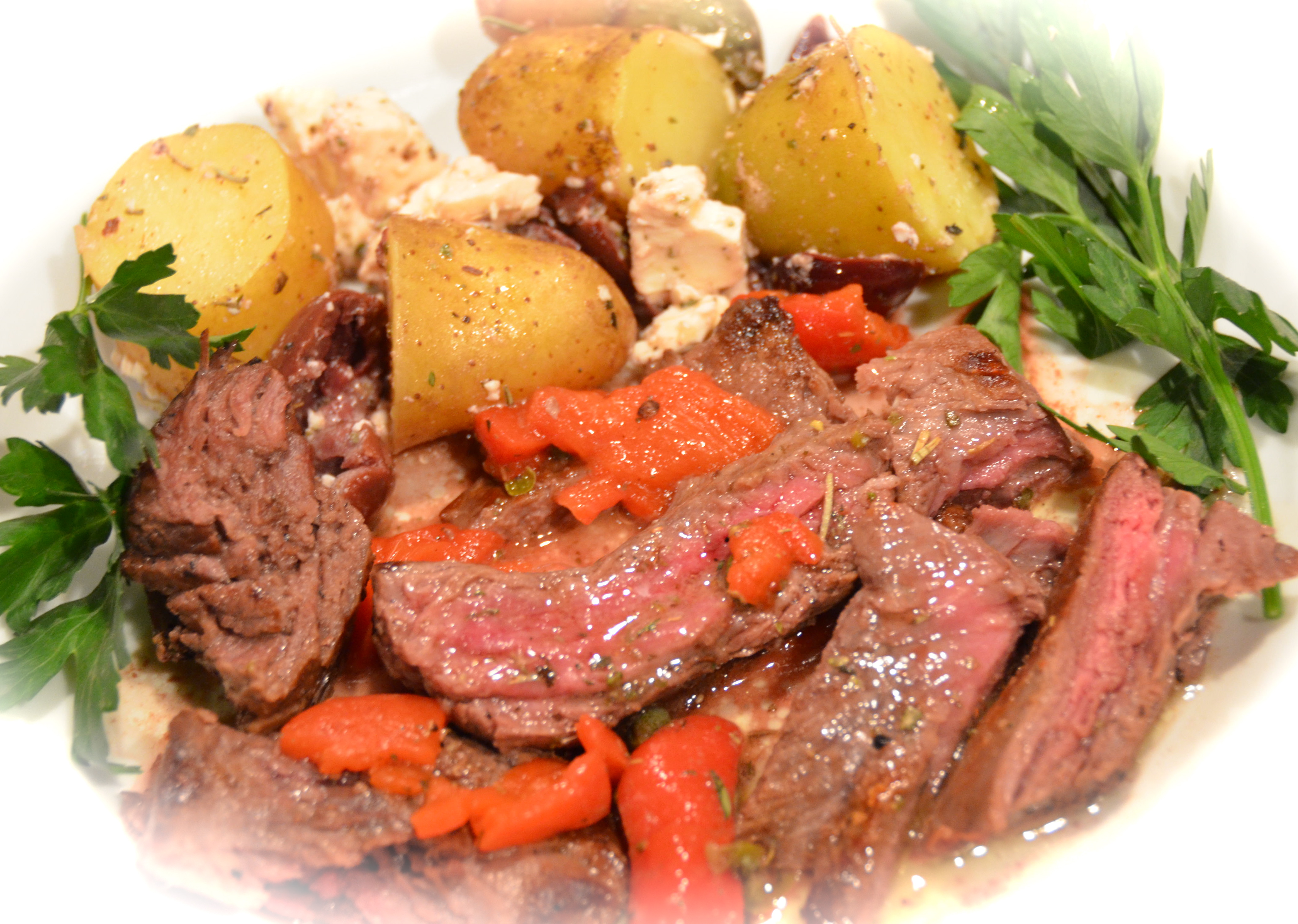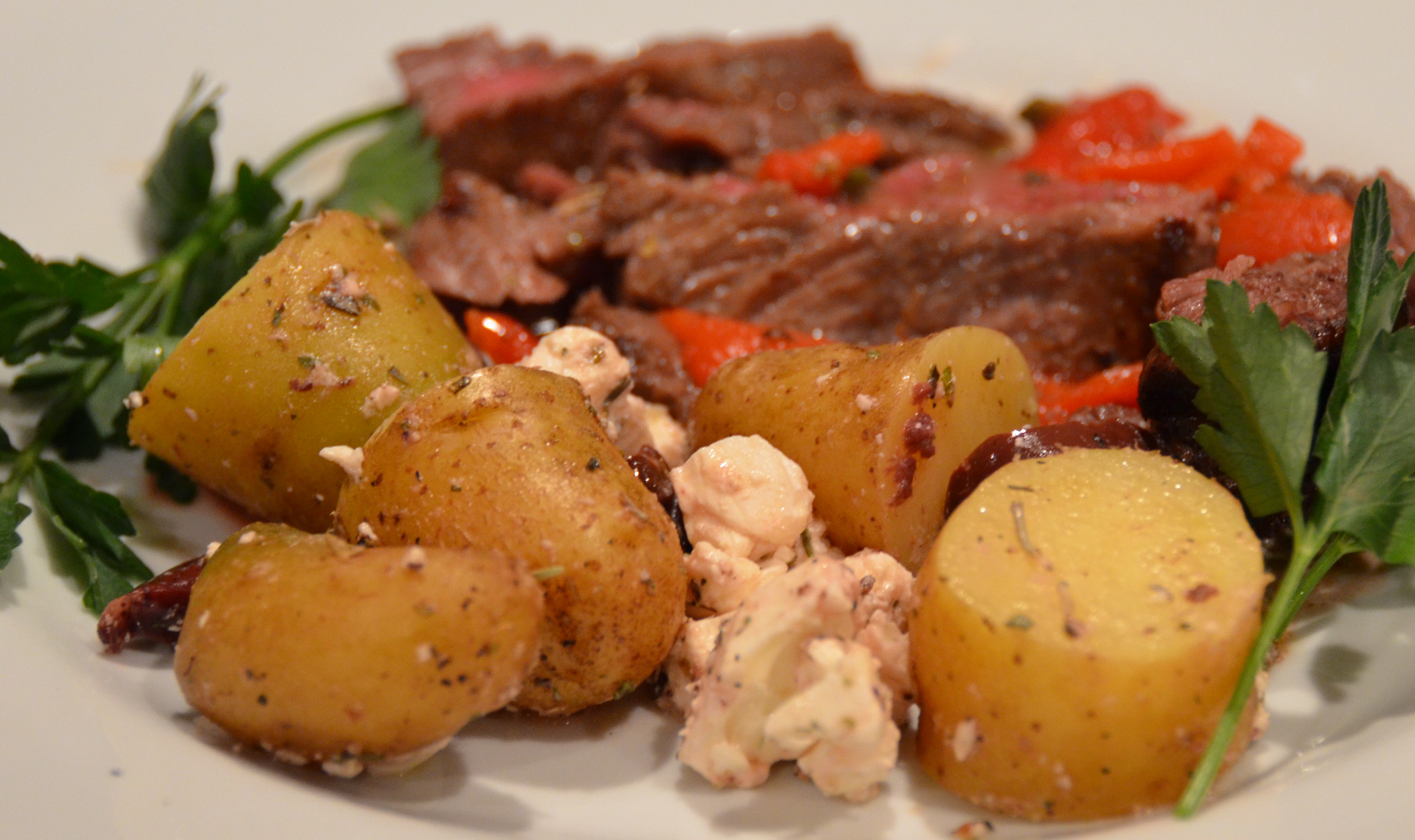 It’s Provençal butter melting into tender, grilled beef nestled up to lemony, tender potatoes tossed with salty olives and feta.